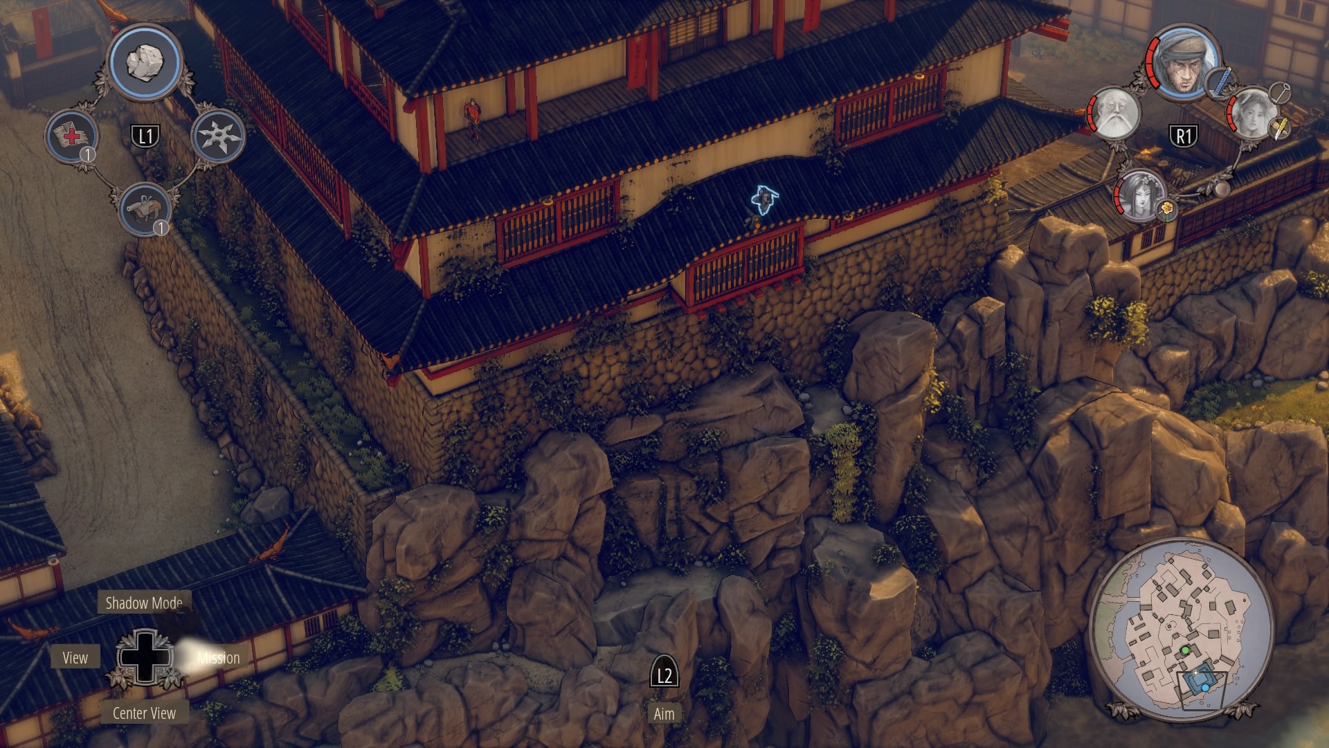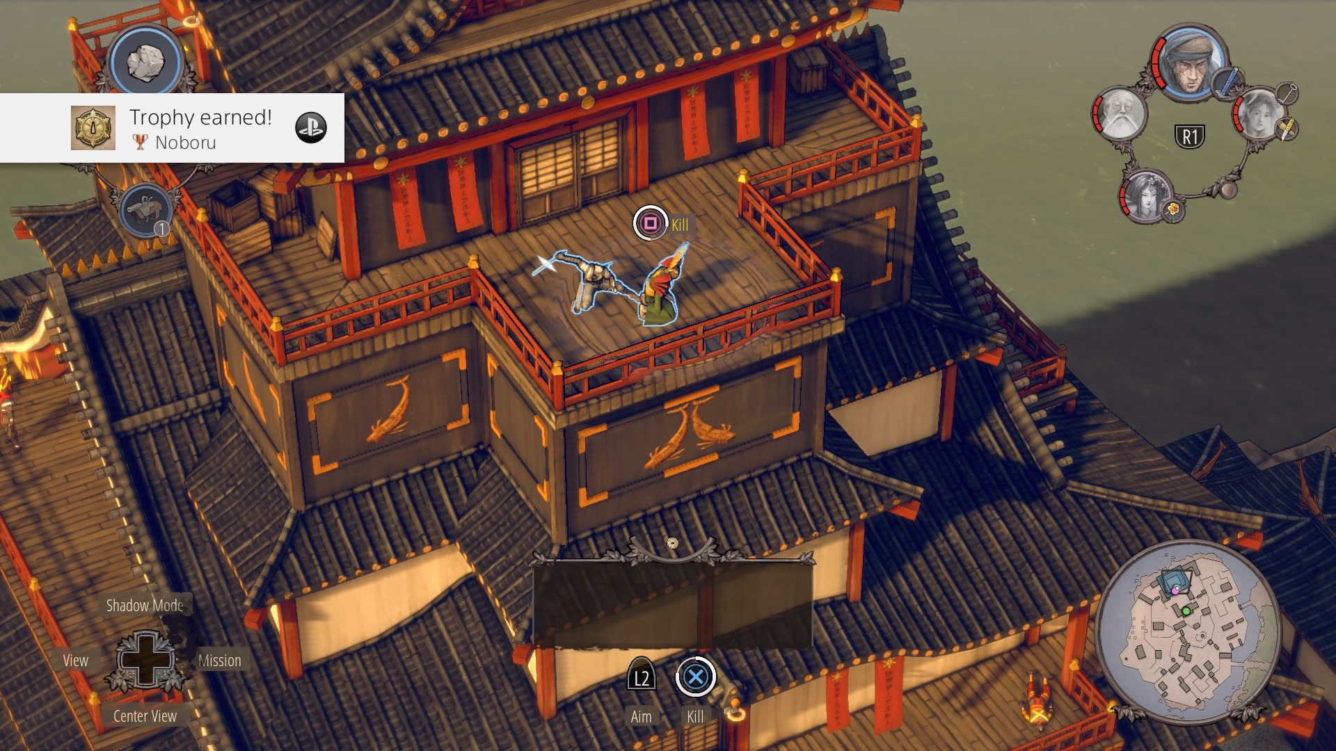 Killing Noboru: Climb the ladder on the small house and use the rope to reach the outer wall. Hop down and follow the wall across to reach the cliffs behind the keep. Use the hooks to climb up to the second rooftop, and cross over to the front balcony – sneak by the samurai while the center samurai talks to each. At the front balcony, there are three Straw Hats – simultaneously kill them with Aiko (in disguise), Hayato and a sniper shot from Takuma.