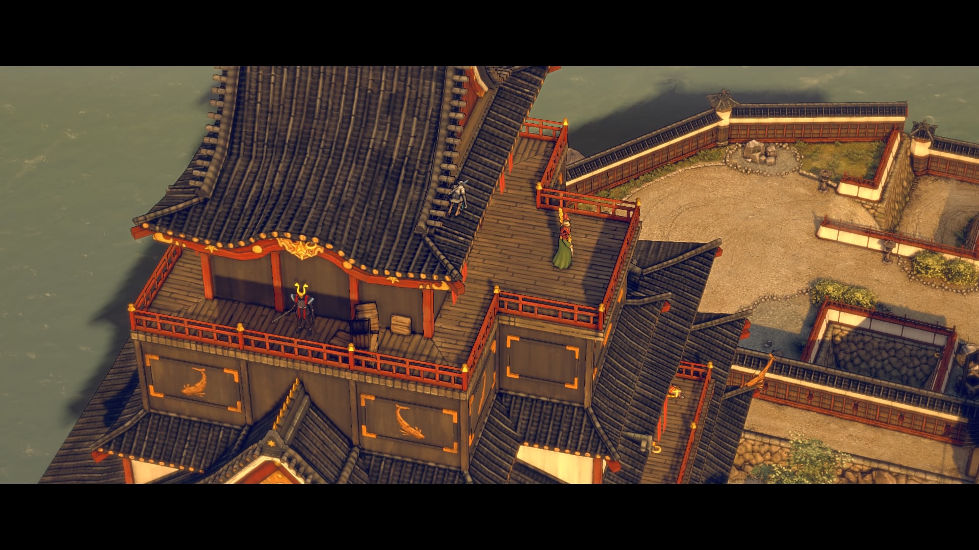 Up on the small house in the upper tier, a nobleman patrols – the soldiers here change positions depending on if the nobleman is talking to the samurai. Use the hook to climb up into the square tier with the small house when the nobleman is talking – distract the guard looking toward the hook with a stone.