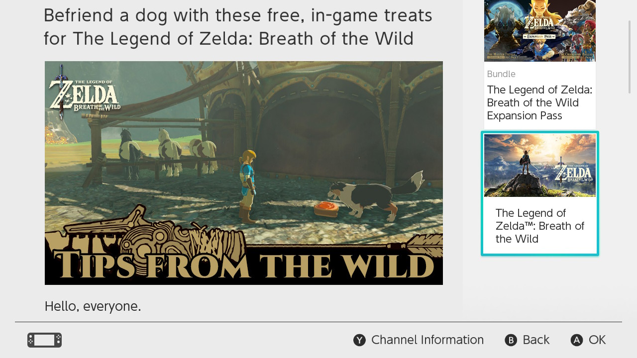 Now that you’re following the Breath of the Wild tips channel, we can access the first tip — the “Befriend a dog” post. You may have to exit [News] and restart to refresh the feed.