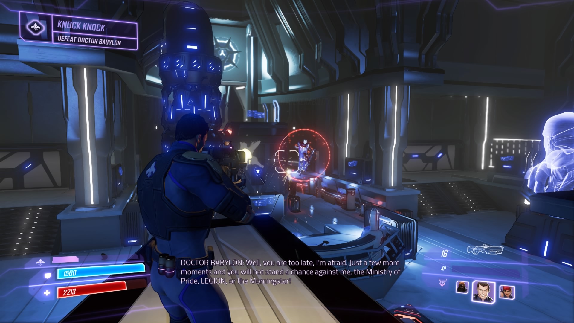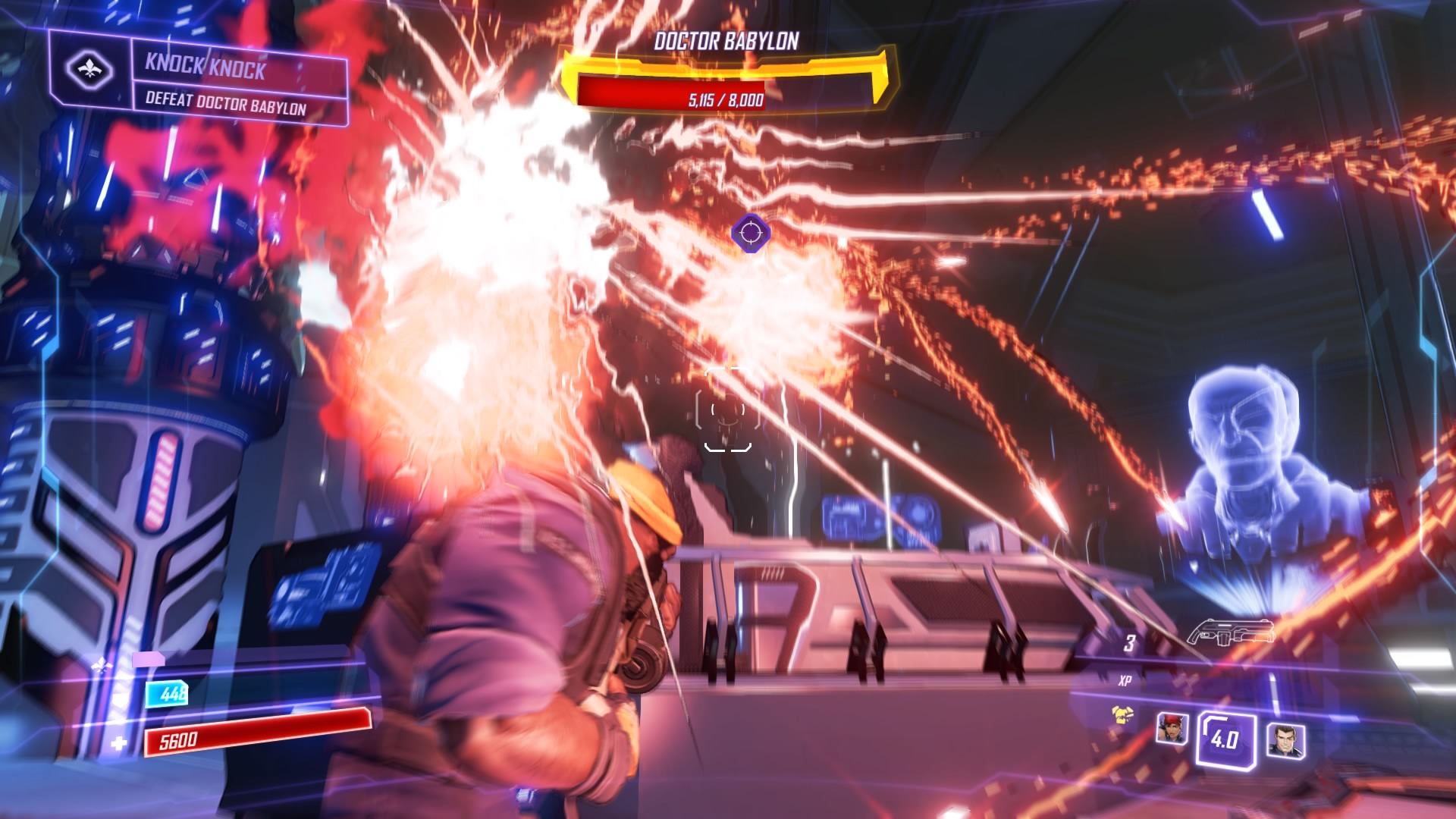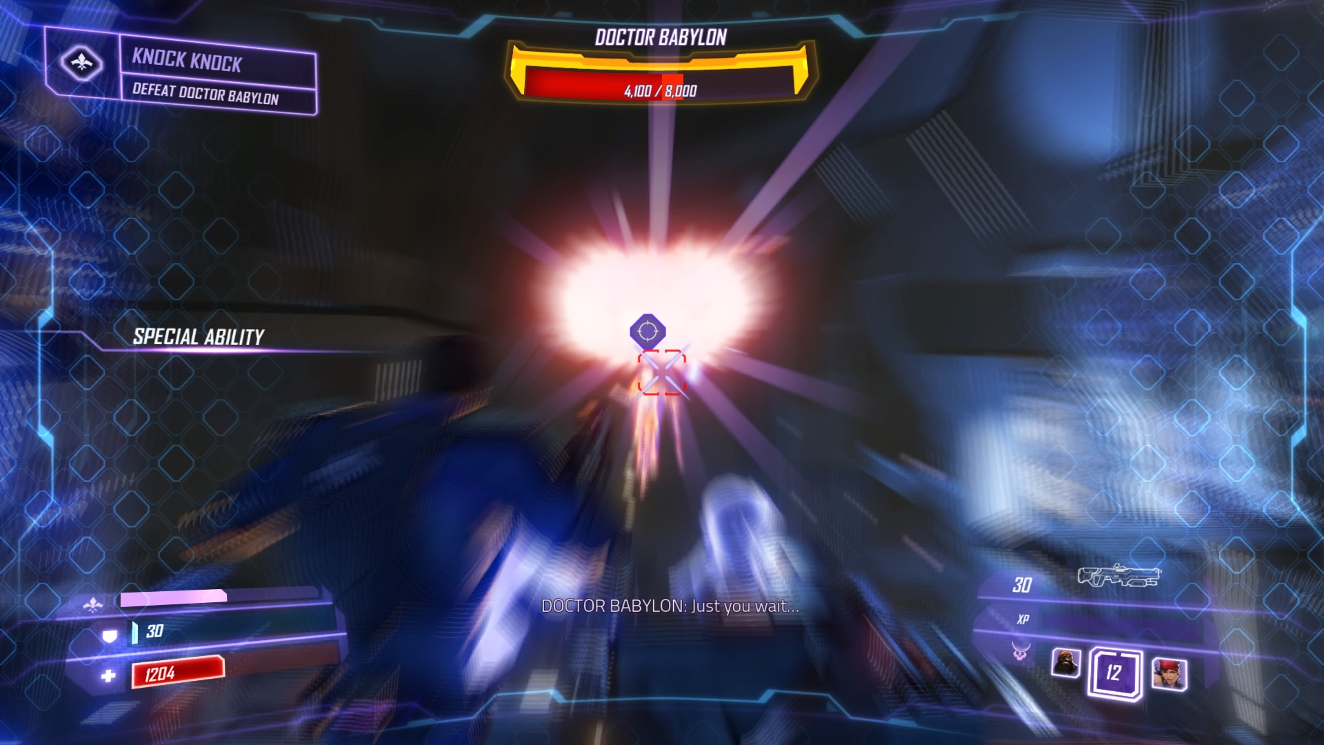 Dr. Babylon shields himself in an invulnerable shield and summons swarms of minions. Press [Triangle / Y] to scan the area and spot where the incoming enemies are coming from. Deal with them, and the invulnerable shield will lower.