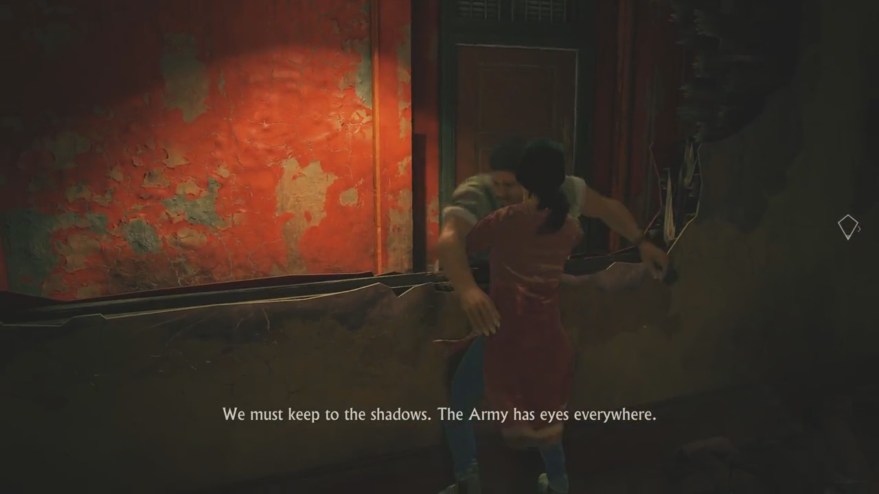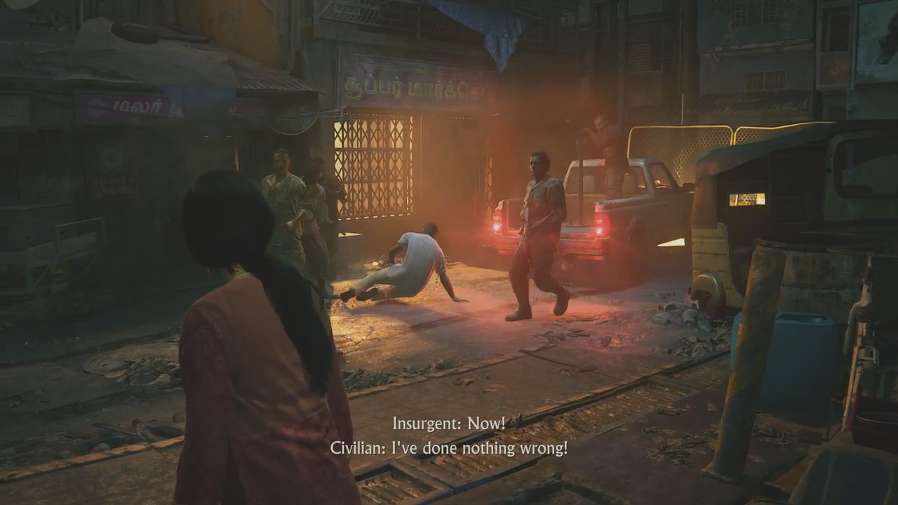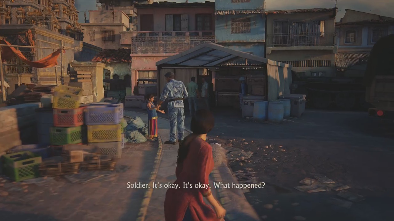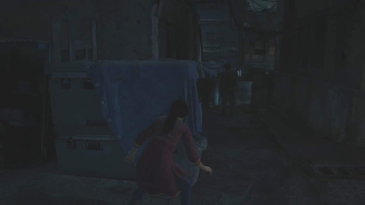 For the most part, you’ll be making your own way through the market, heading towards the truck of interest. Once you reach the truck, however, there will be a soldier present making it impossible for Chloe to hop onto the truck unseen. Luckily, Meenu will distract the soldier allowing players to sneak by.