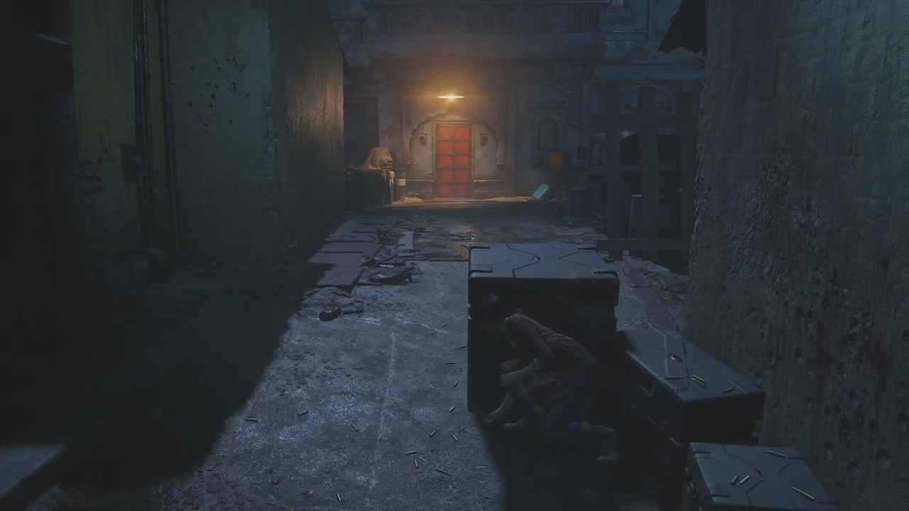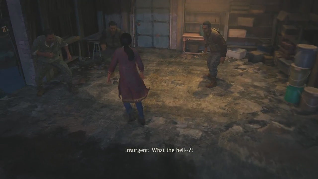 After reaching your destination from the truck, Chloe will pull her phone out to reveal that she is looking for a red door. Head up through the corridor and make a right. You’ll continue to follow that pathway until you reach a group of insurgents interrogating a civilian. It’s at this point, players will be forced to head towards the opposite direction of the insurgents.