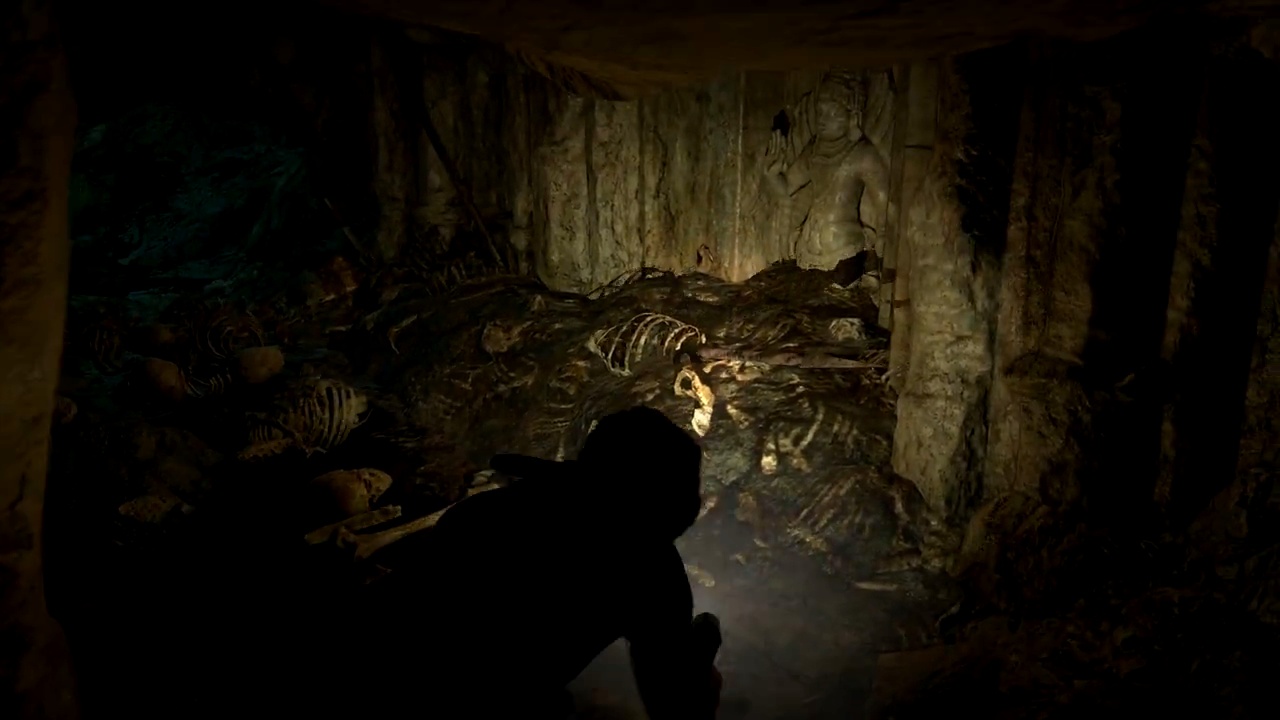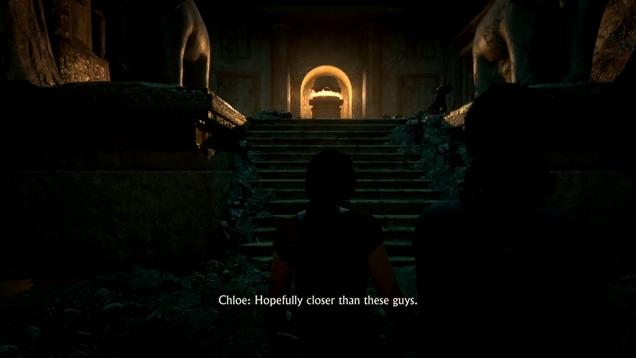 Located on the rear of the statue’s head will be an opening for Chloe and Nadine to slide inside. Continue going through the passageway, dropping down the cavern when possible.