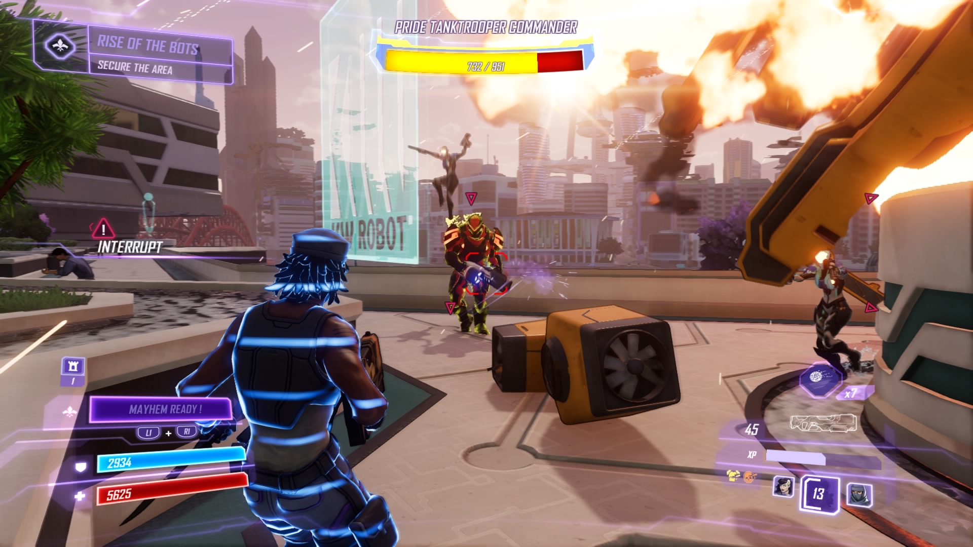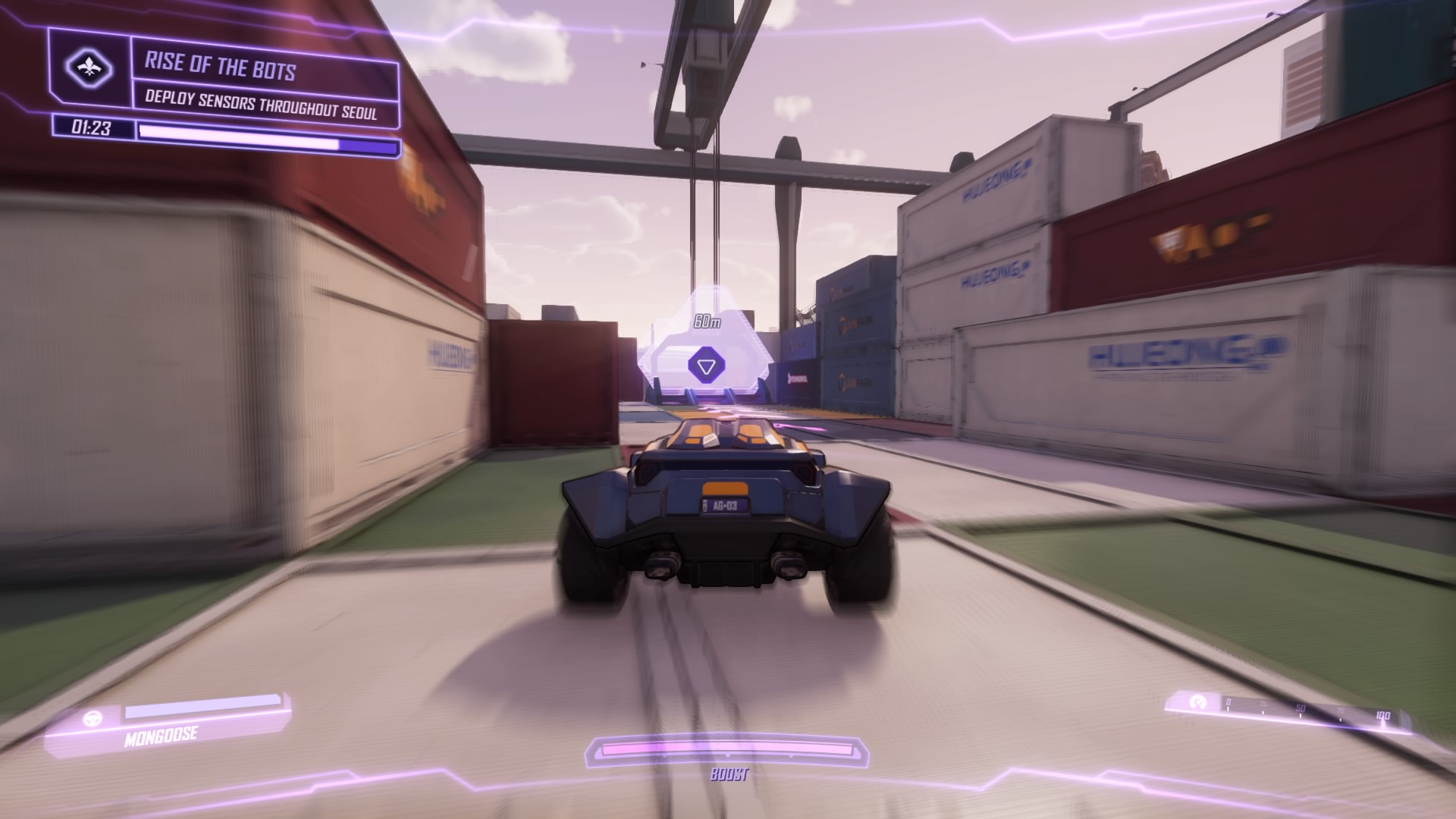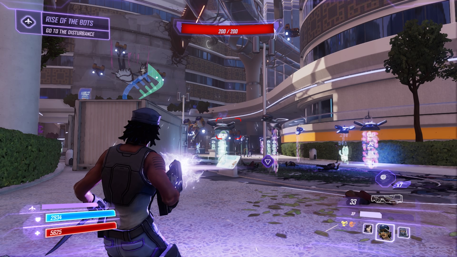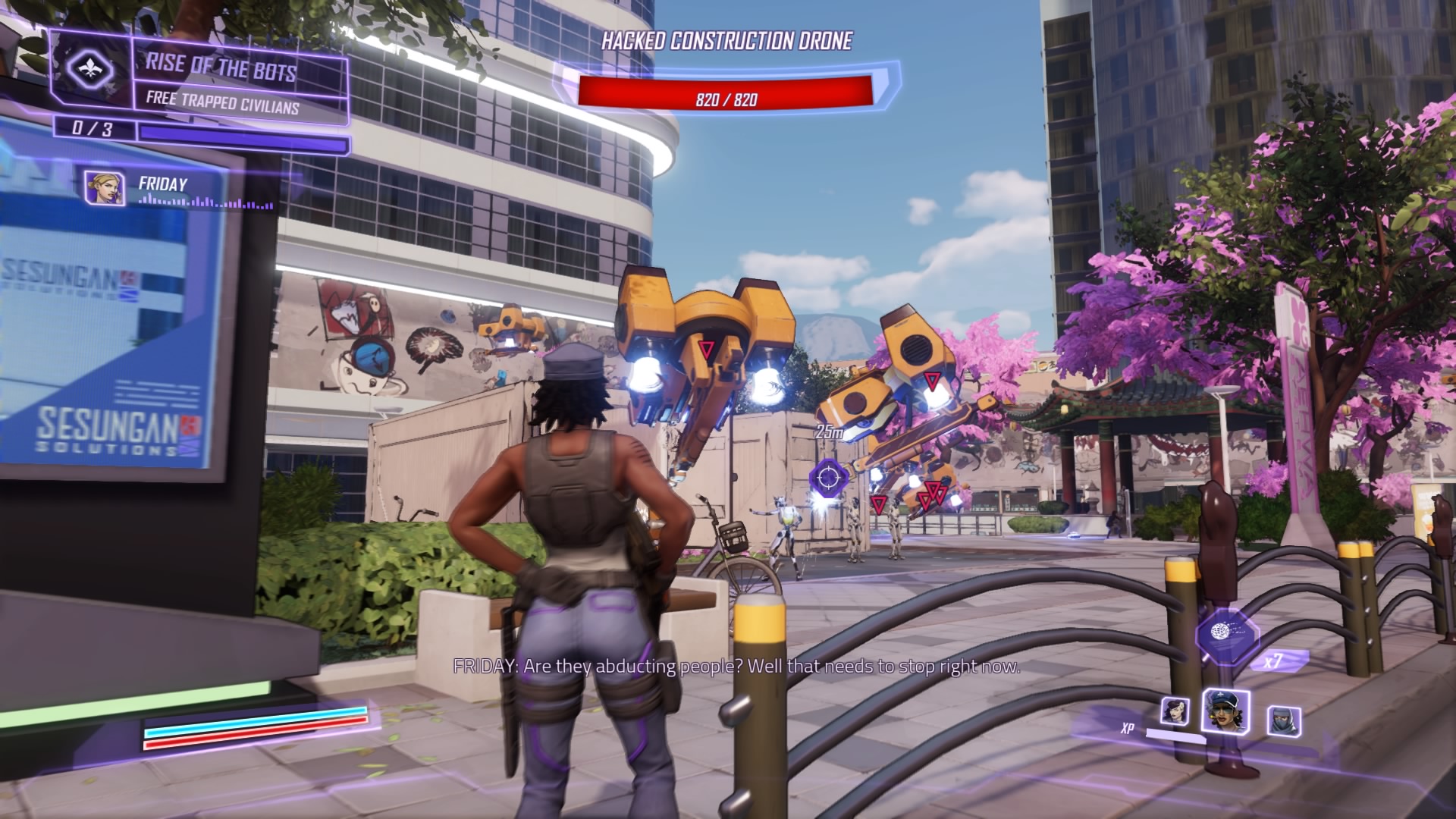 All the bots in Seoul are going haywire. Sprint to the disturbance to find the construction drones and COPs rounding up civilians. Blast the drones (they fly at you and self-destruct) and shoot the lock on the container to free the stuck civilians.