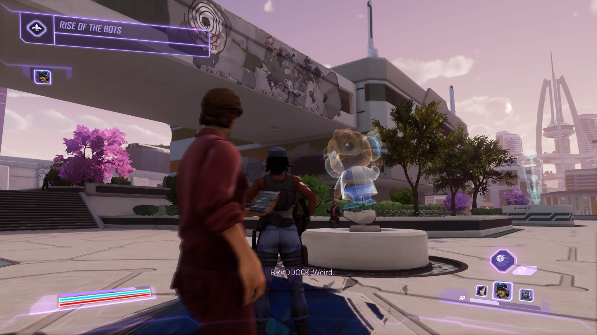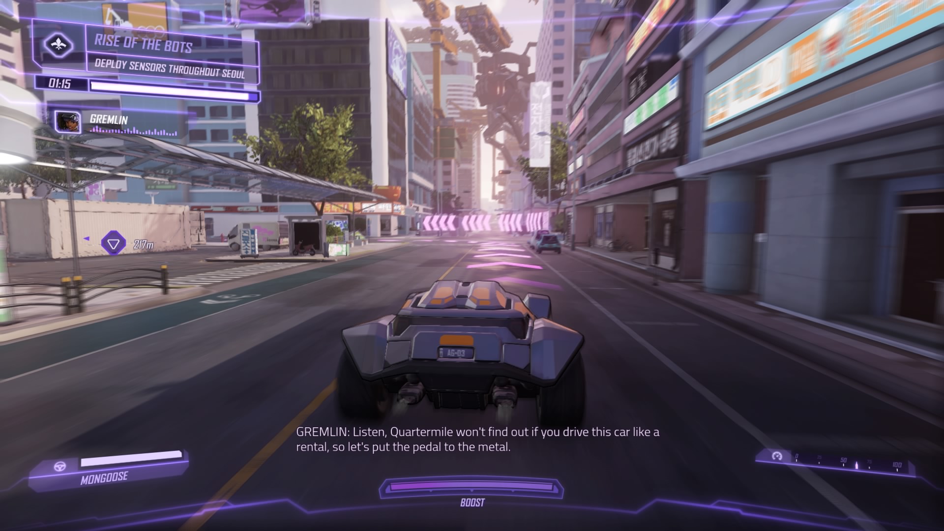 Nearby, track down the transmitter signal to the rooftop. The construction drones are busy – they’re tagging all the nearby buildings with giant murals! Blast the transmitter to destroy them all, then hop into Quartermile’s fancy car down the street.