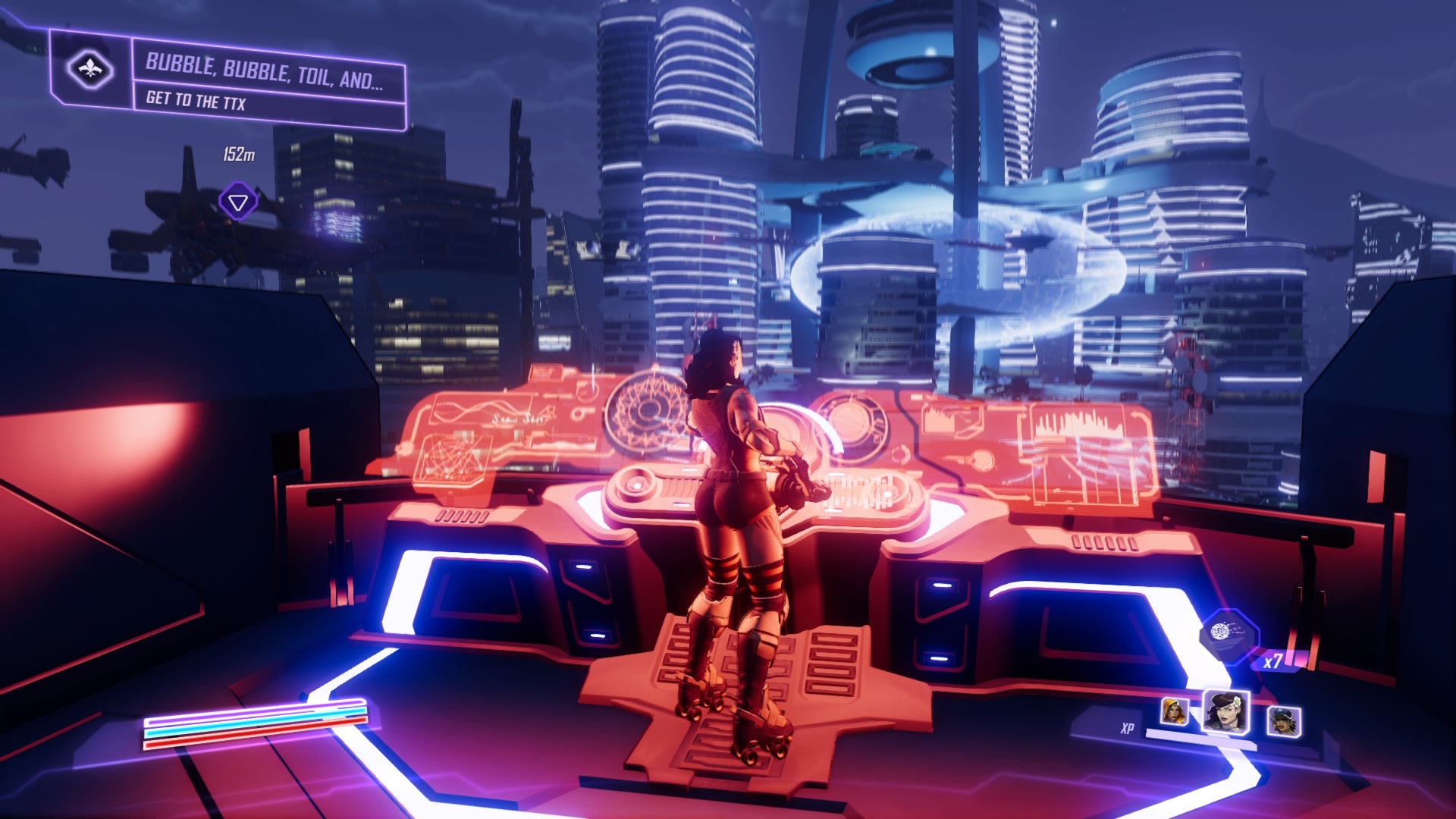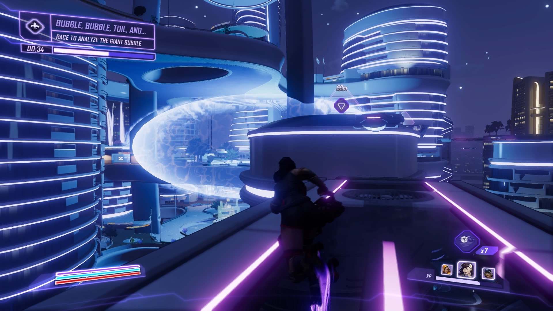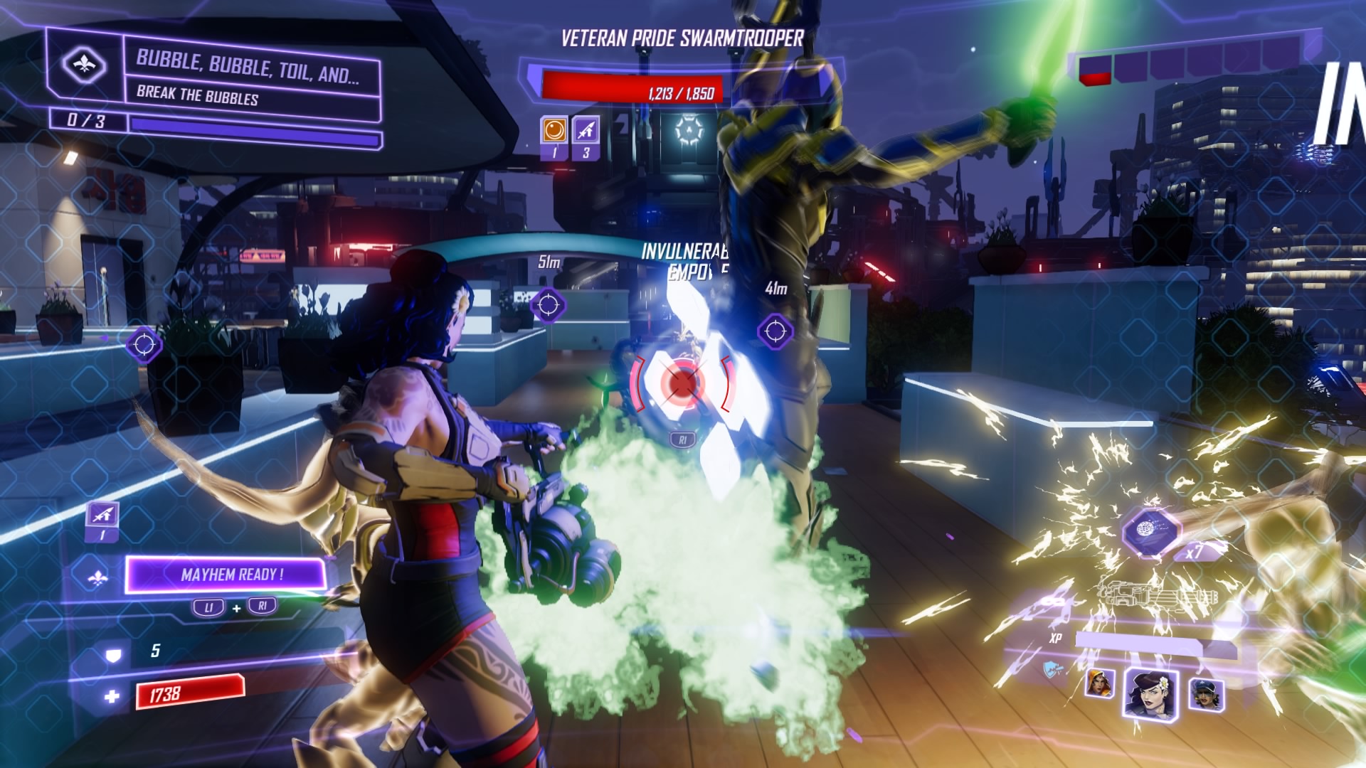 Use the elevator at the second waypoint. On the rooftop, you’ll get swarmed by Swarmtroopers and Bufftroopers. Take them out and destroy all three bubbles – Scheherazade and Daisy are pretty good at smashing Swarmtroopers. Yeti can withstand their attacks, too. Destroy the Shocktrooper, and – Ariadne has a new surprise. She has a giant bubble in the TTX. Rush to the Seoul city center. Use the rooftop barge nearby.