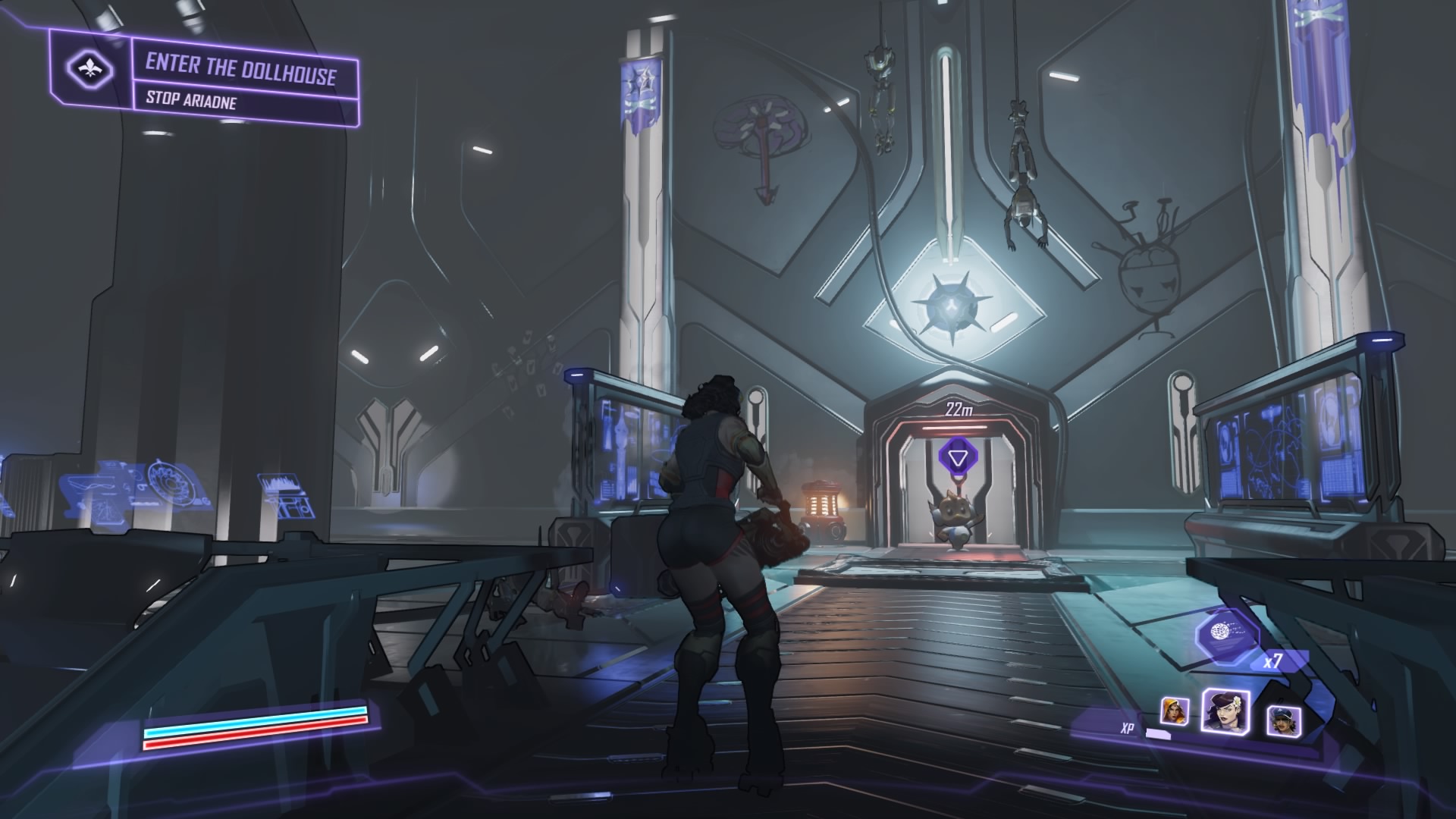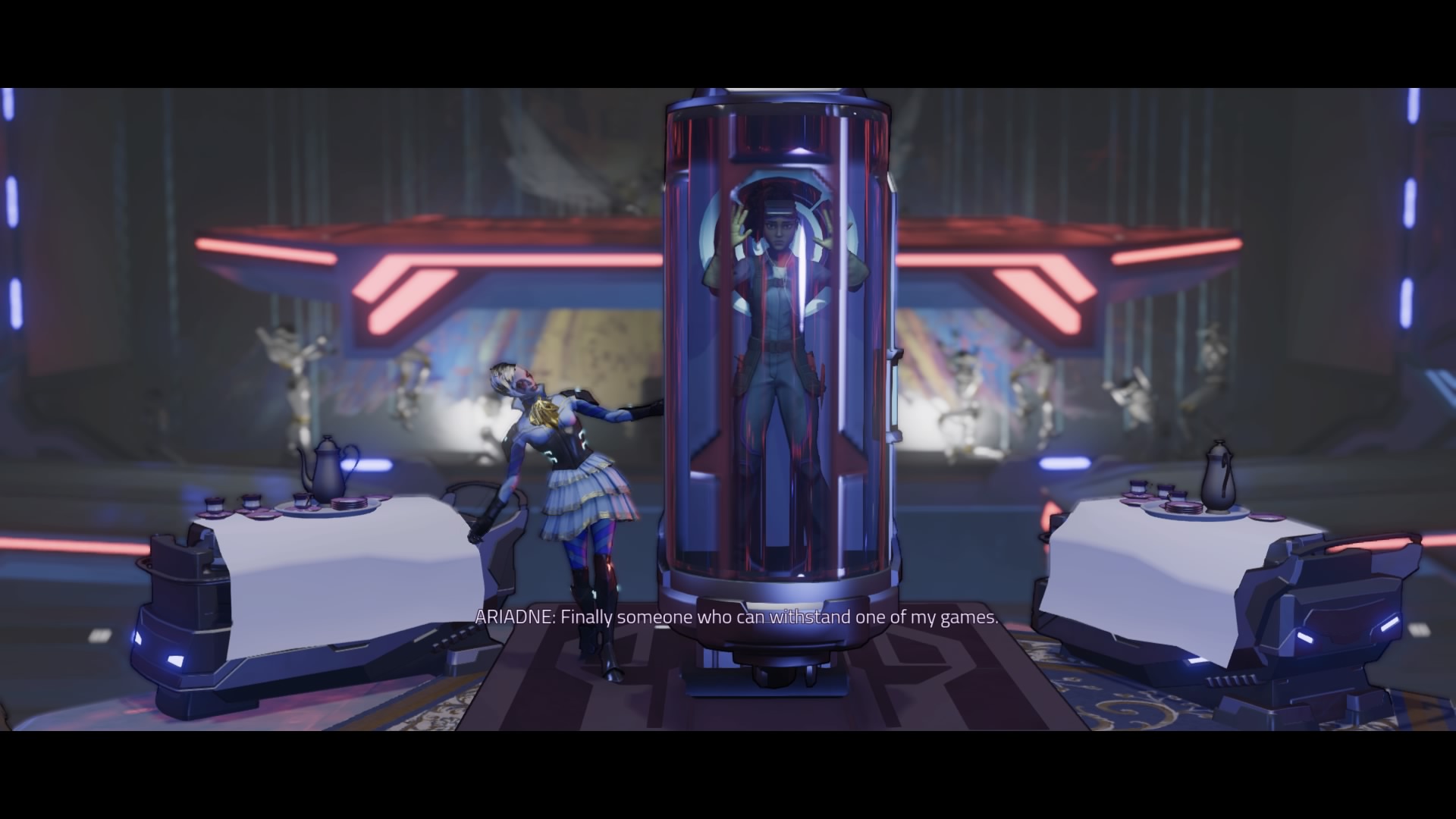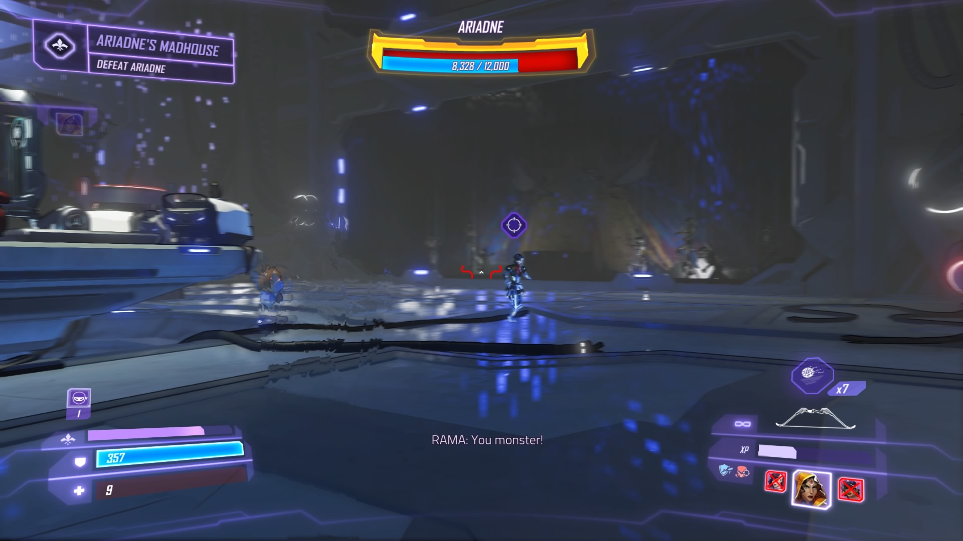 Phase 3: For the last phase, she’ll drop down and attack while summoning more trap bots from the ceiling. Drain her shields, and circles will appear near the dioramas – stand in the circles to trick Ariadne into attacking and stunning herself. Dash just as she attempts to attack, then use everything you’ve got on her.