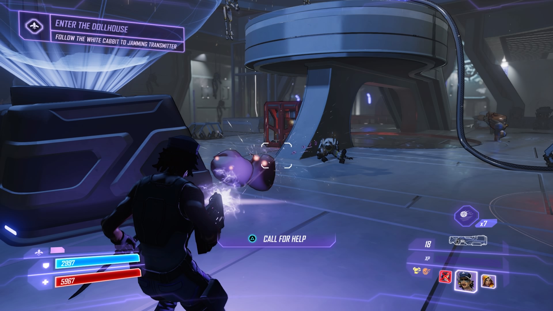 Friday tracks the signal down to a LEGION front called KW Robotics. Hop in your fastest car and take off for the company – at the place, start using your locator and interacting with the holograms. After talking to three, Ariadne reveals herself and unleashes her ambush. Don’t waste your time fighting the swarms of COPs. Scan with your location and drop down to the ground floor to find the first transmitter on the wall. The second is in the corner of the campus, and the third is back on the main pavilion.