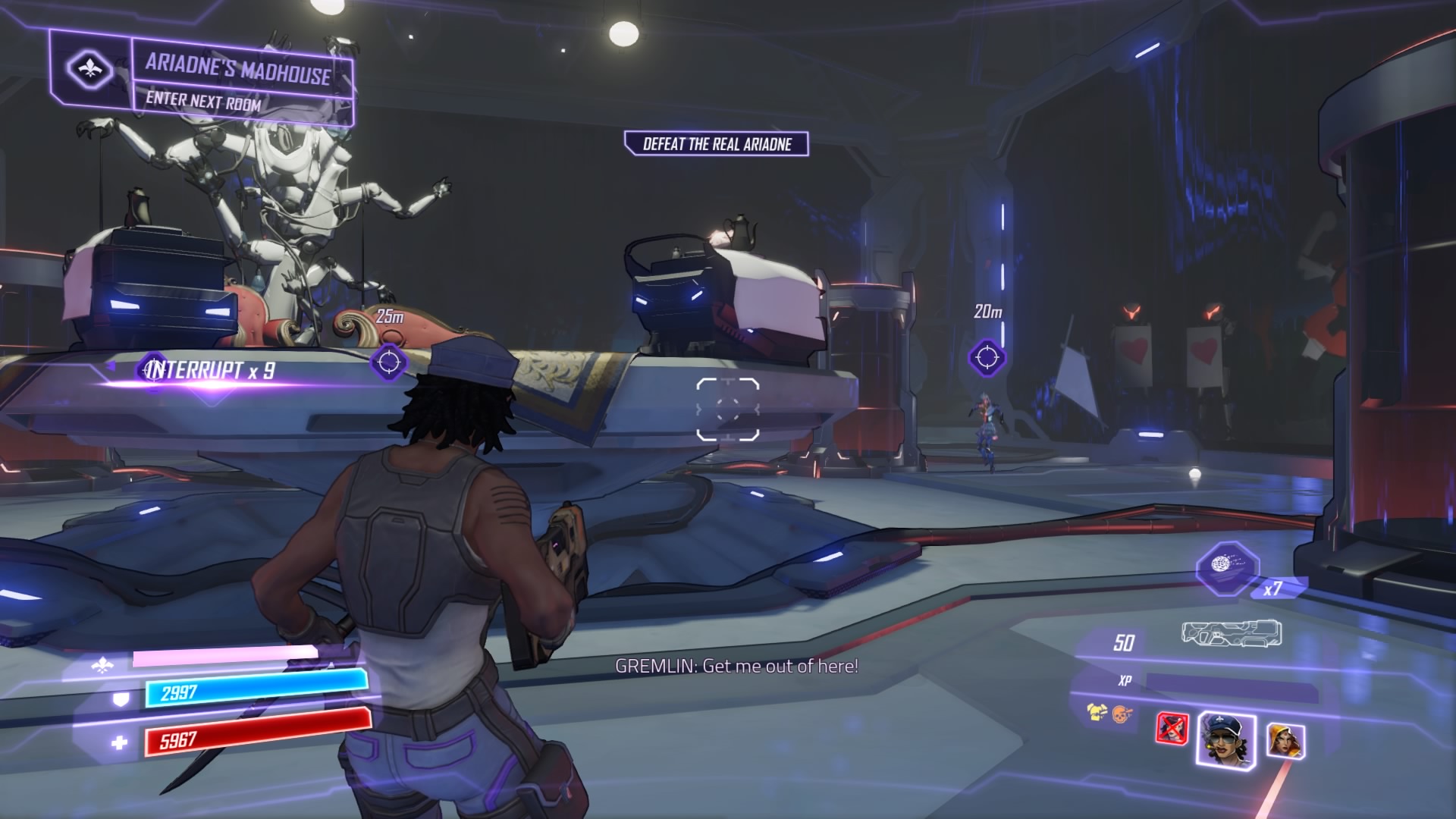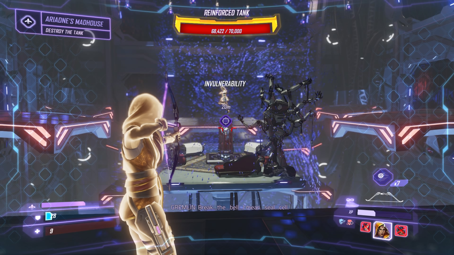 Phase 2: Gremlin is moved to the center, and you’re stuck on floating platforms. Ariadne will attack with ceiling explosions that hurt your agent if they’re jumping, or she’ll launch a beam attack that she spins around the arena. She’s invulnerable, so ignore her and focus on grabbing the weird sparkly energy orbs.
