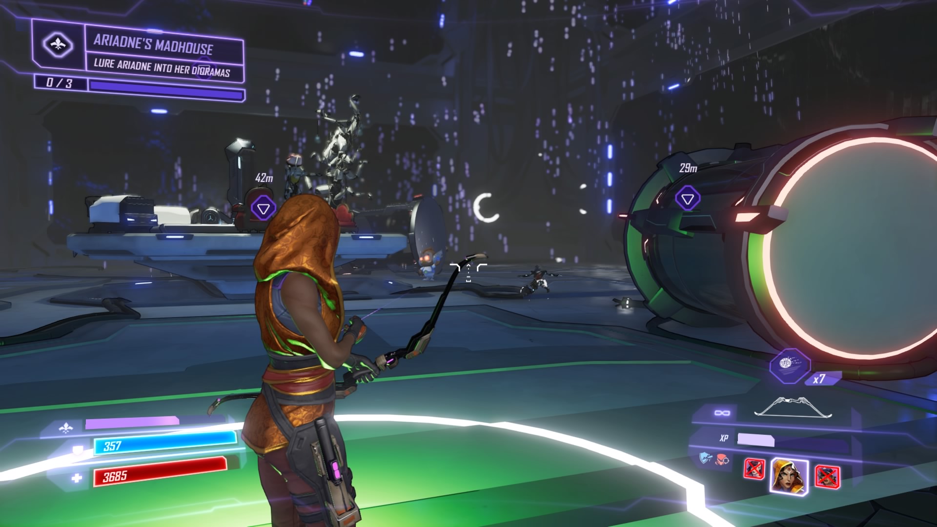 You can tell which is the real Ariadne from her blue shield. Use stealth to pinpoint her, but she’ll quickly mix herself up with the robotic copies. Braddock can quickly destroy the armor on the robot fakes, but it’s tough to destroy them. The robotic copies become stunned and invulnerable after taking damage, giving you (some) time to focus on the others. Use the pods for cover and keep circling the arena, stunning robots and blasting the real Ariadne until her health bar is low.