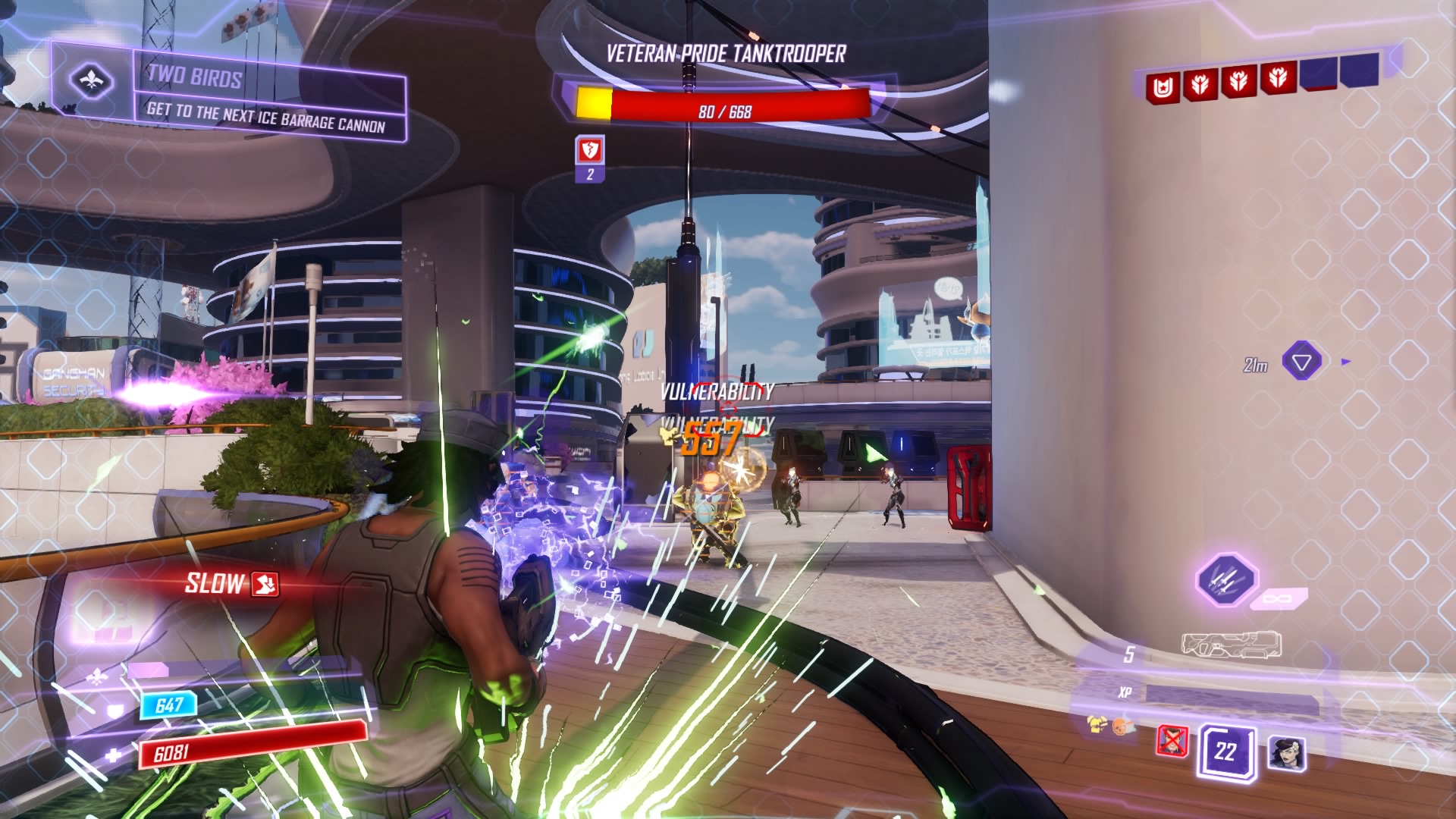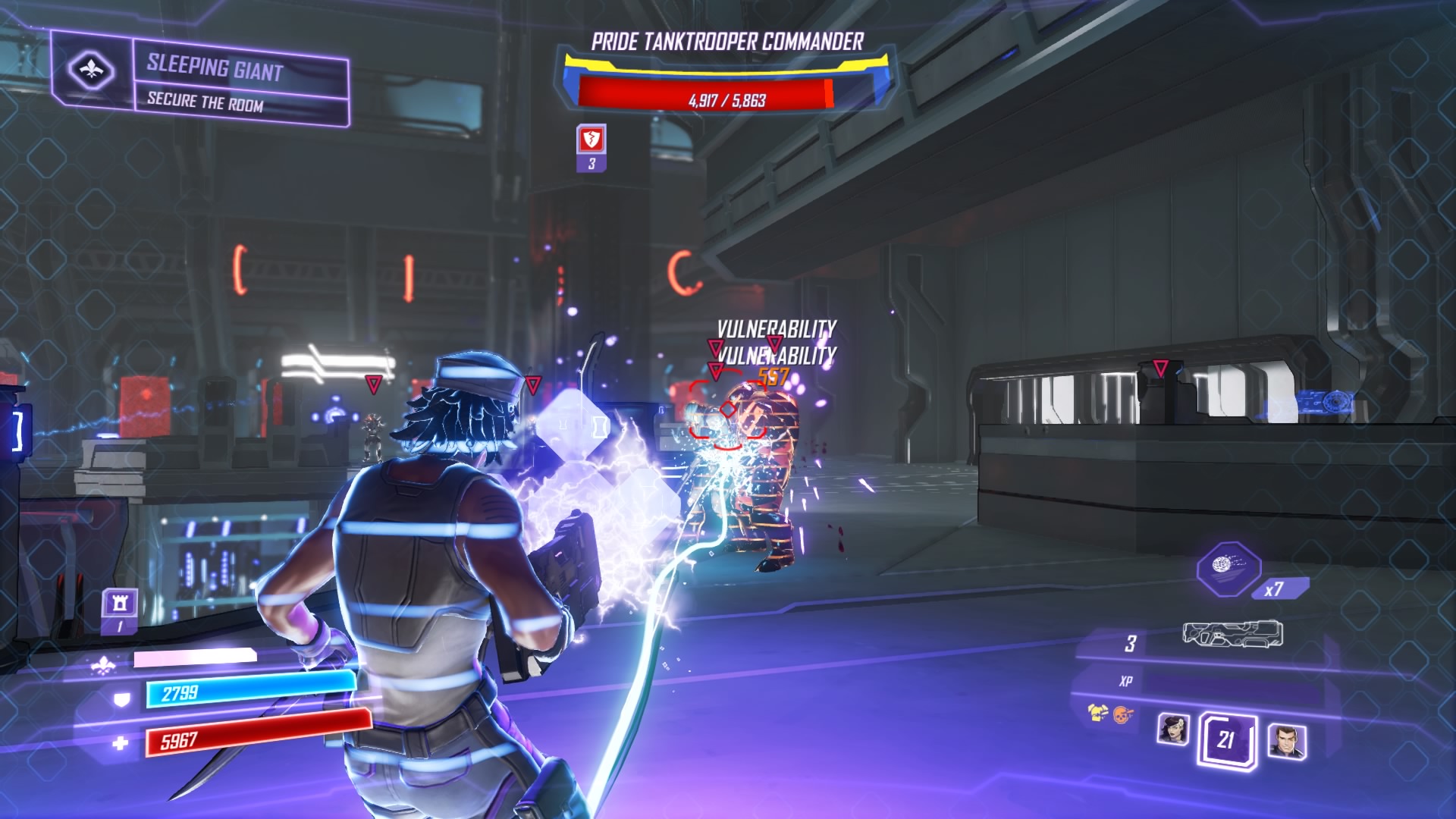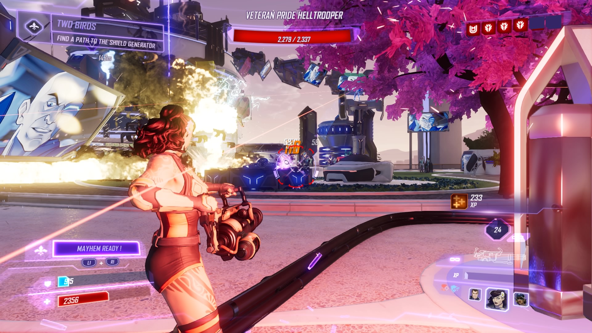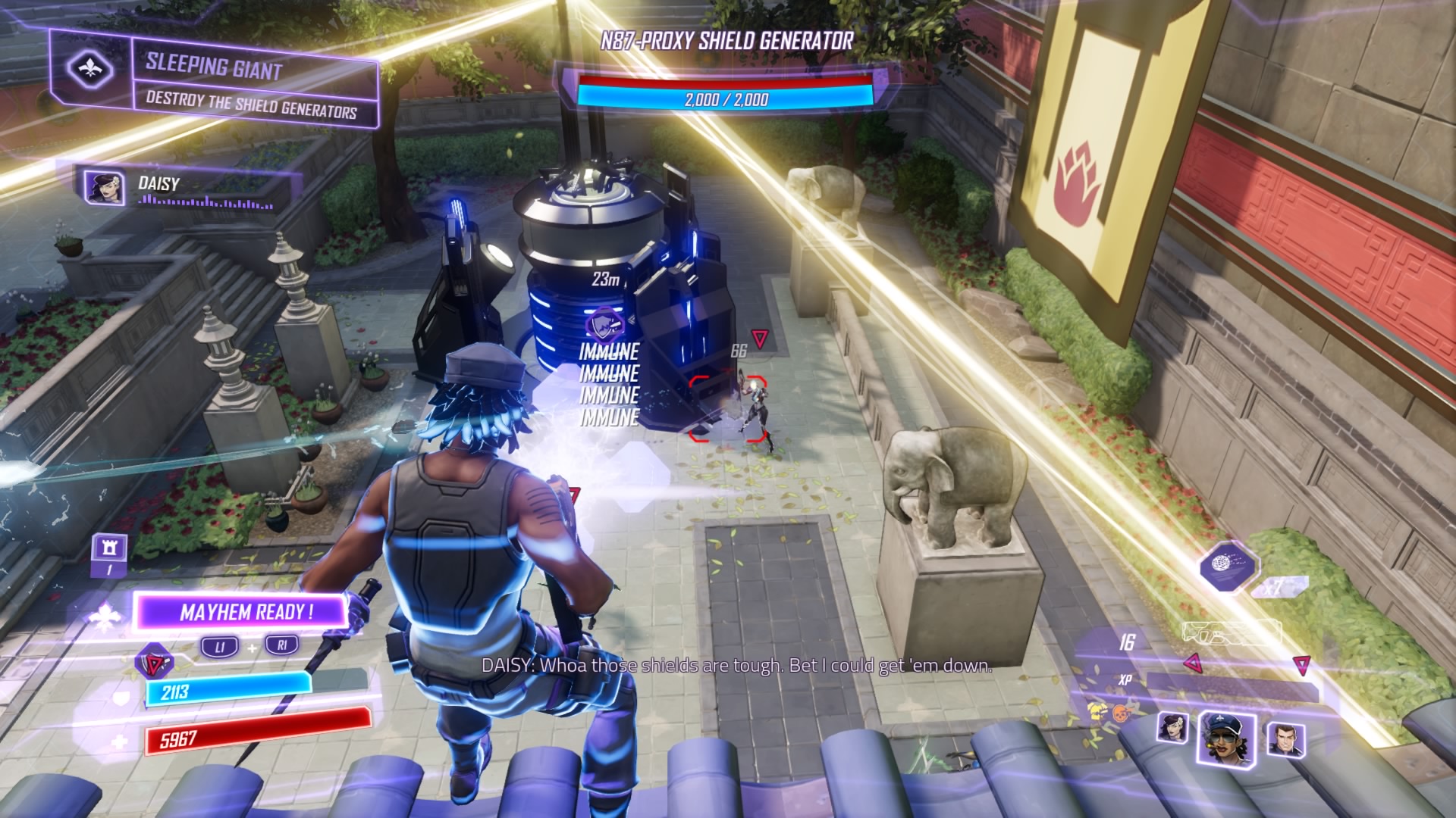 When the network devices are destroyed, you’ll need to clear out the Pride Bot Captain. Clear out the Snipetroopers before attempting to assault his balcony. He’s a tough bot – use your Mayhem abilities when the rest of his helpers are defeated, and watch out for his sniper-like attacks and stunning abilities. Smash the robot, and interact with the large drum to learn about the Damocles robot.