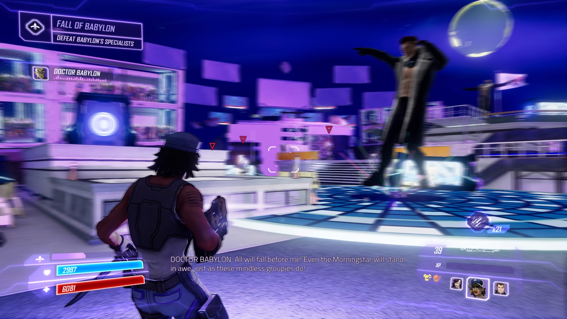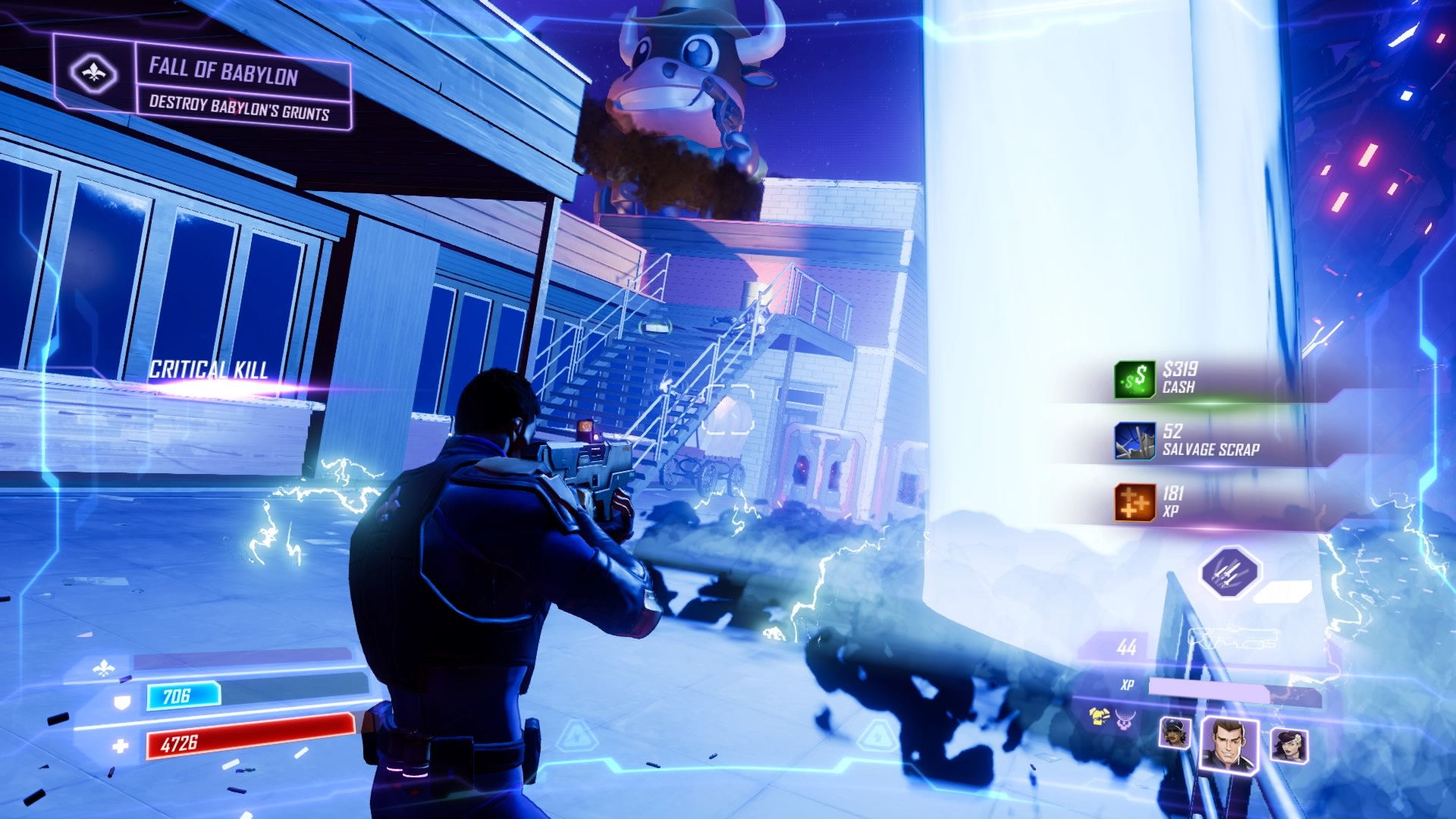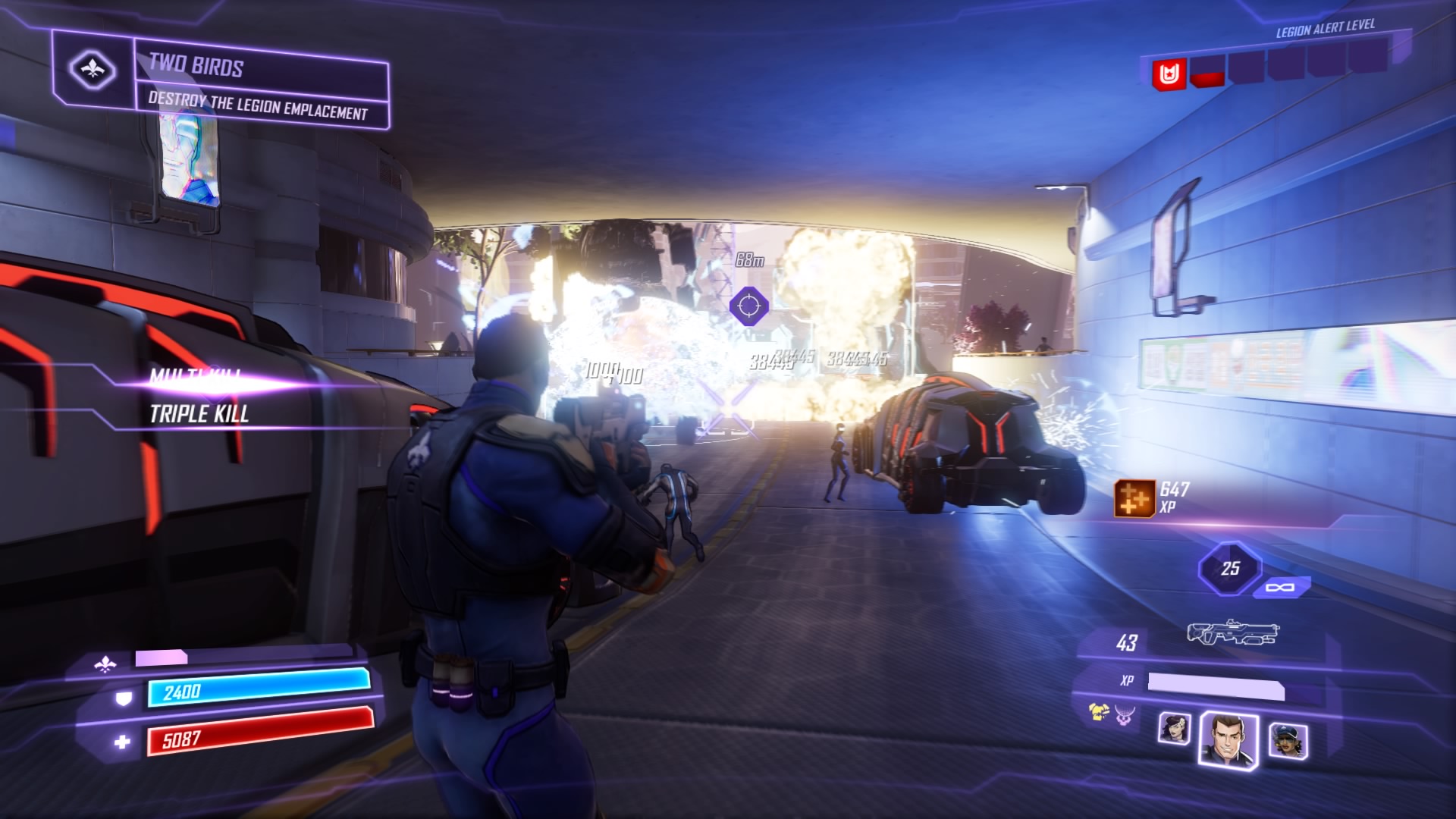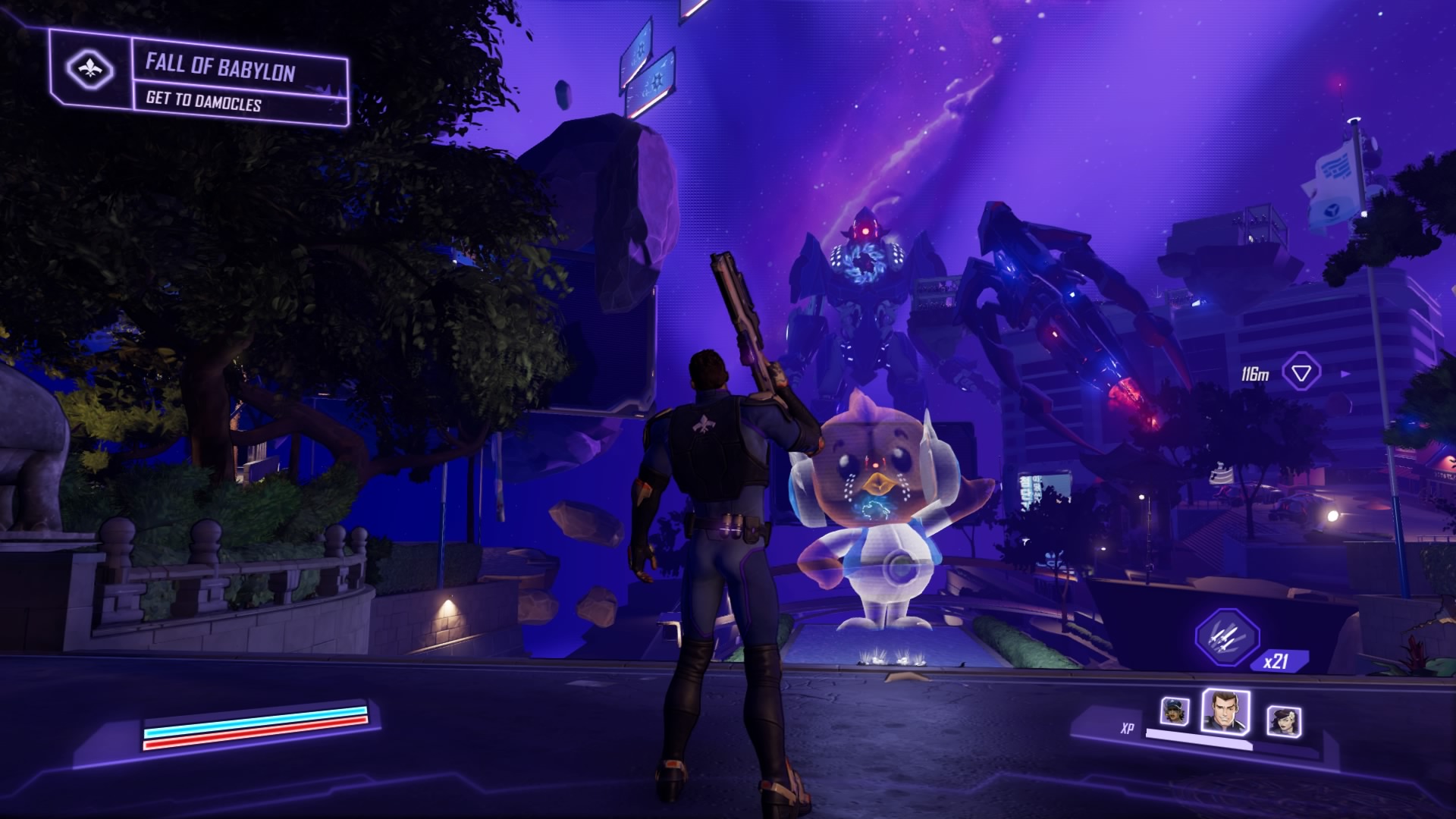 Move to the first waypoint and deal with the first waves of LEGION soldiers. Dr. Babylon summons an upgrade space laser weapon from the sky. Dodge around the blasts and keep moving! You won’t have to fight too many enemies at once. Not yet anyway.