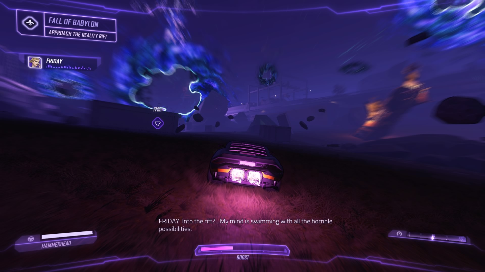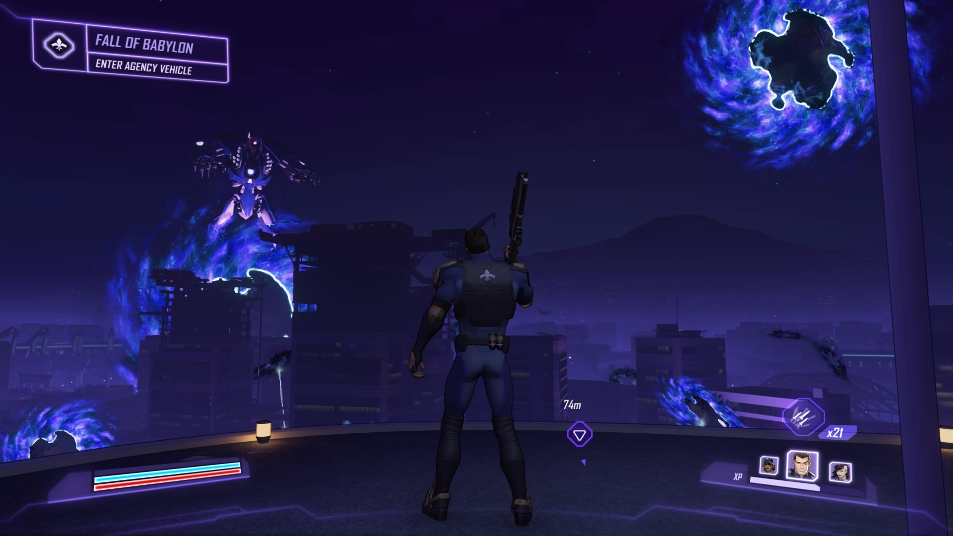 Drop down to the streets and grab an Agency vehicle. Dark matter tears are opening throughout the city. Avoid the blasts of lightning and follow the path to enter the reality rift! Yeah, sounds like a great idea. The inside is pretty messed up – chunks of Seoul are floating in a void, while Dr. Babylon’s Damocles robot watches the area.