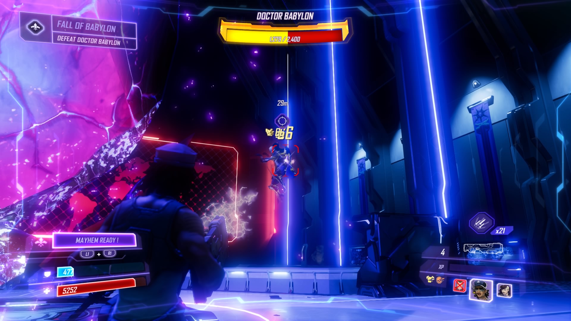 Save your Mayhem powers for the final portion of the fight. Babylon has an insane amount of HP, and only your Mayhem powers can deliver significant damage. Unleash all three at this point – when he’s down, smash the crystal to complete the game.