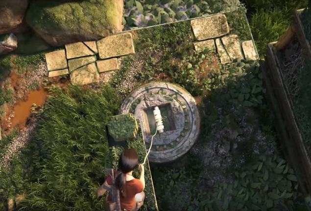 Climb up the ruins and position yourself on the perch. Looking down, Chloe can grapple onto a beam and then jump to the left of the perch, allowing the cover to be lifted up.