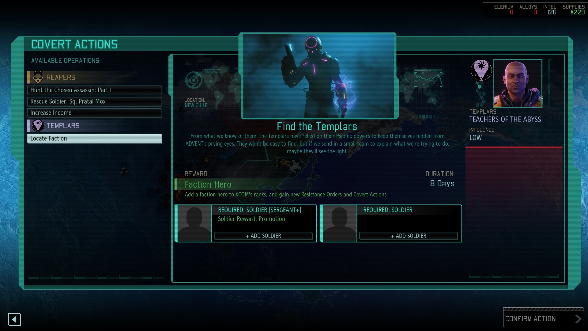 TIP: Each faction provides a different bonus in the strategy layer. Finding and unlocking a faction HQ gives additional intel (Reapers), heals your soldiers faster (Templars), or causes builds to complete faster (Skirmishers).
