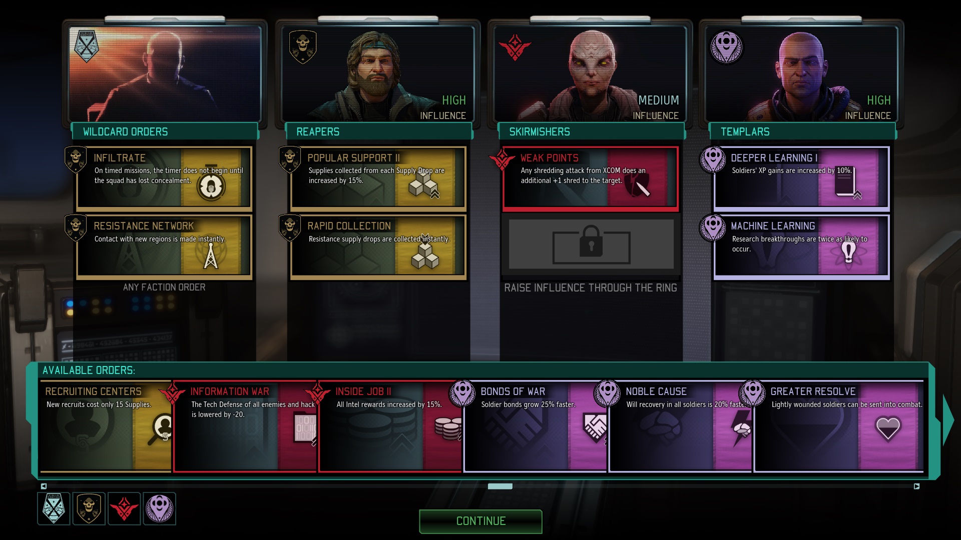 As a reward for Covert Actions, you can unlock Resistance Orders. These are special policies you can unlock, unique to each faction, that provide a variety of long-lasting benefits. The Reapers can slow mission timers, or summon extra Resistance Soldiers to help in battles. Skirmishers increase facility construction and special explosive weapon breakthroughs. Templars can limit the negative effects of any status effects, or increase the chances for research breakthroughs.