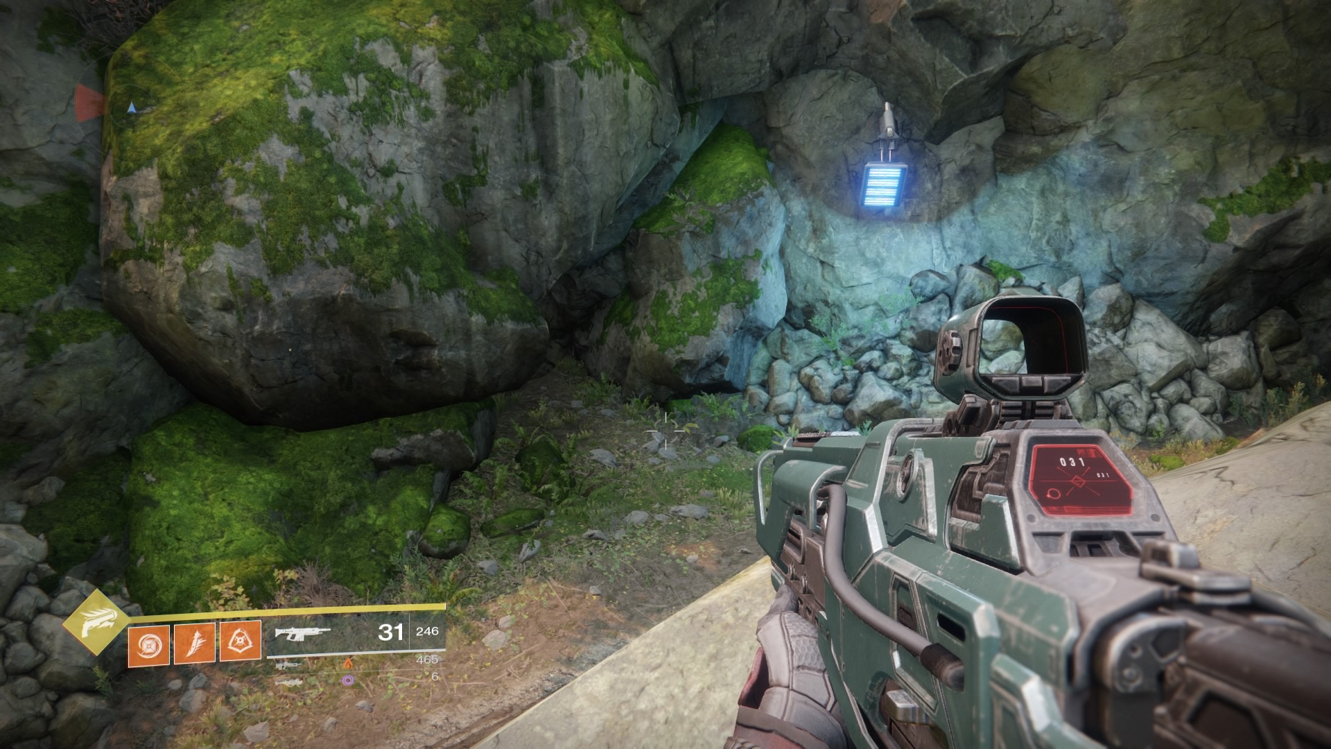 Region Chest #12: North of the giant guarded tunnel that leads to The Tunnels, there’s a smaller Cabal outpost outside a cave with a scannable inside. Climb onto the hills above this cave to find another cave higher up with a gold chest inside.
