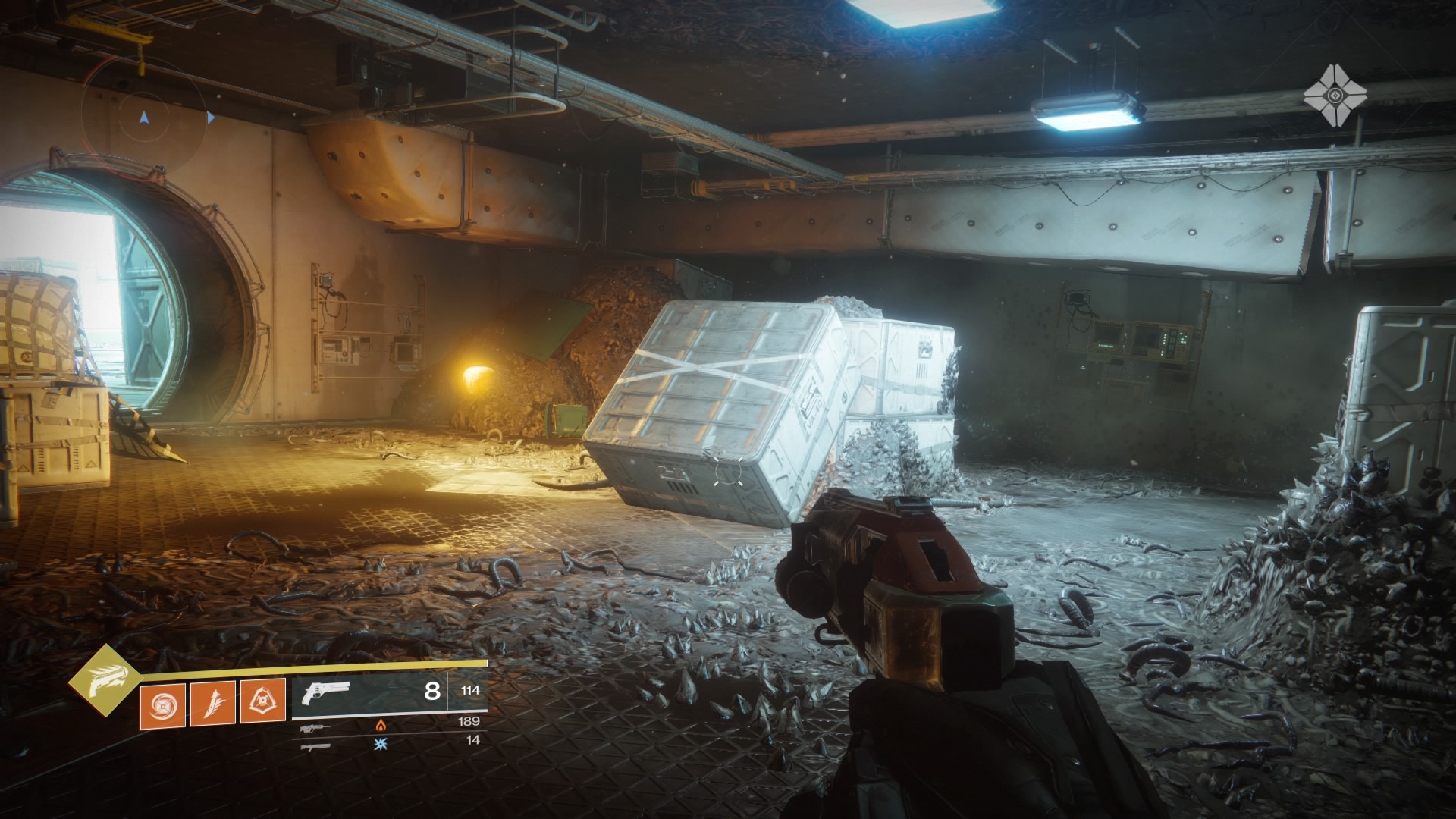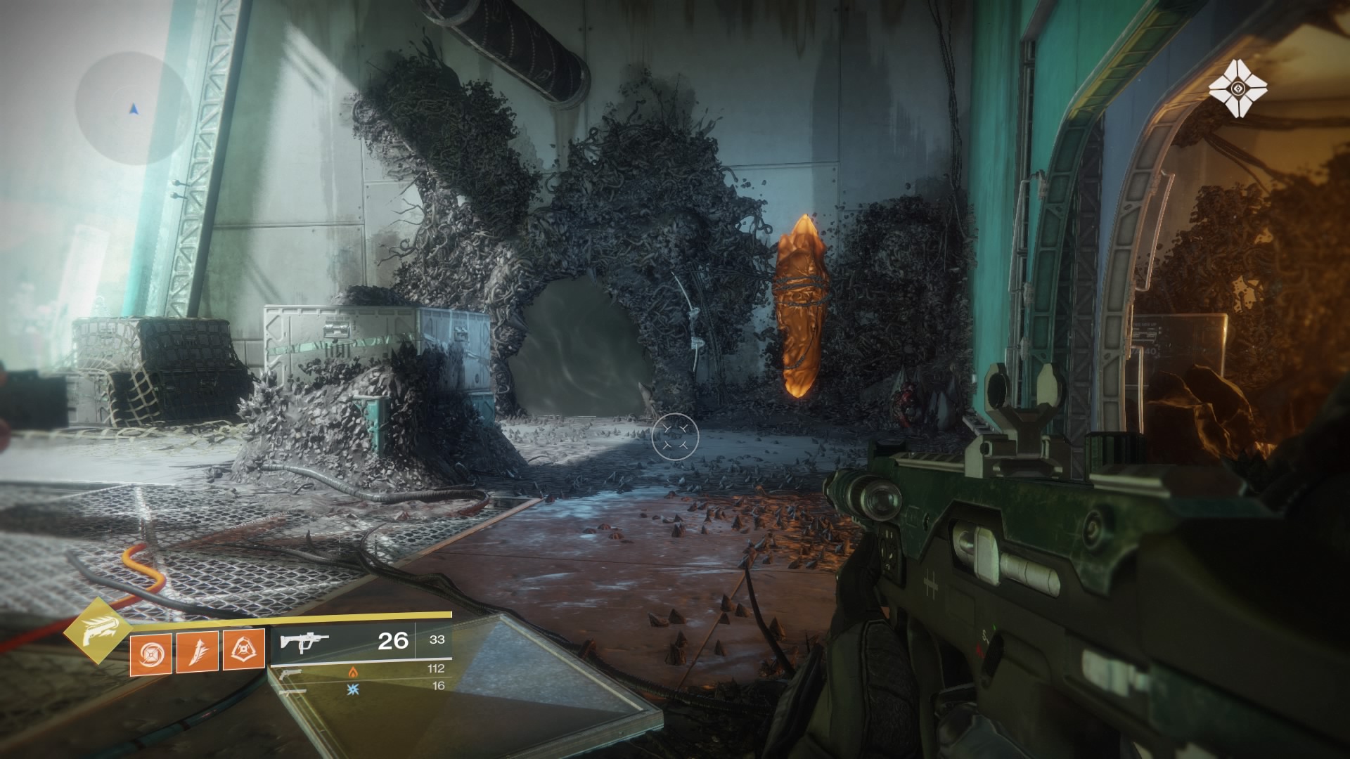 Scannable Object #12: To the left of the gate that leads to the Solarium, jump up onto the platform above the doorway. There’s an object encased in Hive gunk in the corner, visible in the northeast corner of the map.