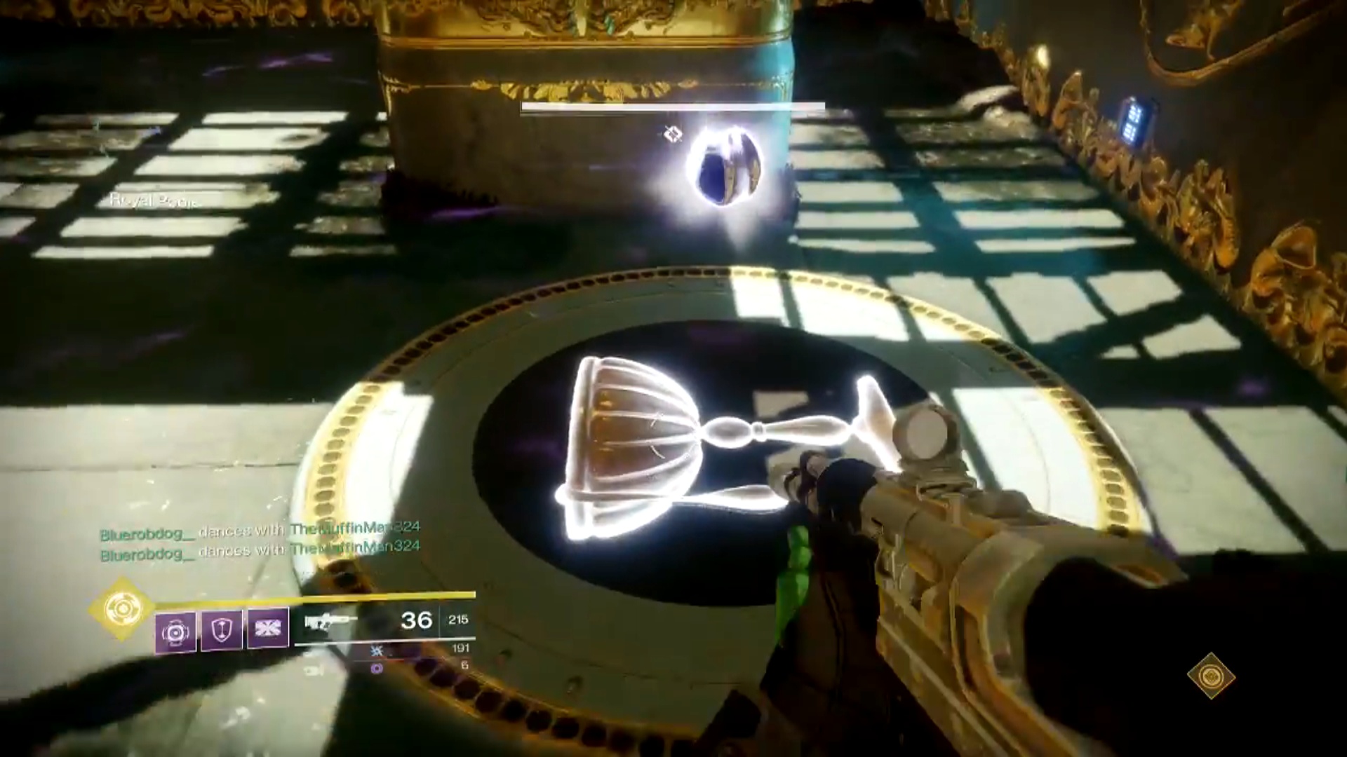 Afterwards, the projection Claus will fire off projectiles followed by orbs spawning that will allow the three players to return to the throne room. Now back into the throne room, players will need to climb up onto the platform that is glowing to gain the Force of Will buff.