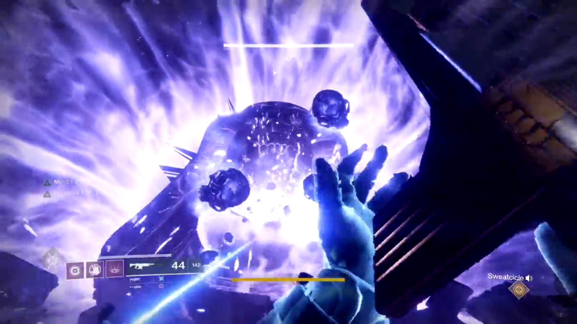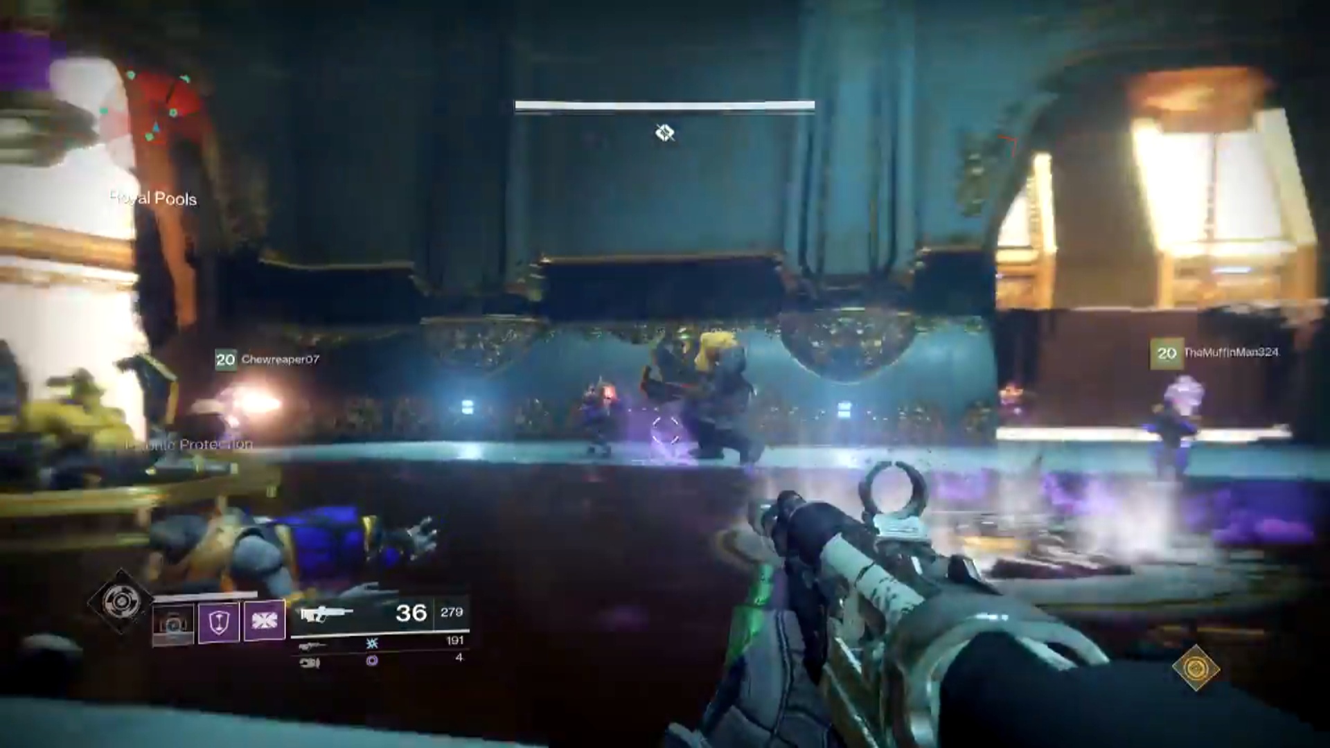 The remaining players will be fighting off Cabal while you’ll find a large white platform will be moving. When that platform stops, nine purple cisterns will be available to attack which all nine will need to be destroyed before you are able to progress.