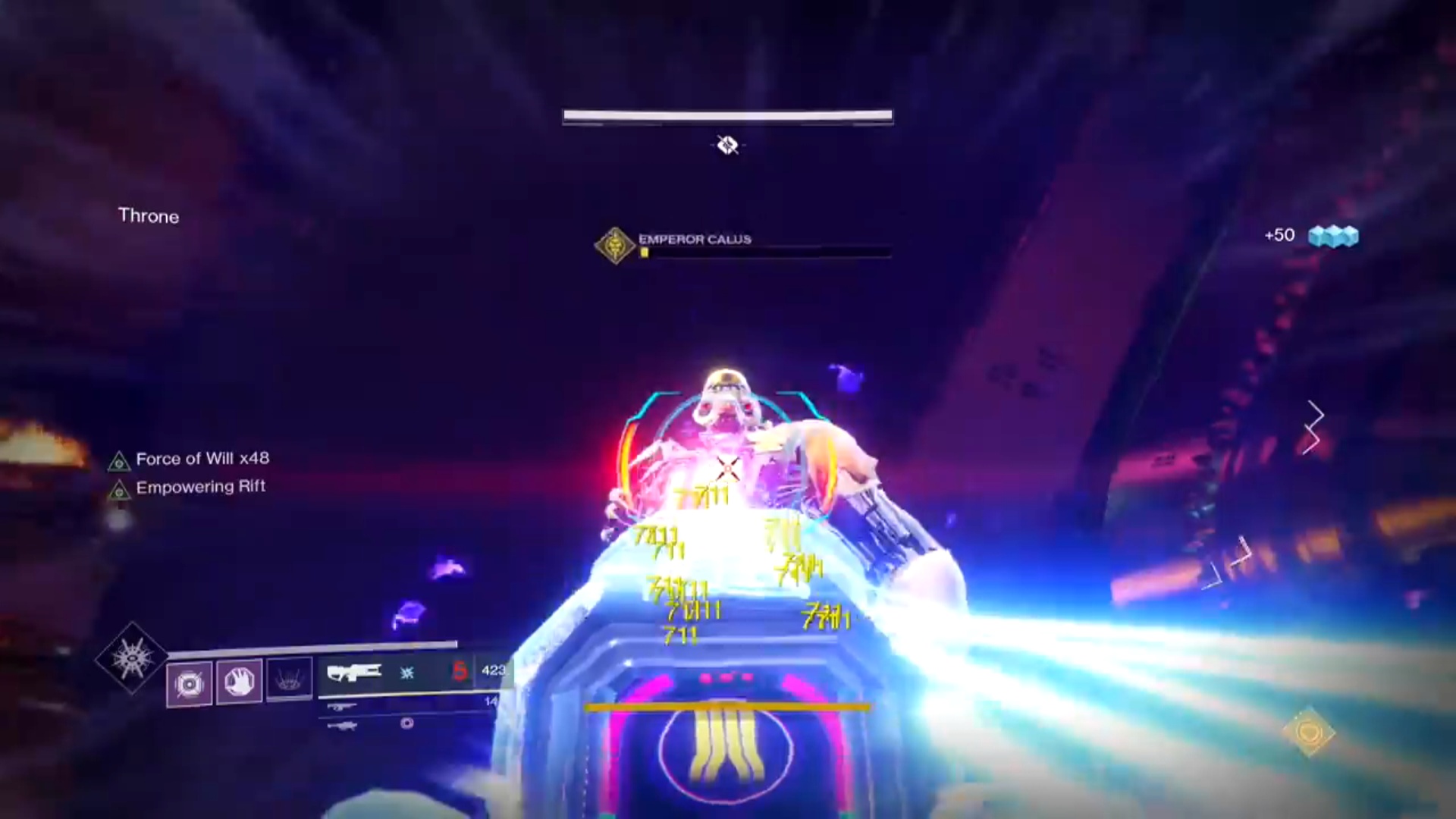 The players teleported into a projection room will need to alert the players into the throne room what number they see on their end. Whatever number did not come up will be the first Psion you kill first, which will lower the barrier around the Emperor Calus projection head.