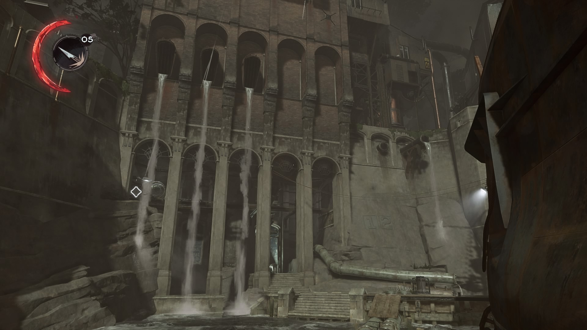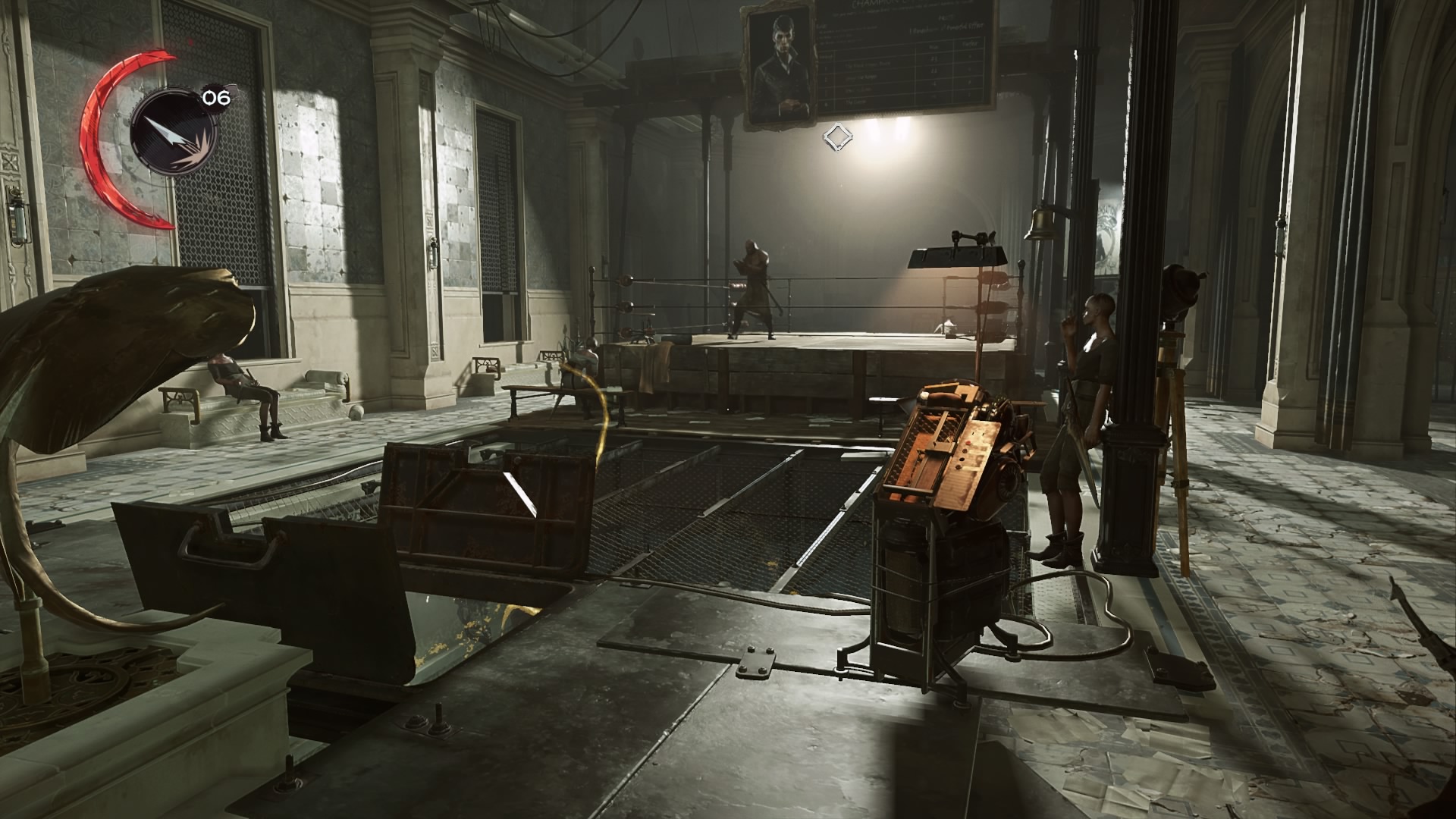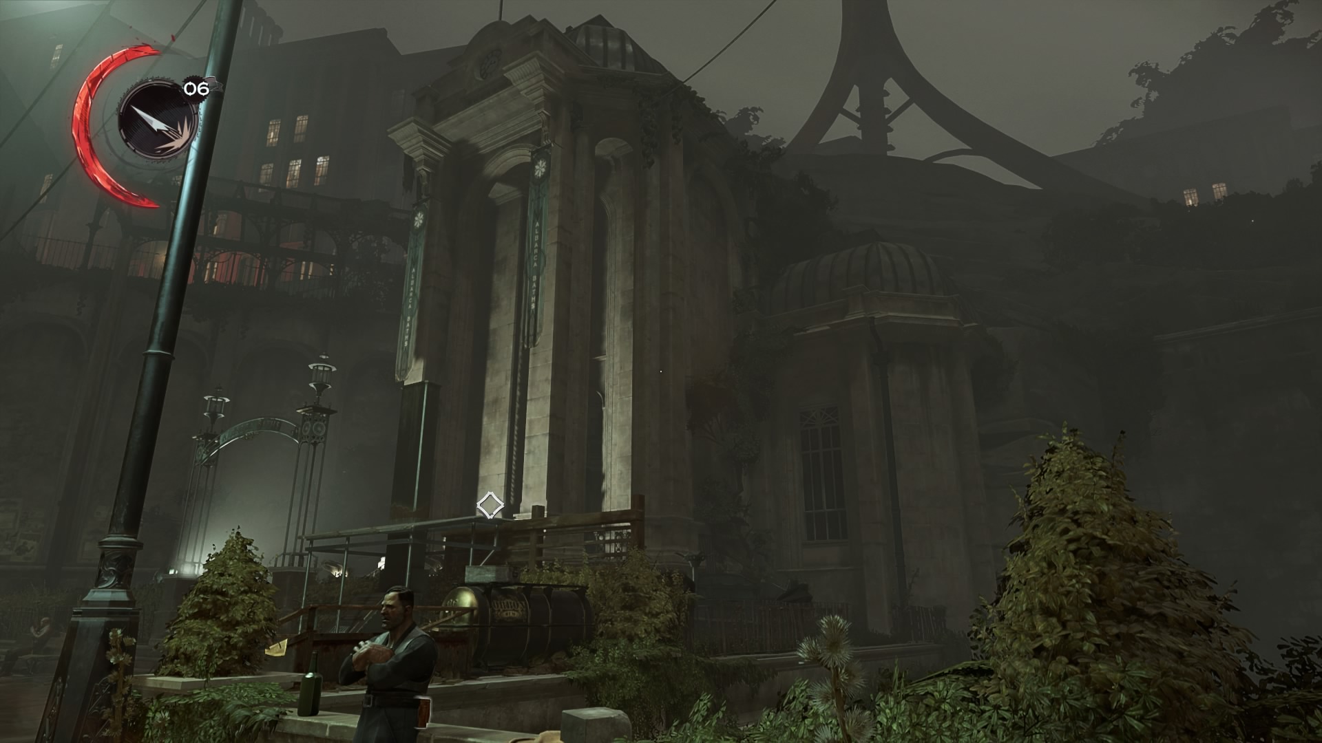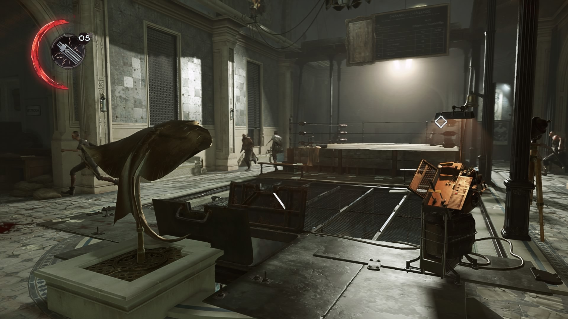 Use the switch and Daud will be able to escape. The Eyeless will scatter, and the city guard will invade the bath house. The only way out is through the front door. Don’t go up the main stairs, instead backtrack to the balcony hallway and wait for the patrolling guard to walk out the bar area. Hide in the upper area of the optional room.