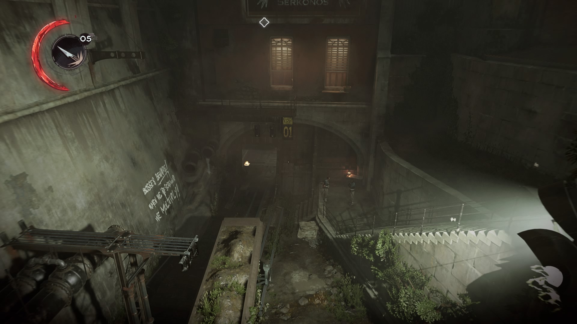 You can knock out or leave the guards alone. The main entrance will clear out when the guards see the house is clear, and you can sneak left and drop into the railway tunnels. Go through the door, jump onto the train car and onto the pipes. The rest of the way should be a cinch.