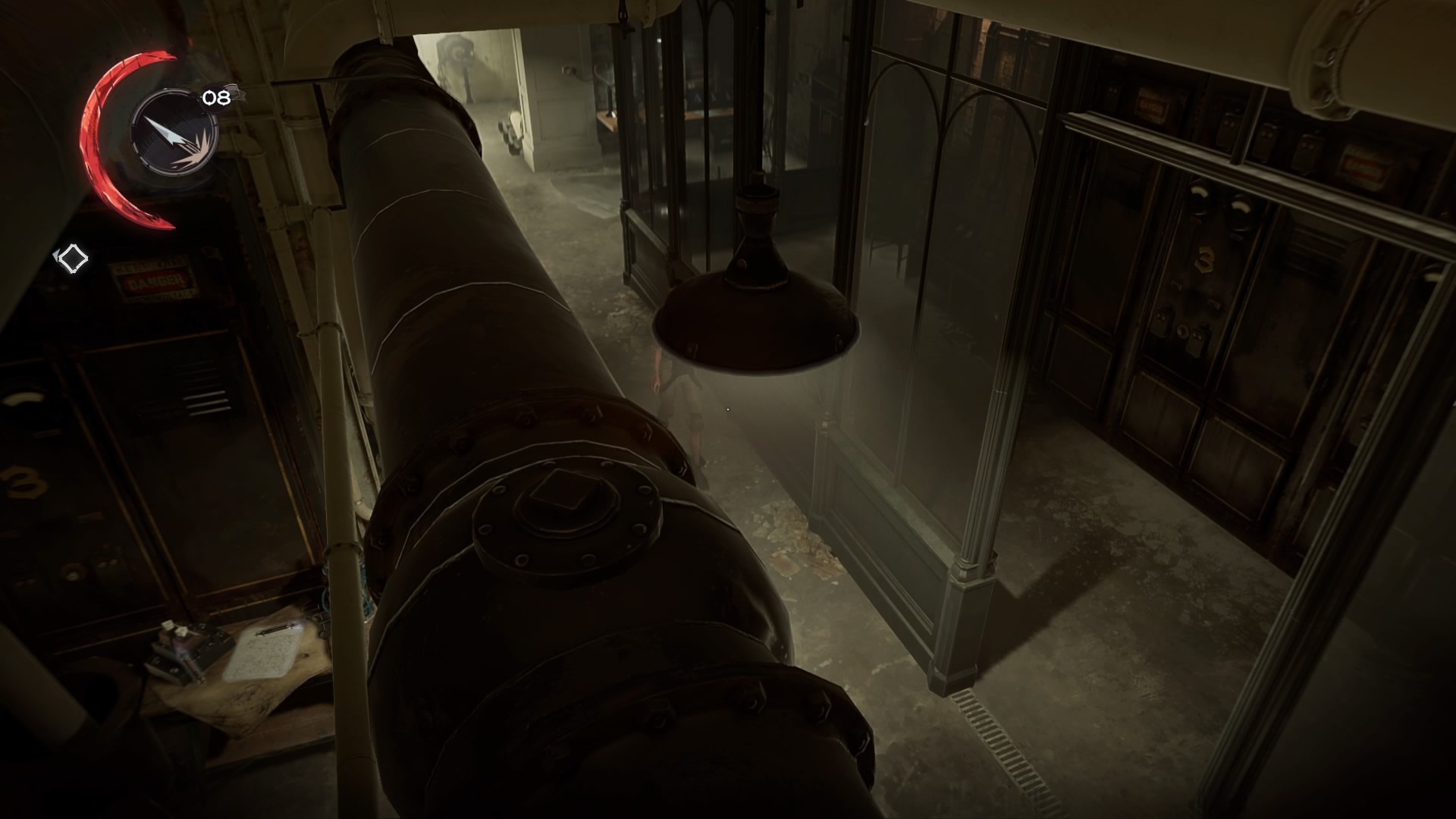 Now you’ll need to get to Jeanette without being spotted. She’s found in the office at the end of the hall, the one with the interior windows. In the middle room, there’s a small work closet where you can climb up into the pipes above the furnaces and steam machines, making it very easy to ambush guards or sneak around them.