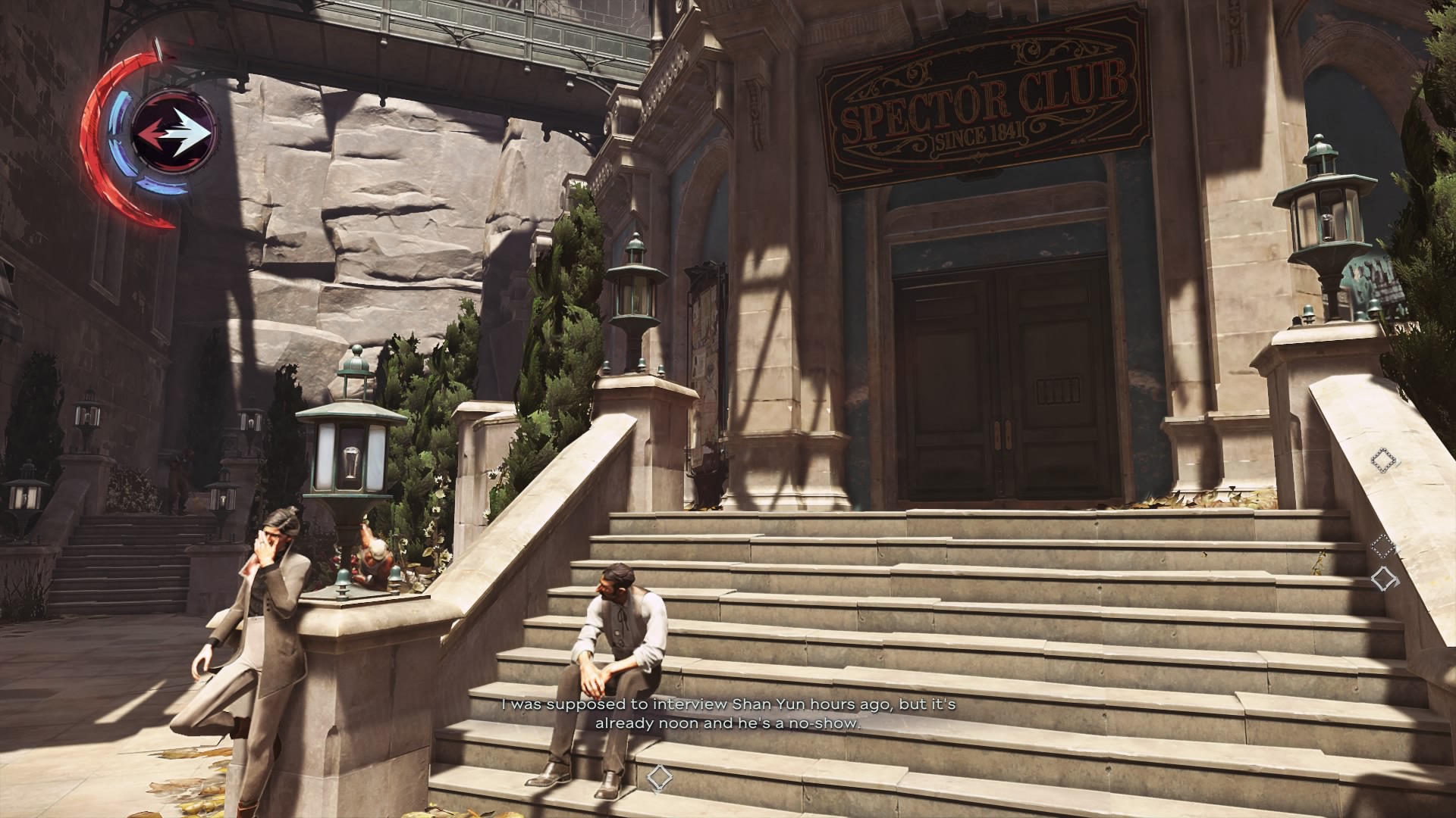Outside, escape the bank using the high balconies to the right (as you leave, opposite side from your entrance) — outside the bank, she’ll go right and up onto the terrace. There’s a Veteran Guard immediately through the double-doors to the alley, so watch out. On the terrace, wait until the contact arrives. It can be awhile.