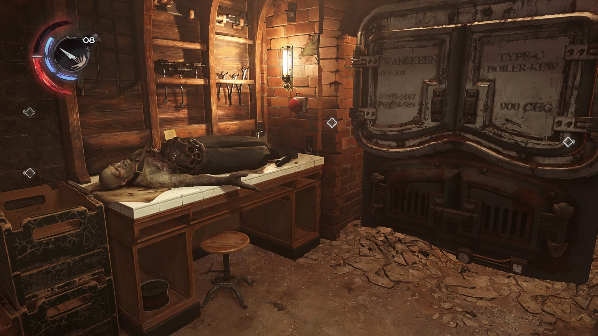 Go upstairs to find the rich patrons siphoning blood from the dying brother. Enter the back room behind the sitting patrons, knock out the doctor inside, and turn the valve to remove the blood draining machine from the innocent brother.