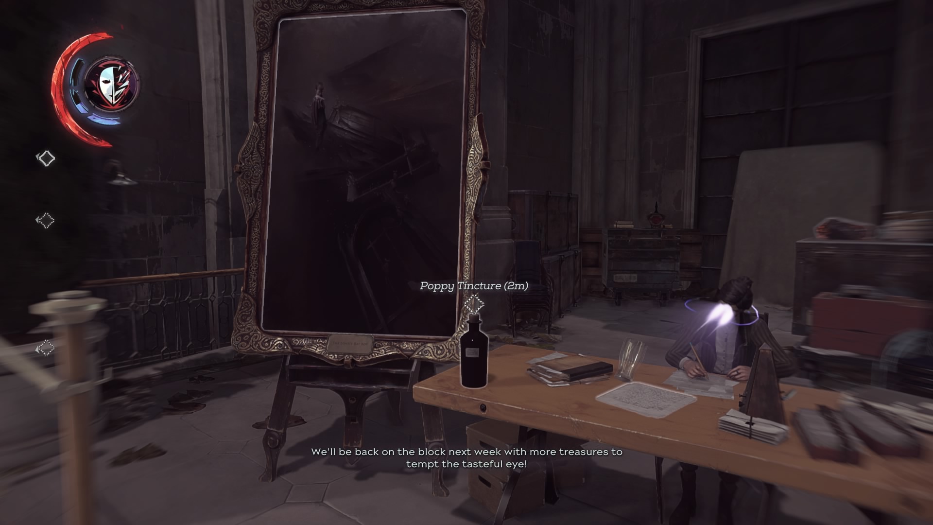 When the prompt appears, choose to bid on the estate. Continue to bid until you win — it’ll only cost about 360 gold. At most, you’ll have to pay 500 coin. That’s cheap for this helpful method into the bank. Take your tincture bottle and the painting before leaving the auction.