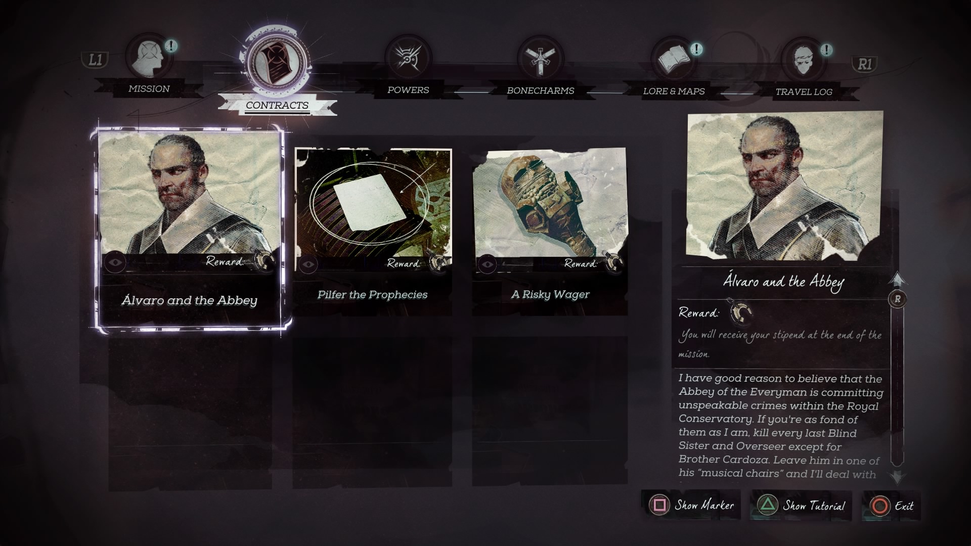 Contracts, normally, are added to your inventory from message boards in the black market. Not so in Mission 4. This time, the contracts are automatically added to your mission clues menu — two of them are pretty simple, you just need to collect very special items from hidden locations. One is an artifact in a booby-trap filled apartment, the other is in the lift at the far back of the Royal Conservatory. Check out the screenshots and quest details for more info.