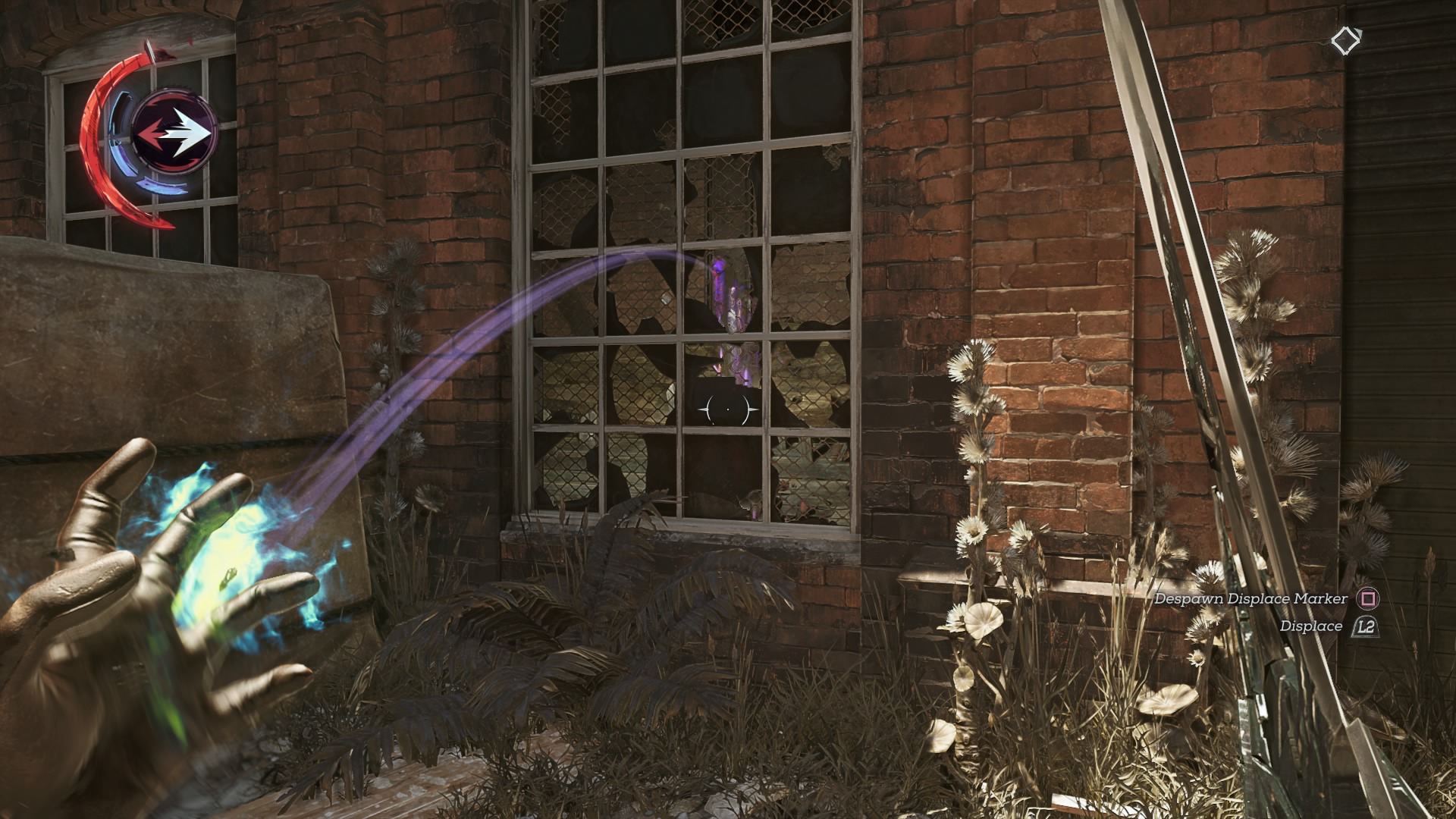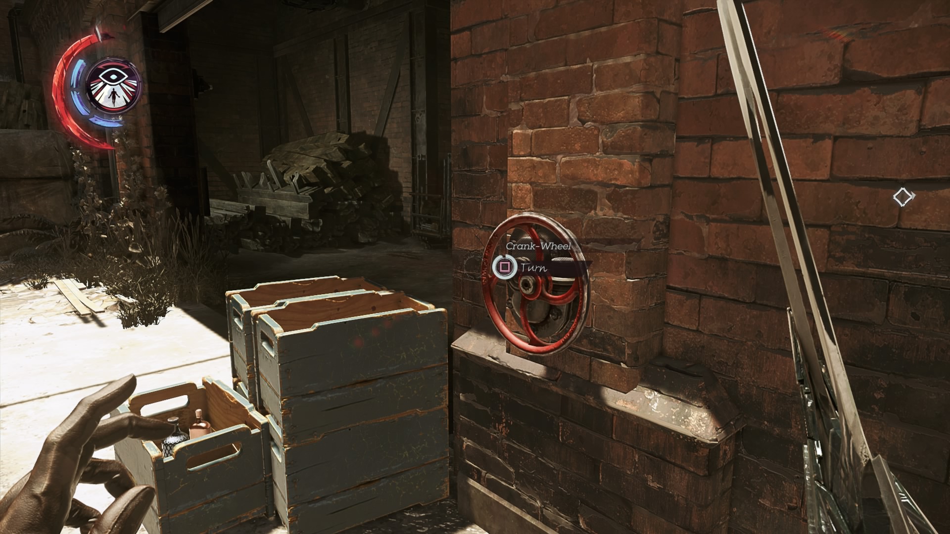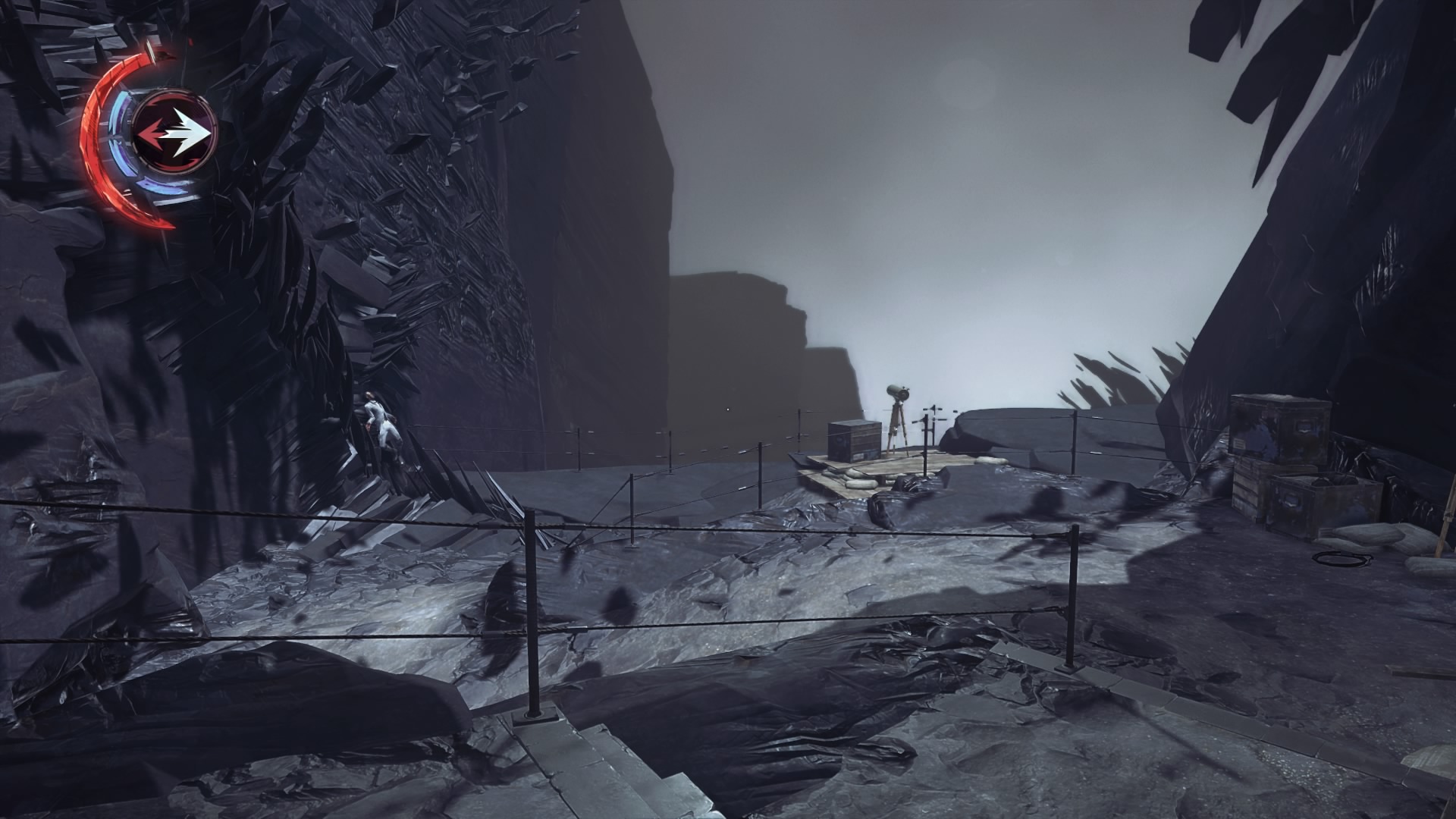 Ahead, you’ll find the central lift that will take Billie up and into the mines. The lift itself is locked, but there’s an optional path that won’t require a key. Go to the garage door in the back and prepare foresight — turn the wheel and use foresight to set a displace marker through the broken window. The garage door closes too quickly to get through otherwise.