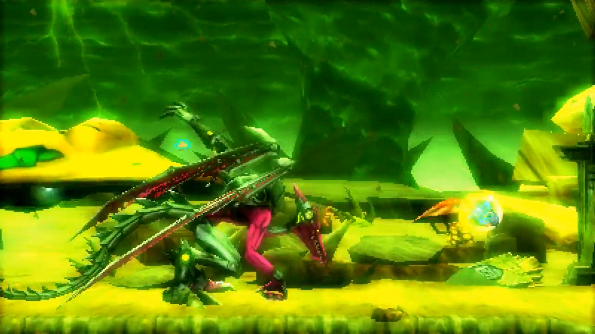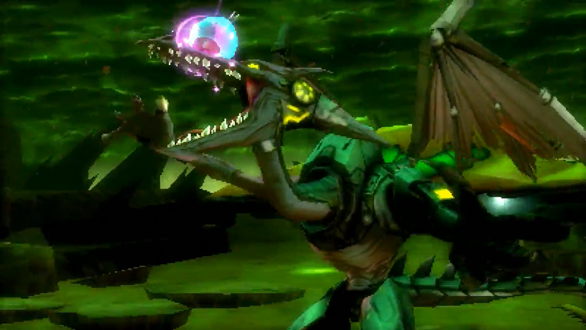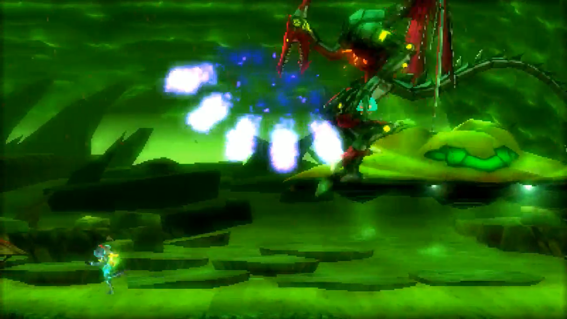 The tiny Metroid joins the battle to help Samus! The little critter infuses Samus with about 200 health, or two energy tanks worth. Ridley is much more aggressive — while on the ground, her claw attack is much more powerful. Her fireball hasn’t changed, though.