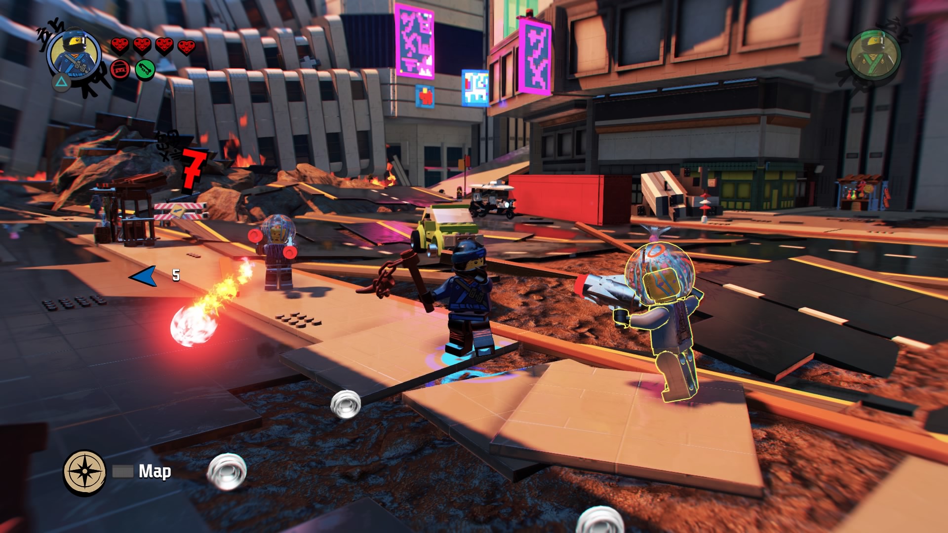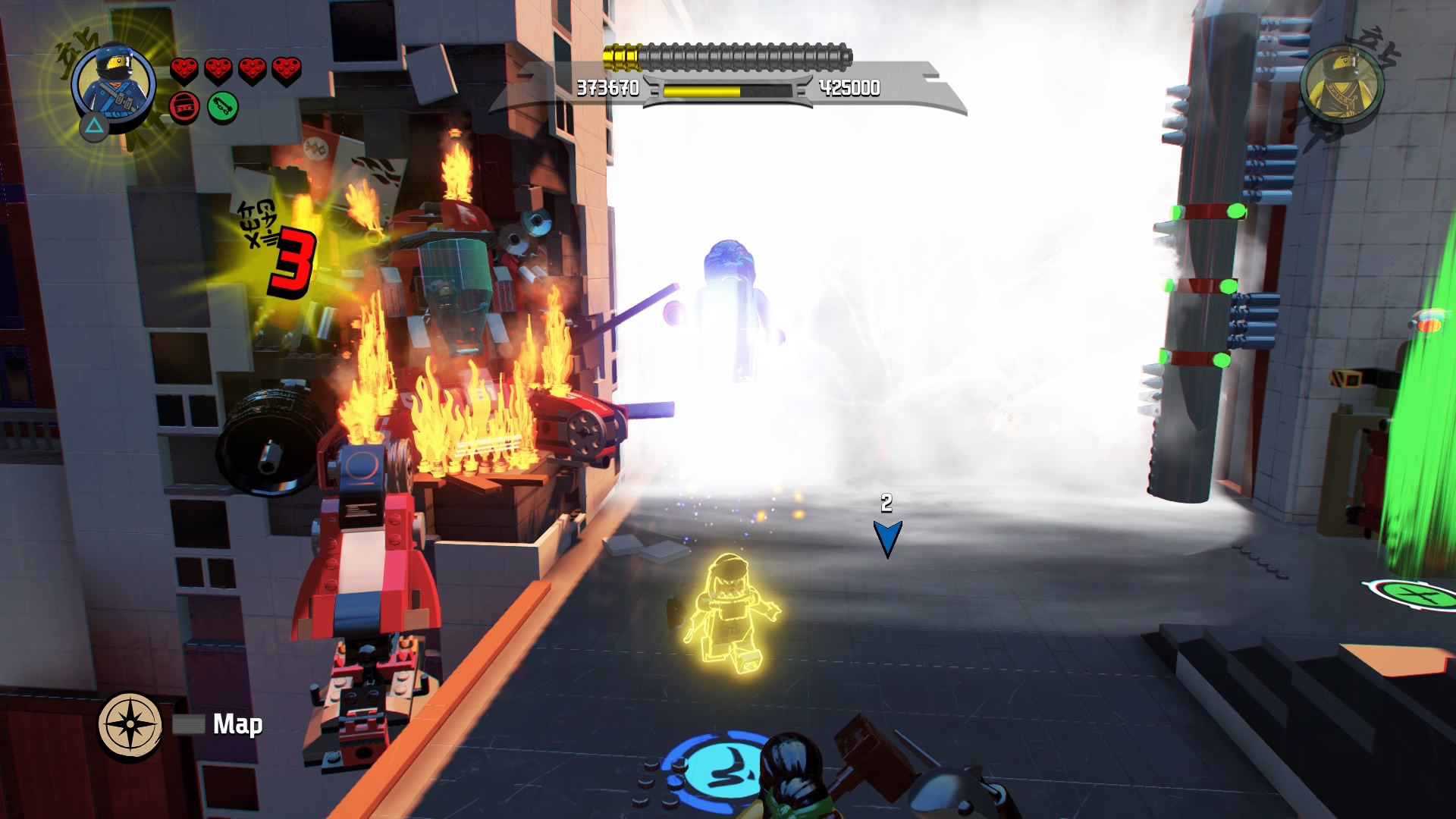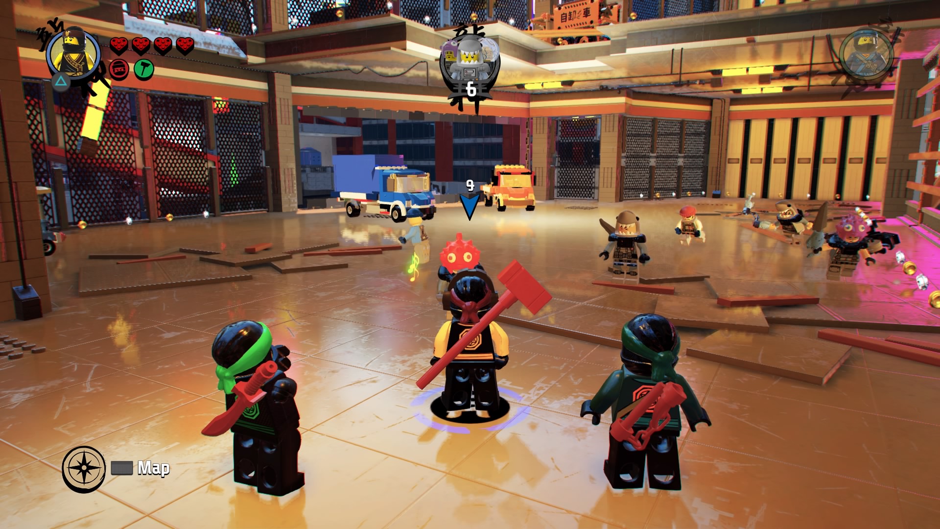 The missiles will destroy one of the display cars and leave behind a pile of hopping bricks. Build them into a weapon, and use Jay to activate it! That’ll get rid of the Shark Army VTOL and create a bridge you can use to exit. Run across the fallen building to reach Kai. Defeat the goons, and then look right for a hammer marker – use Cole and then Multi Build right, then left. On the right, you’ll put out a fire covering a stud bonus reward. On the left, you’ll put out the fire and save Kai.