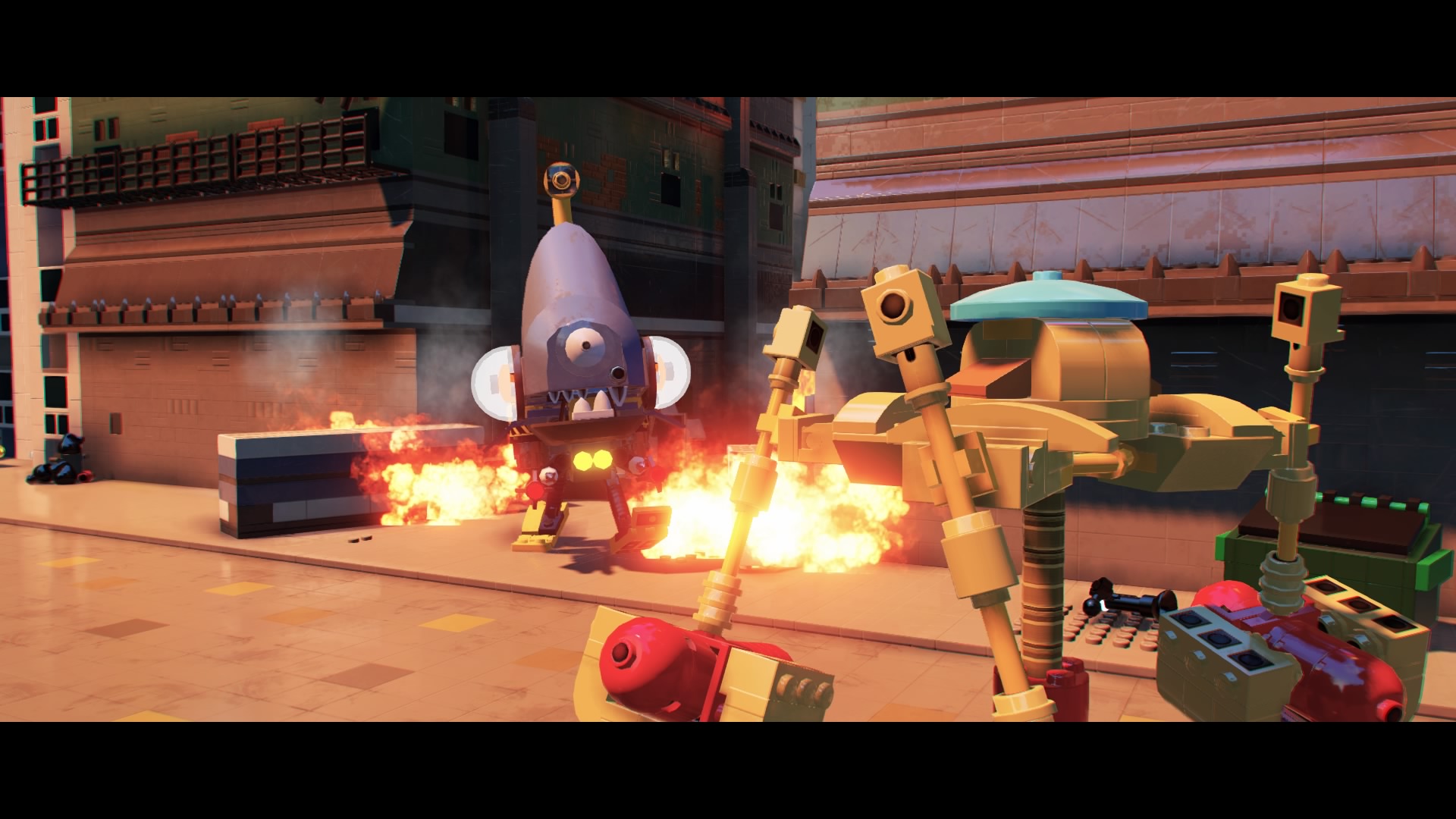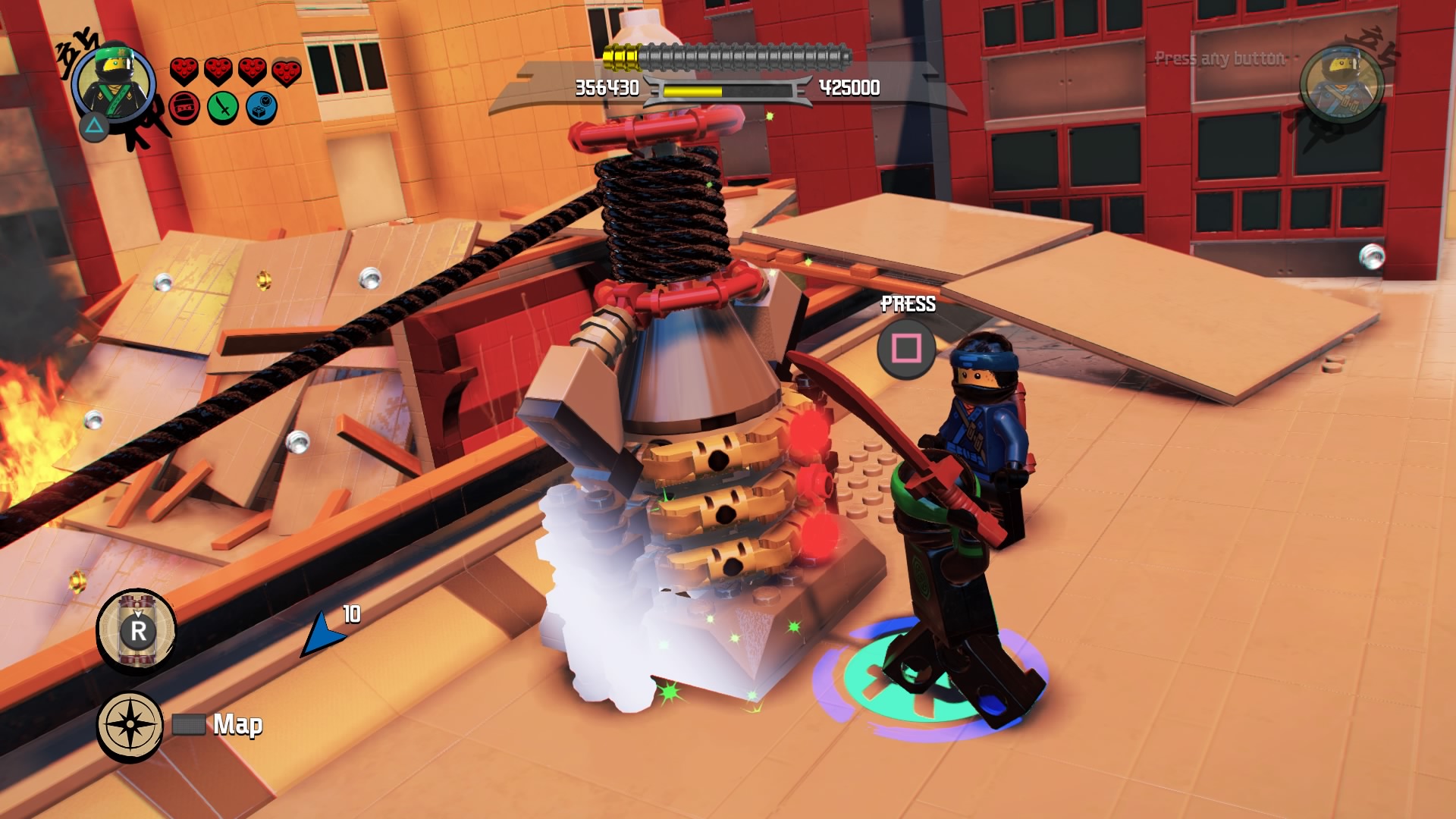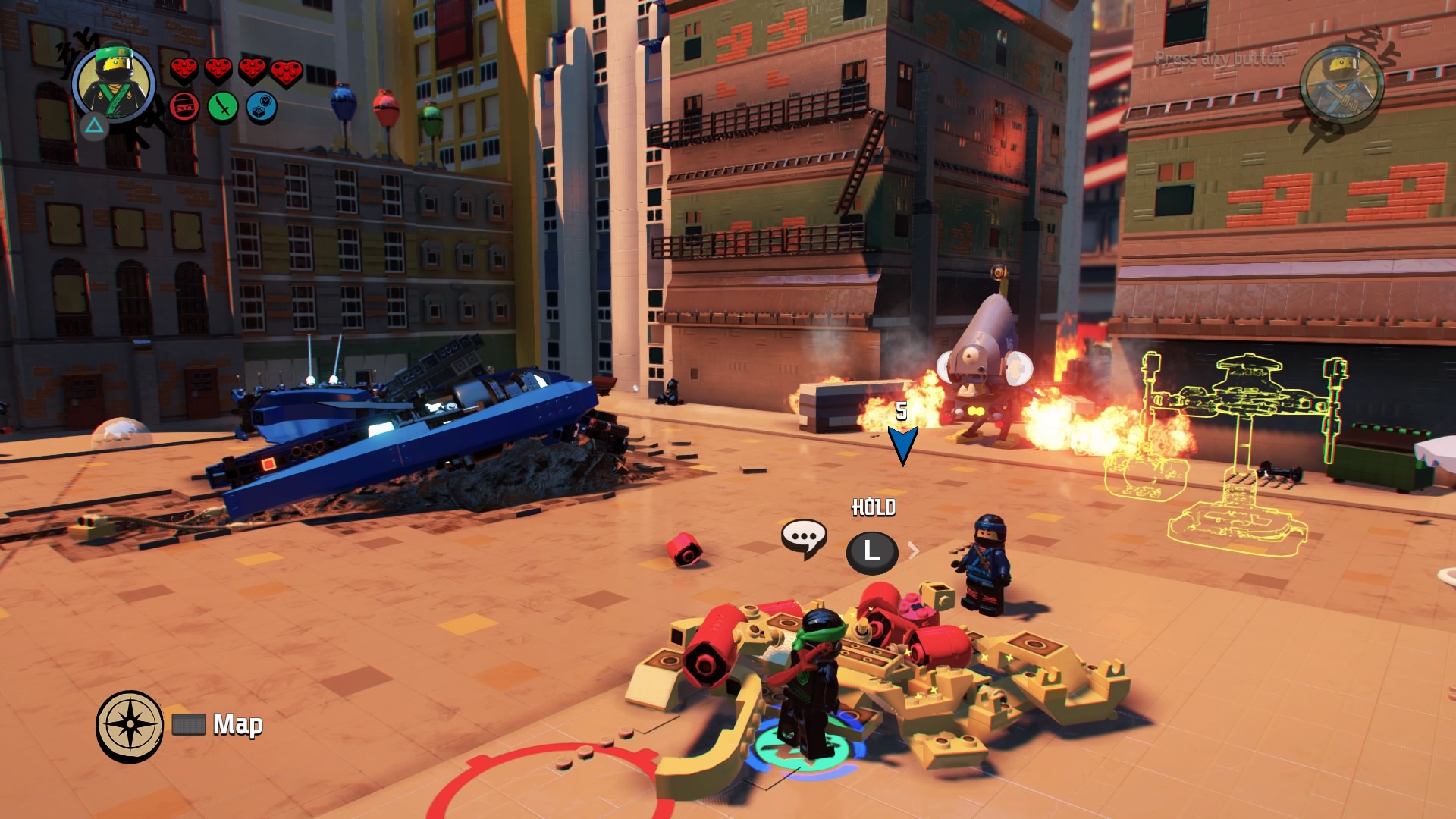 The missiles will destroy one of the display cars and leave behind a pile of hopping bricks. Build them into a weapon, and use Jay to activate it! That’ll get rid of the Shark Army VTOL and create a bridge you can use to exit. Run across the fallen building to reach Kai. Defeat the goons, and then look right for a hammer marker – use Cole and then Multi Build right, then left. On the right, you’ll put out a fire covering a stud bonus reward. On the left, you’ll put out the fire and save Kai.