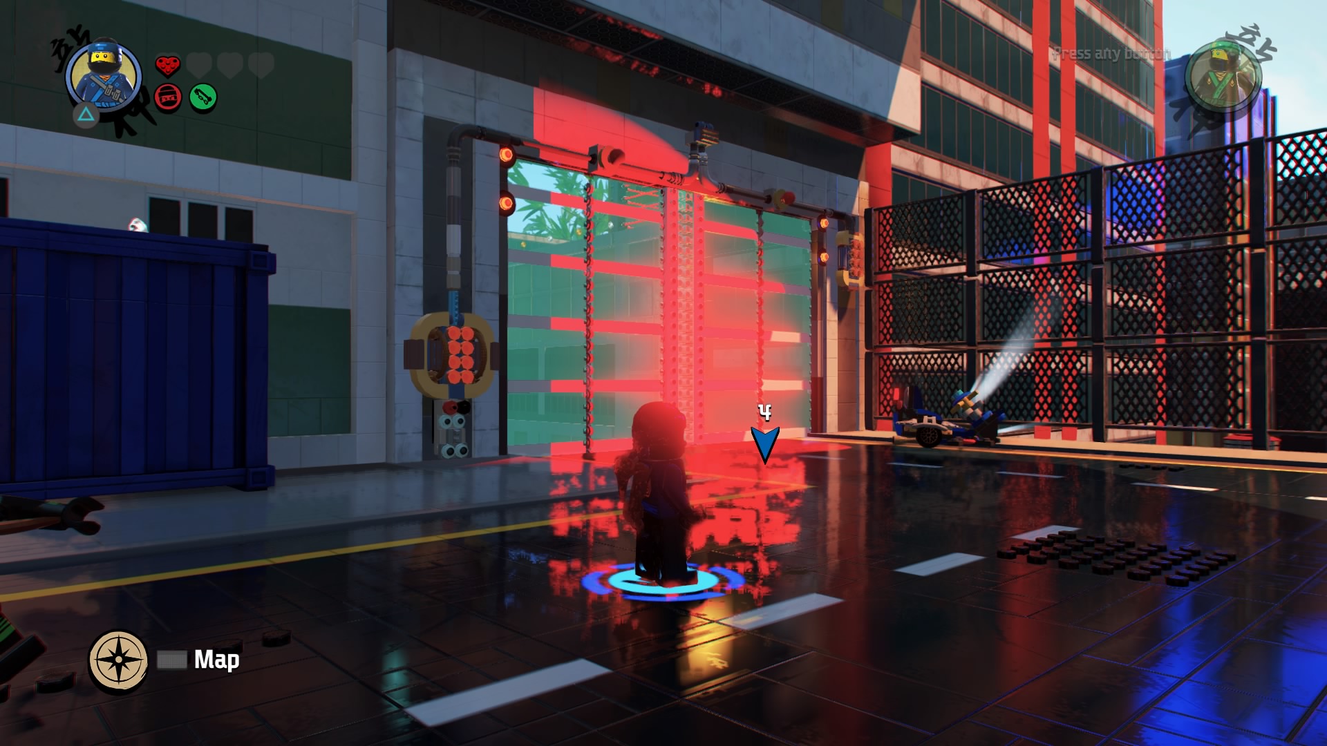 Keep going down. There are lots of interactables we can’t use yet! Just follow the street down to a blue gate that’s locked. Smash the two LEGO engines on the left and right and build both piles of hopping bricks so Jay can use the green marker. Ahead, you’ll find Zane trapped in his mech.