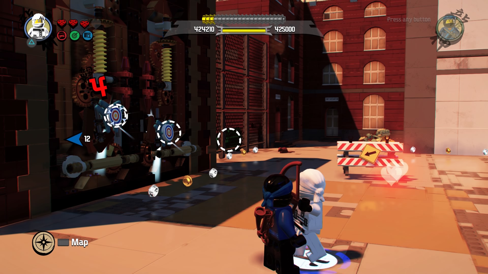 The Shark Army has taken over the city! They’re rounding up civilians, stealing stuff, and generally causing problems for everyone. For this level, you’ll take control of Jay and Lloyd. Wall run up the red wall, then across and swing. Continue toward the courtyard, and a Shark Army mech will appear in the courtyard below.