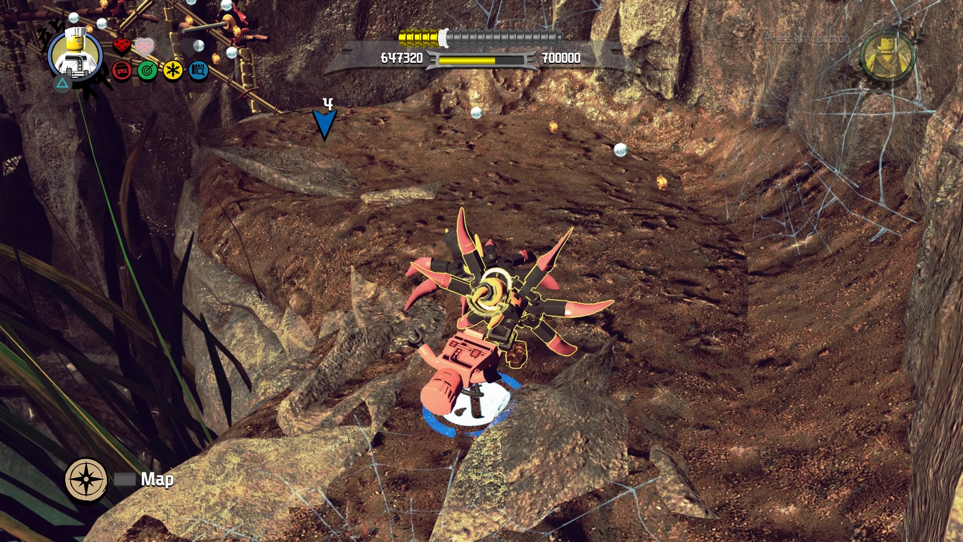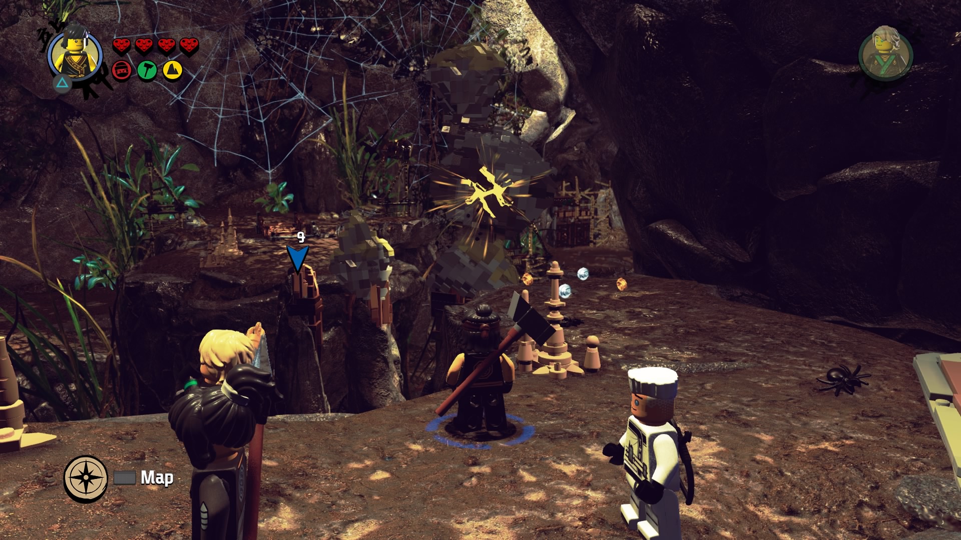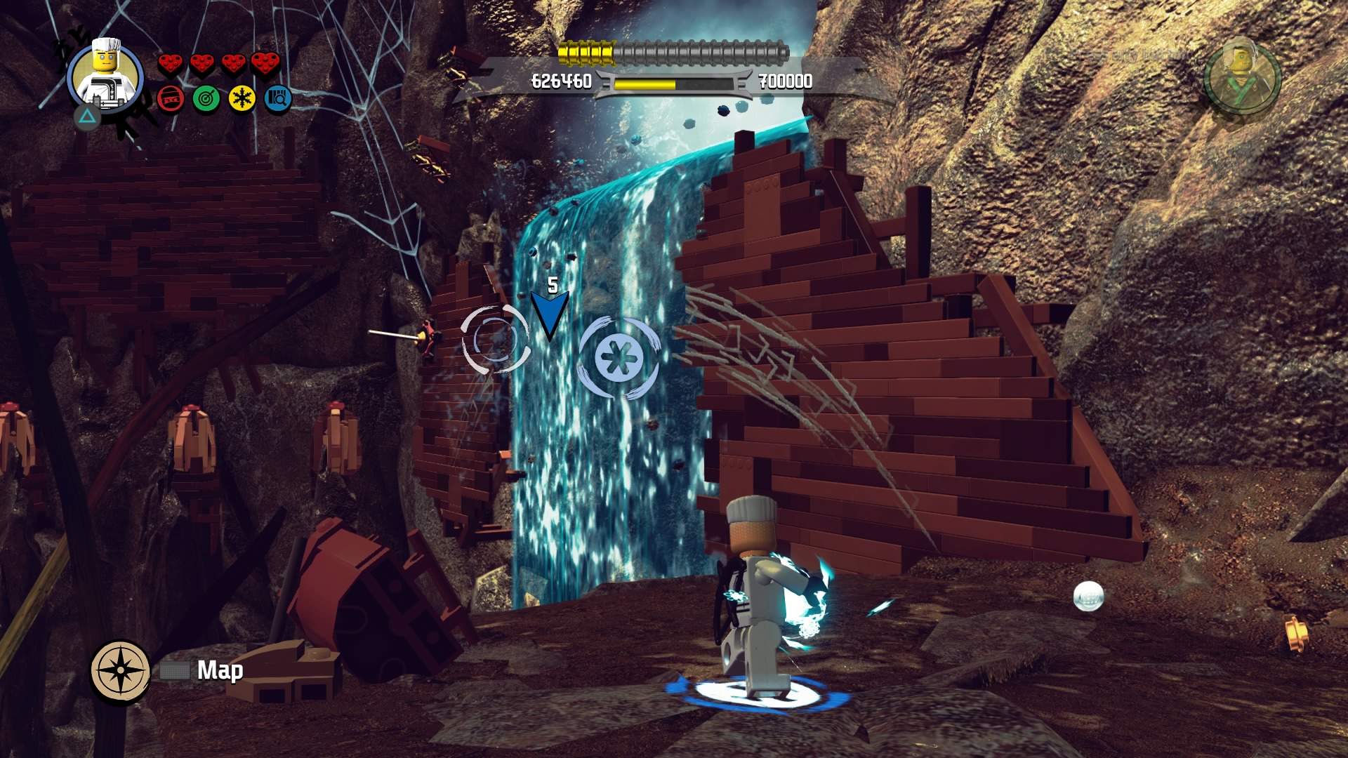 Follow the blue waypoint through the mines, smashing skeletons as they appear. Eventually, you’ll reach a waterfall. Freeze it with Zane’s ice elemental powers. This time you’ll create steps, so Garmadon can follow you up. Turn right and hop across the columns to reach an arena with creepy crawling spiders! Smash them all, then use Cole to break the cracked LEGO object above the stream. That unblocks the waterfall so you can freeze it.