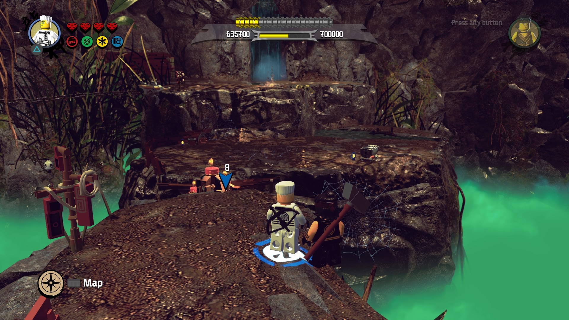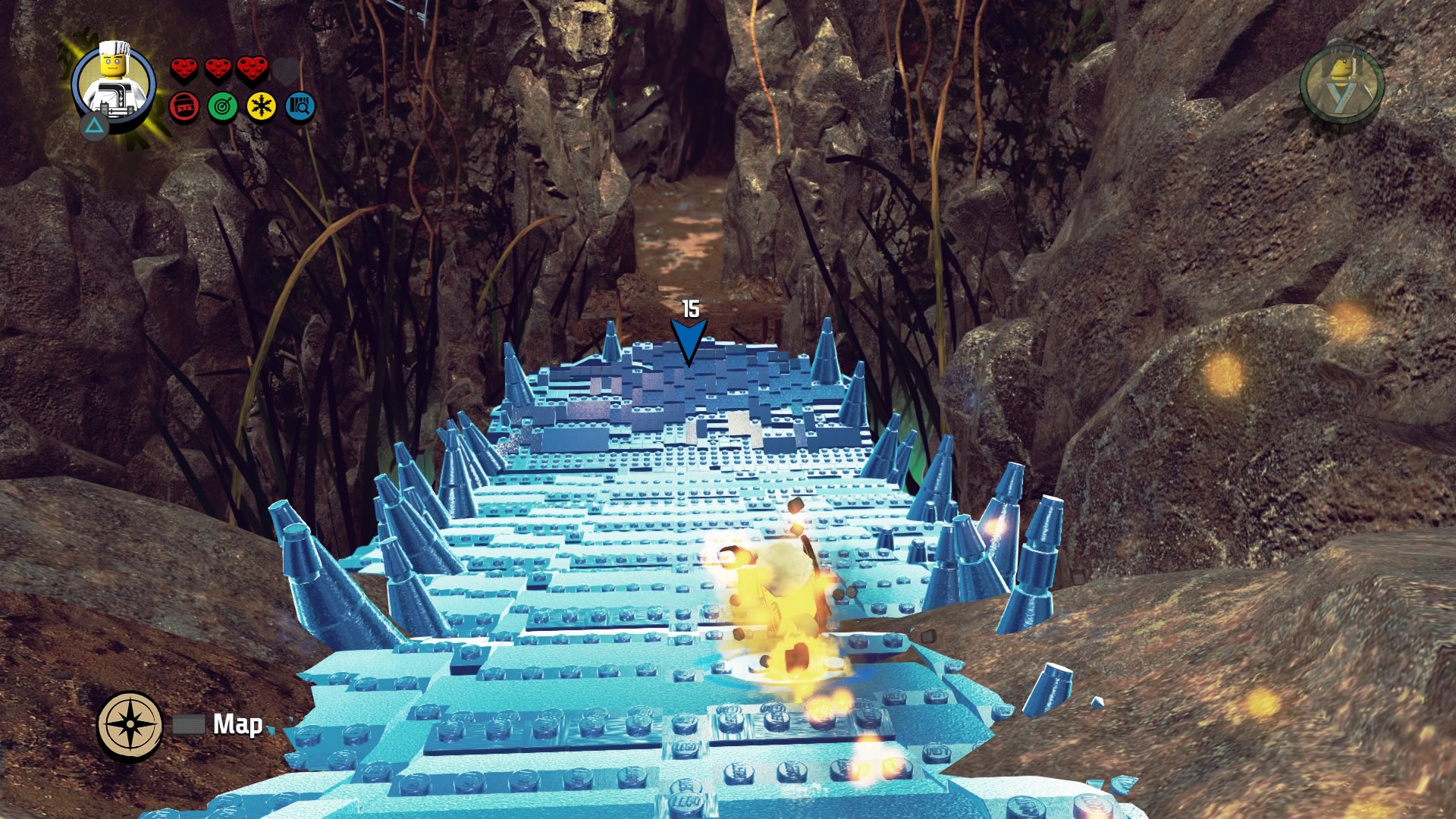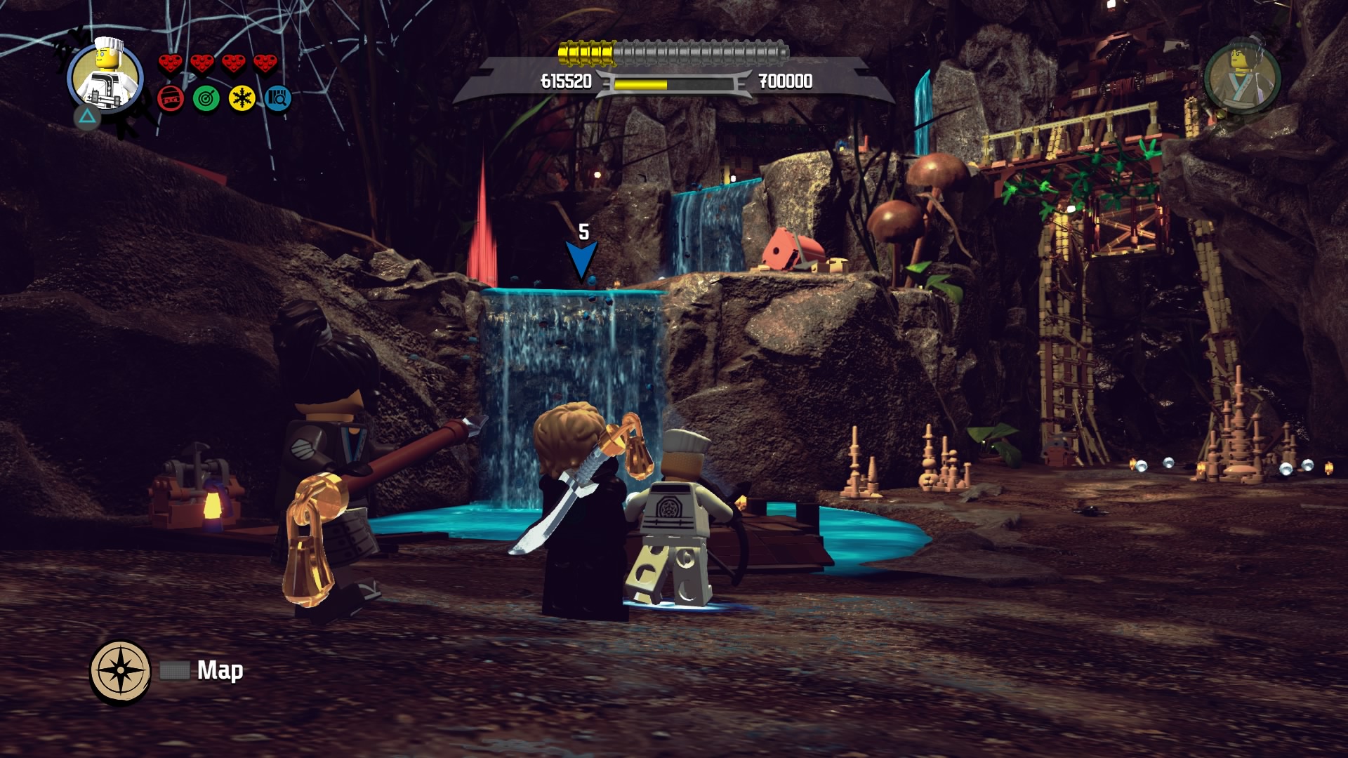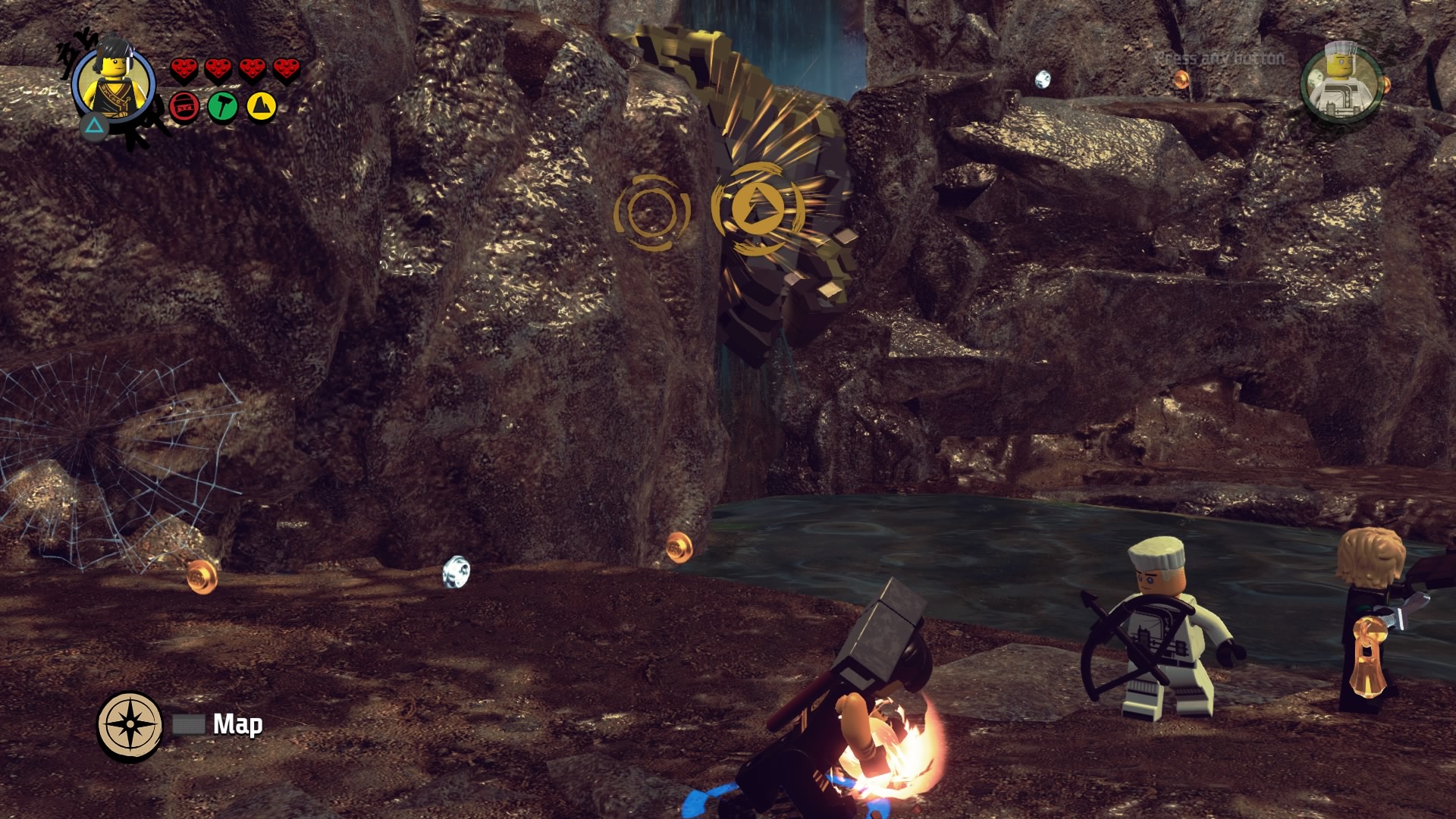 Follow the blue waypoint through the mines, smashing skeletons as they appear. Eventually, you’ll reach a waterfall. Freeze it with Zane’s ice elemental powers. This time you’ll create steps, so Garmadon can follow you up. Turn right and hop across the columns to reach an arena with creepy crawling spiders! Smash them all, then use Cole to break the cracked LEGO object above the stream. That unblocks the waterfall so you can freeze it.