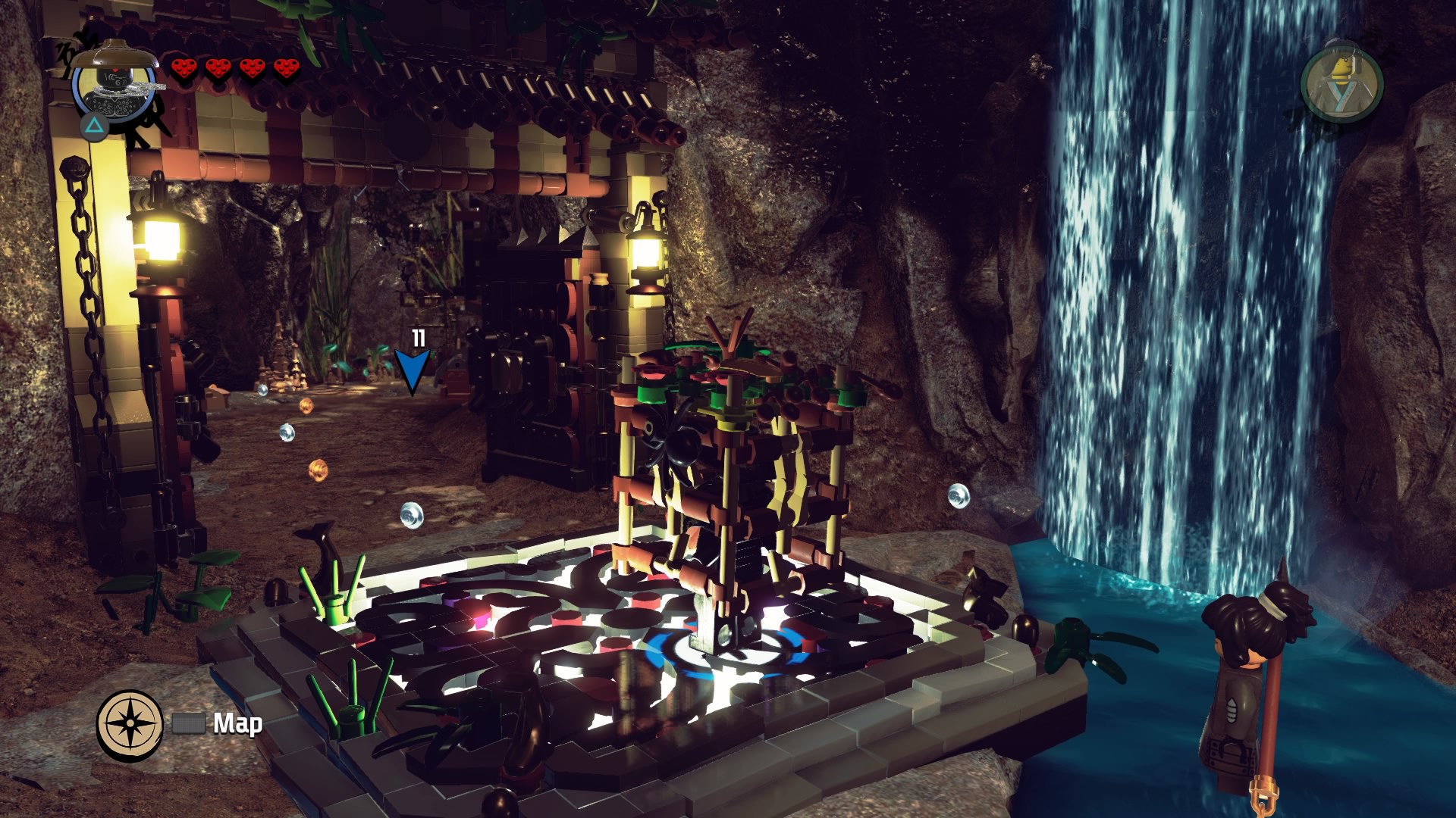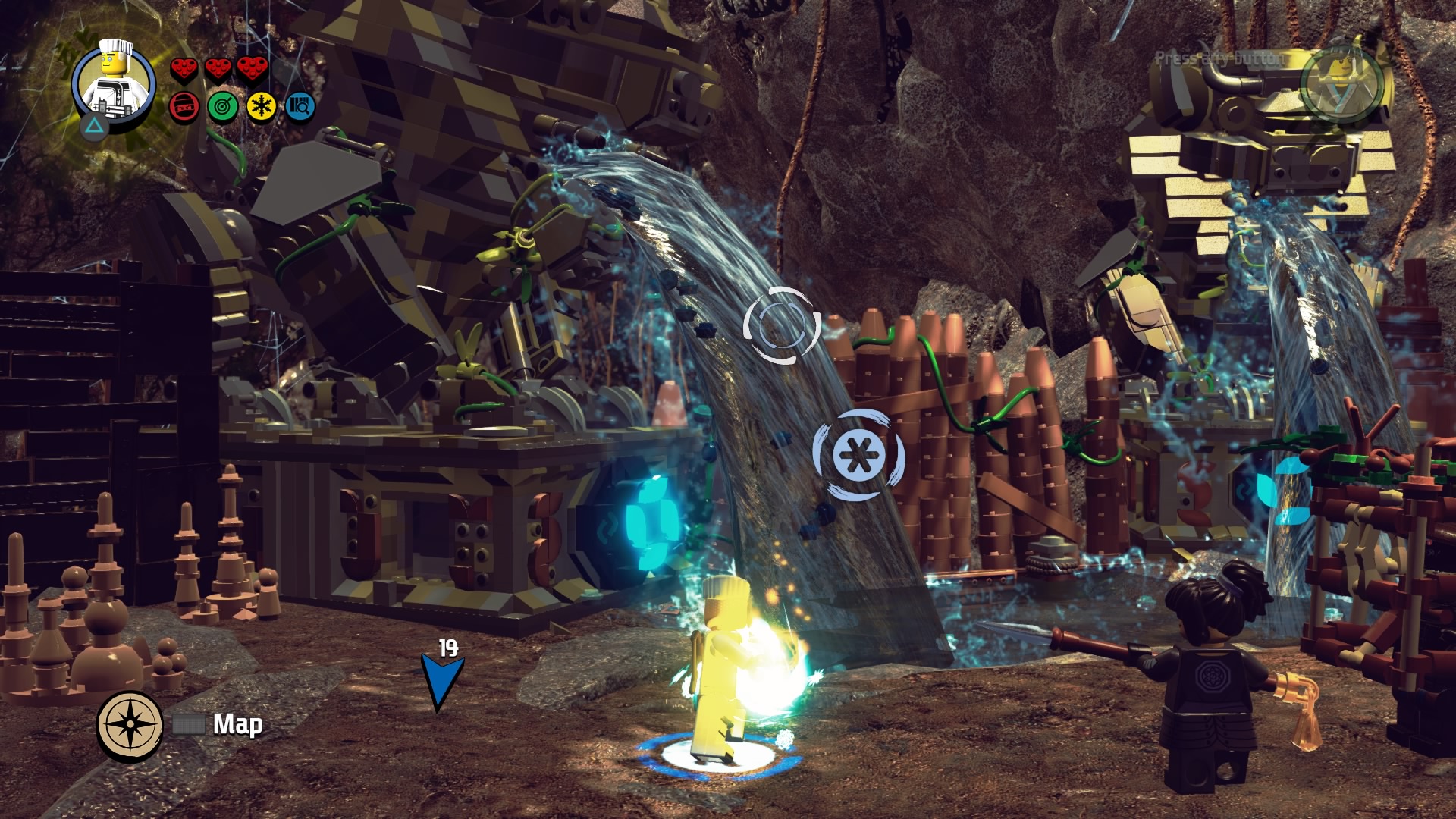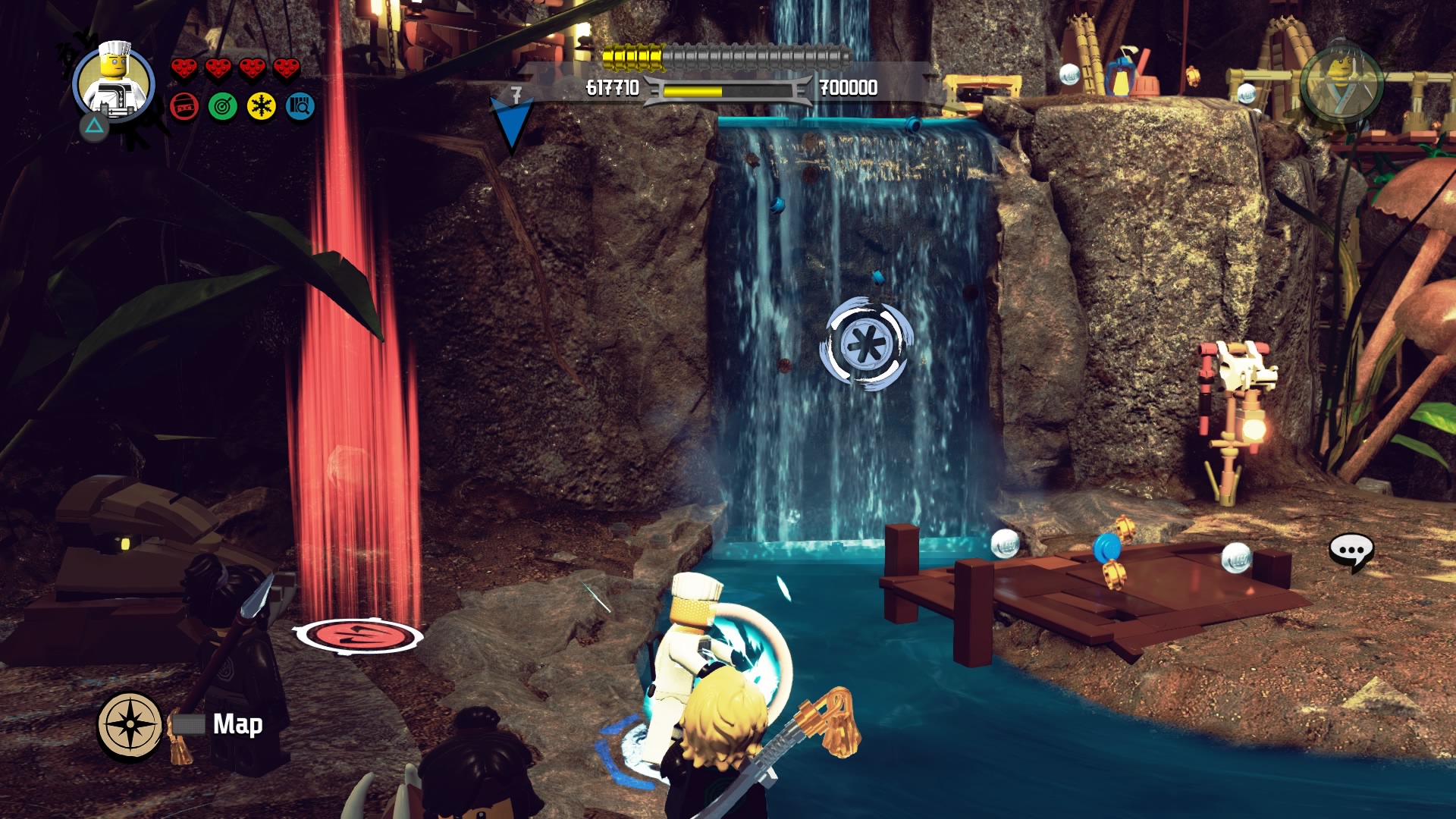 Instead of breaking cracked LEGO bricks, Zane has an ice element spinjitzu. Target waterfalls to freeze them – frozen waterfalls become vertical wall runs! Use Zane’s spinjitzu on the waterfall, and the one above it. At the top, you’ll find a Garmadon Cage Pad. That means you need to get Garmadon up to the pad to open the locked door.