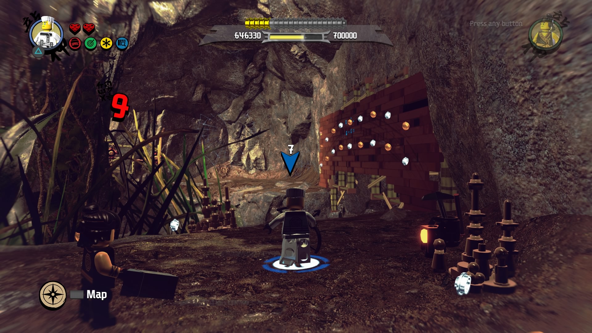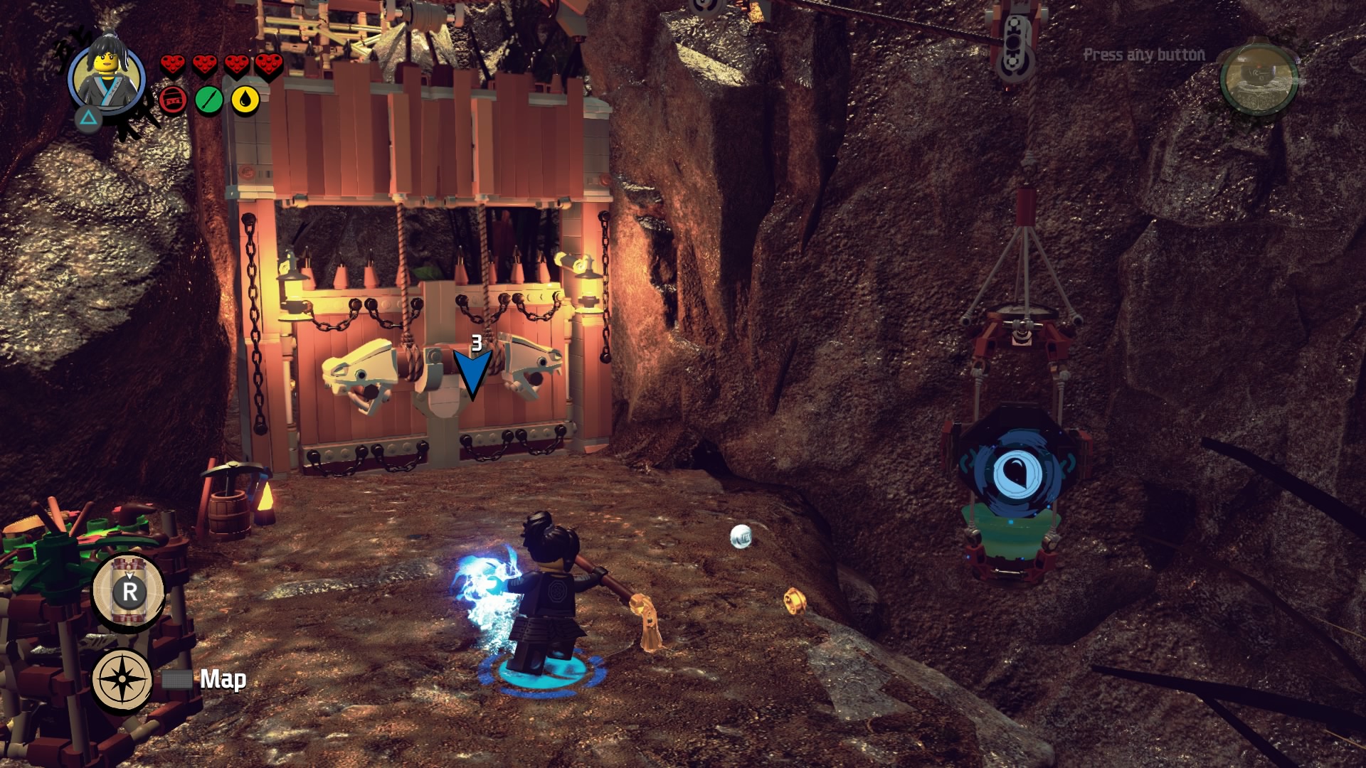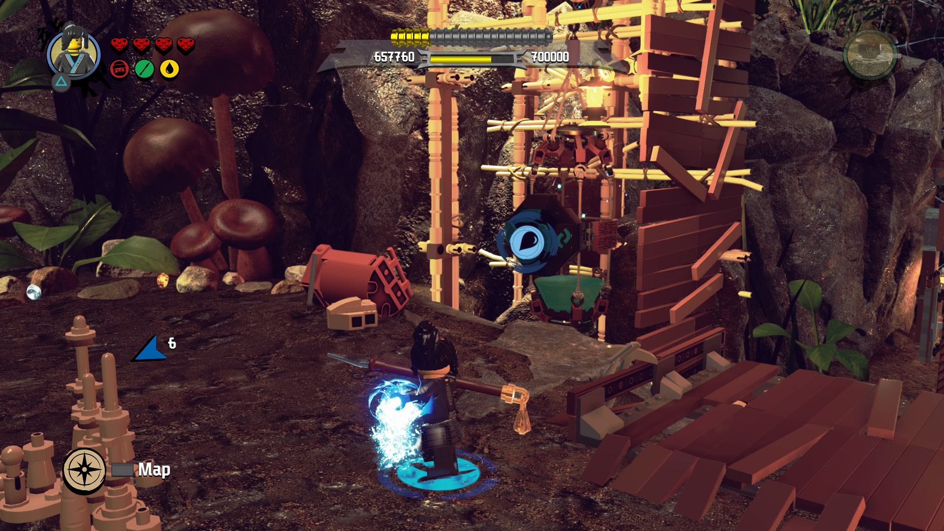 Garmadon can’t wall run, so you’ll have to find a different path. Go to the wooden lift and grapple the LEGO stuff on the ledge to pull it down, then build the hopping bricks. Use any spinjitzu on the the red marker to lower the lift, and use it again to raise it, bringing Garmadon up. Swap to Garmadon and stand on the pad to unlock the gate leading deeper into the ravine.