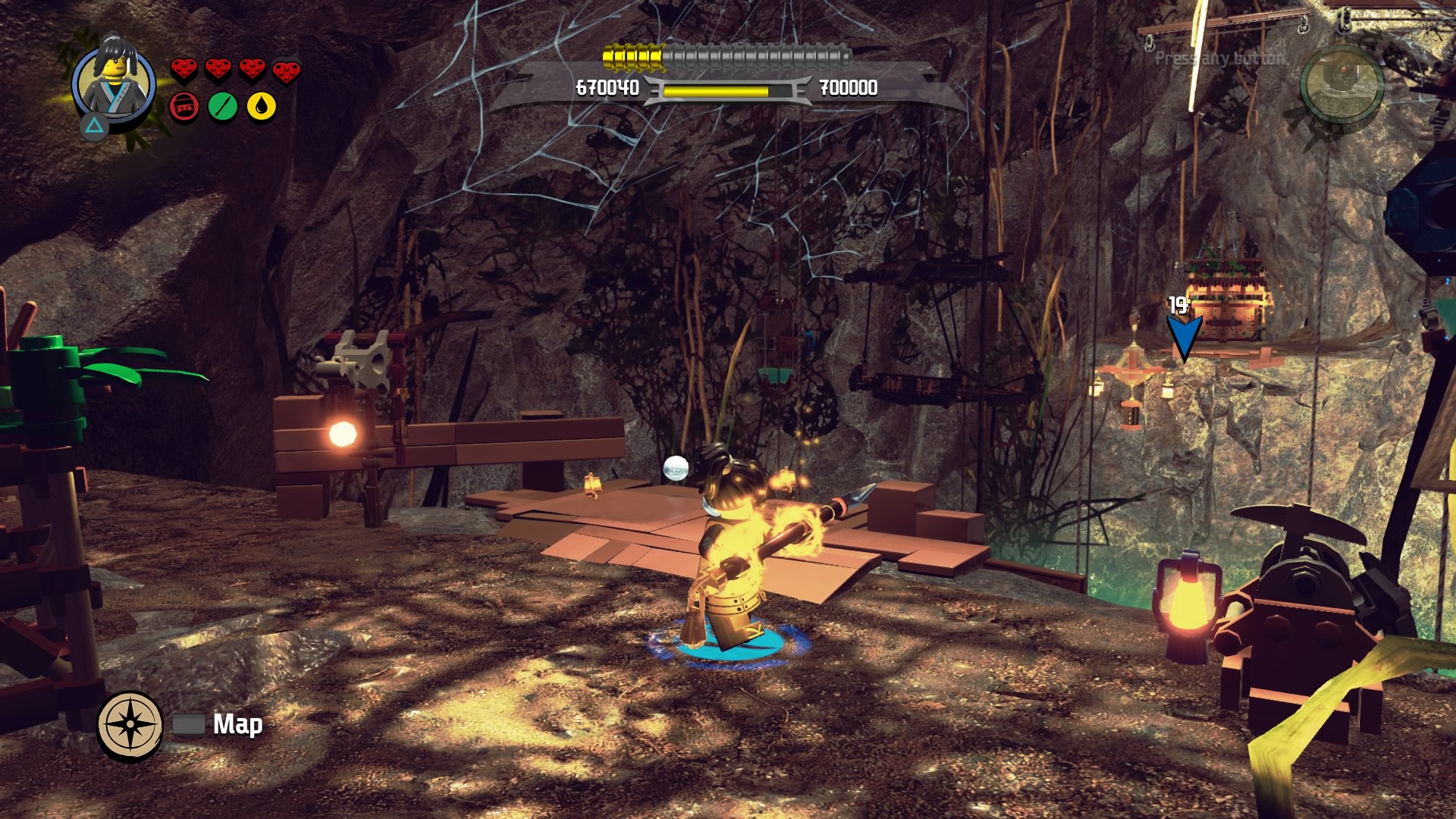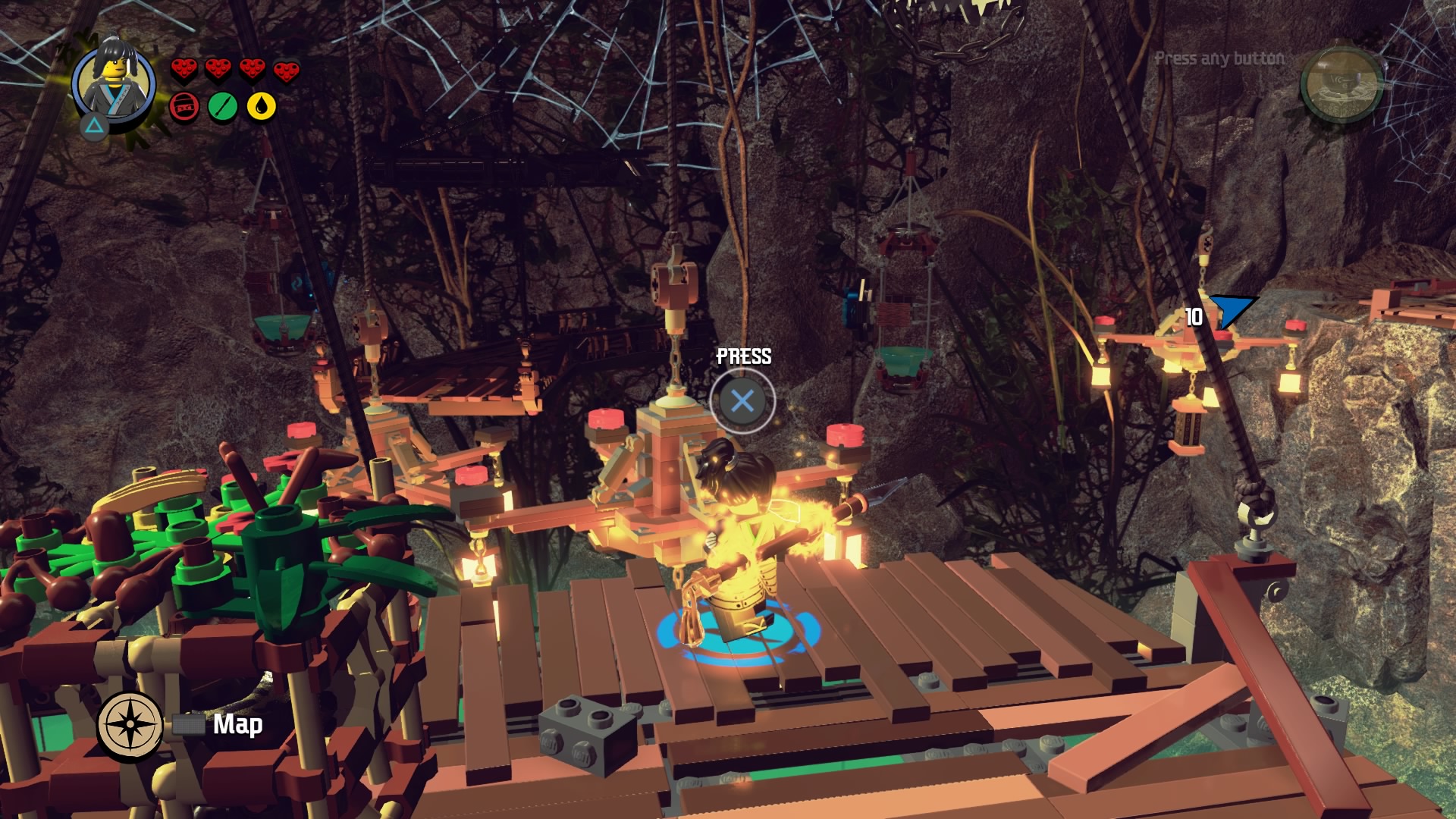 Jump down and cross the bridge, then spinjitzu the red marker to lower the lift. Do it again to hoist Garmadon up. He can stand on the pad next to the rope bridge on the right – it raises another spinjitzu marker. Hit it to raise the lift, and hit it again to ride down with everyone. Step onto the Garmadon Cage Pad to unlock the door to the third room.