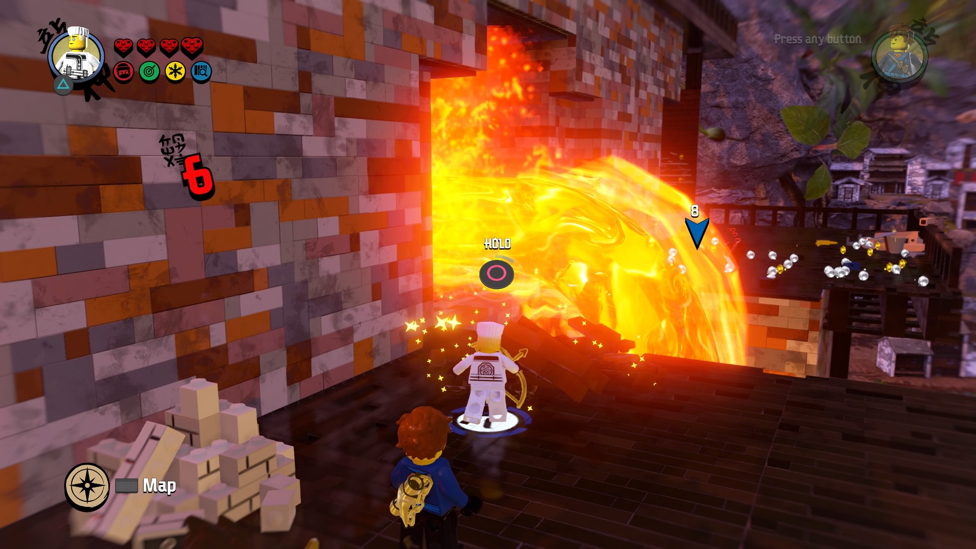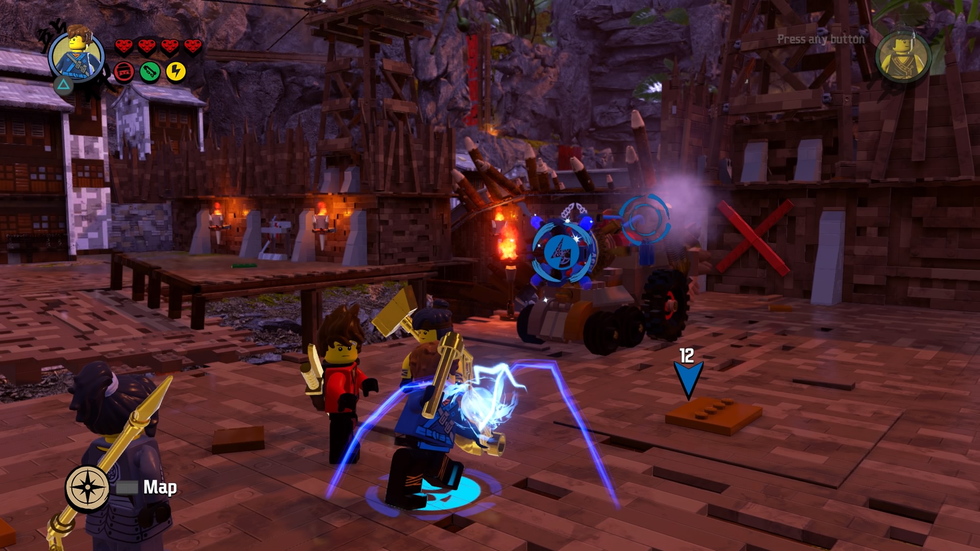 Drop down and charge the last generator with Jay’s lightning spinjitzu. Enter the main city, sliding down the ramp and following the waypoints down the path where everyone is gathered. Too bad the gate is locked. Defeat all the enemies and generals that drop down to reveal a cracked LEGO wall in the bridge. Bust it with Cole’s spinjitzu, then wall-run up and into the hastily constructed village.