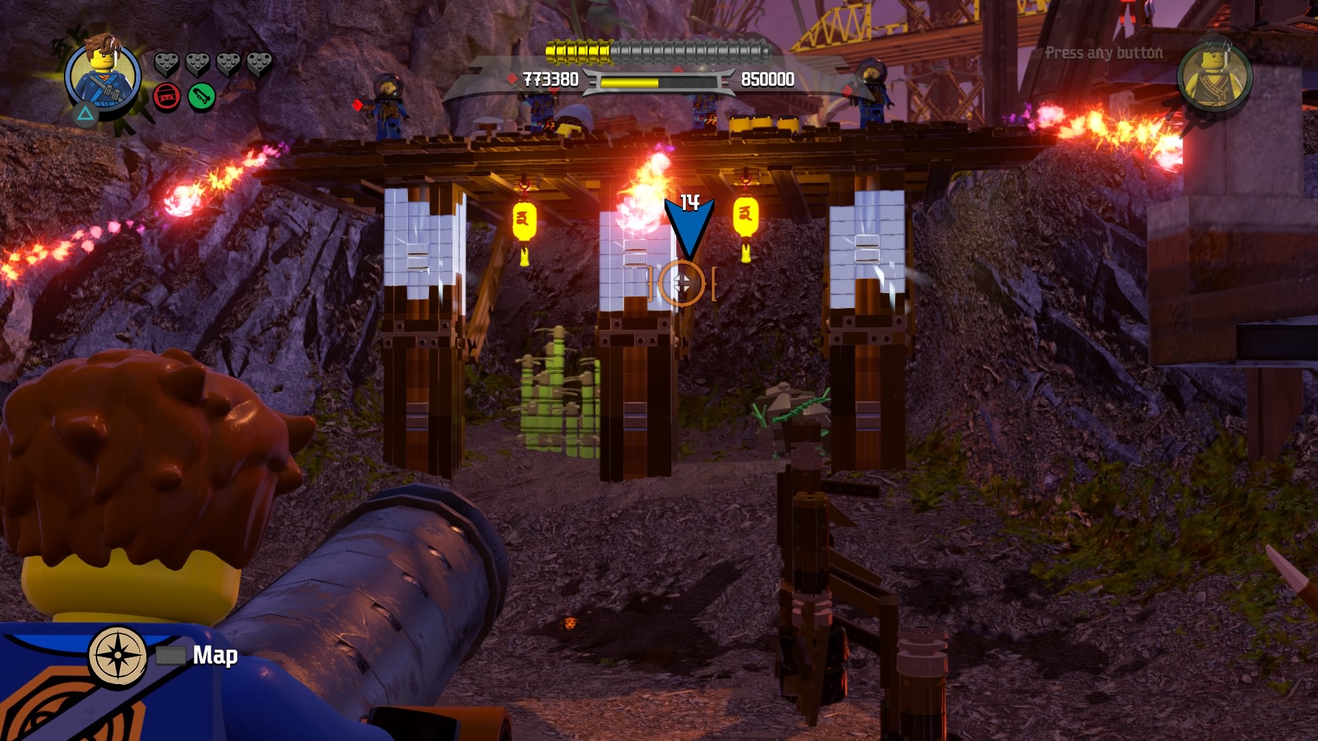 Hop onto a cannon and destroy the silver LEGO supports for the wooden bridge. Shark Army soldiers will shoot at you, so you might want to blast them first. When all three are busted, build the hopping bricks and hop across the pillars to reach the top. Ahead, there’s a lava stream and a huge crane in the far distance.
