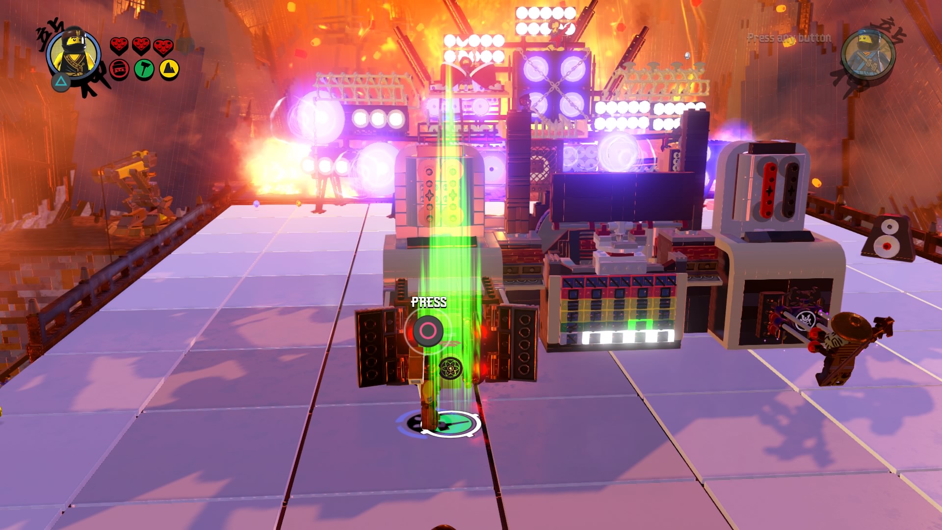 After that, lava rocks will fly from the sky and crash down onto the dance floor. Avoid the areas that turn red or you’ll get smashed. After three dodges, a pile of stuff will appear – Lloyd’s Green Spinjitzu allows him to combine multiple flowing green LEGO objects! Hold down [B / Circle] and move the cursor over all three objects.