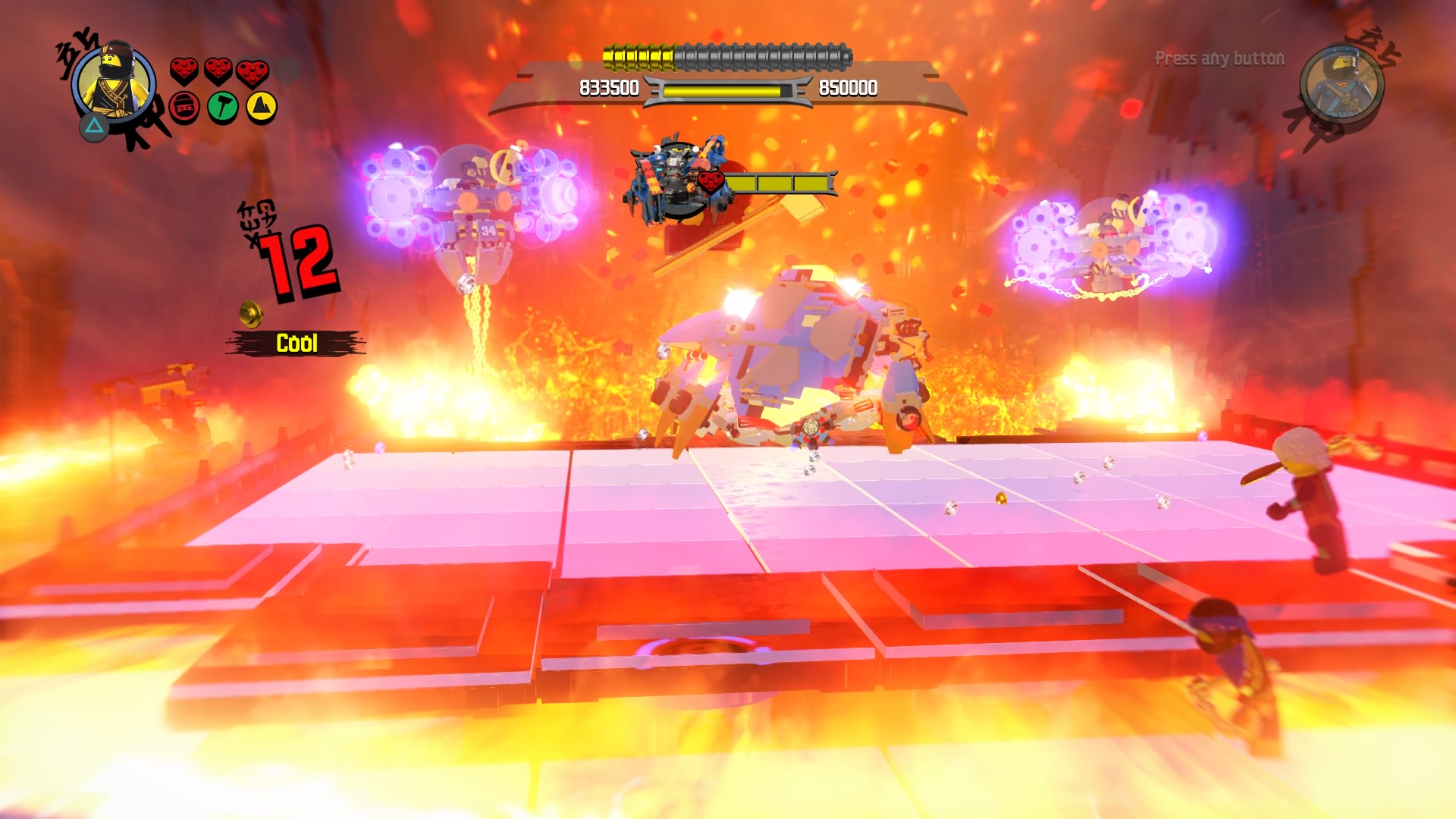 Defeat another group of enemies and the Mecha Crab will use a lava cannon! Stay far away to avoid the flamethrower. After two attacks, he’ll overheat and expose another generator. Blast it with Jay! Complete another round of goons, jump over more shockwave attacks, and the cracked LEGO shield will become vulnerable to Cole’s spinjitzu. Smash the shield to end the battle.