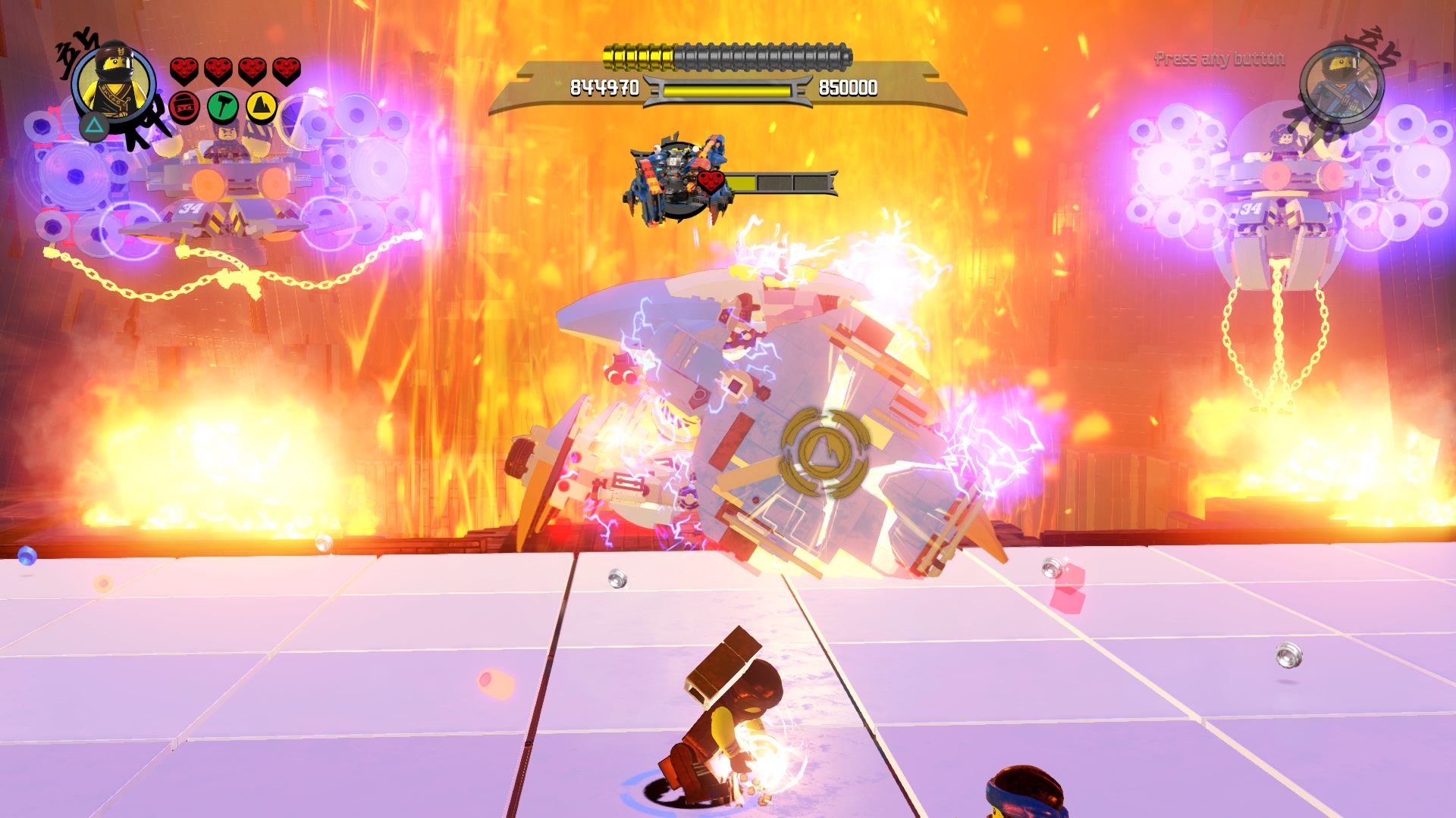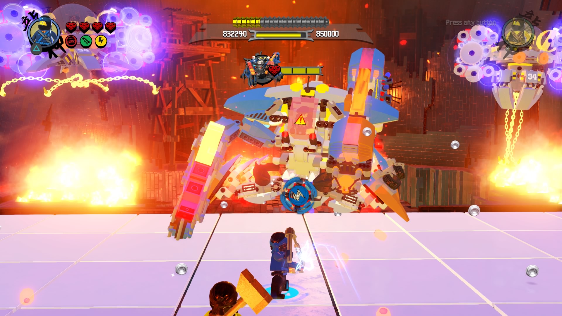 The Mech Crab is back for another round. Defeat his minions and avoid the ground-slam! The dance floor will turn red where he’ll land. When the enemies are defeated, the Mecha Crab will slam the ground four times. Jump over the shockwave, then use Jay to shoot the exposed generator with spinjitzu lightning.