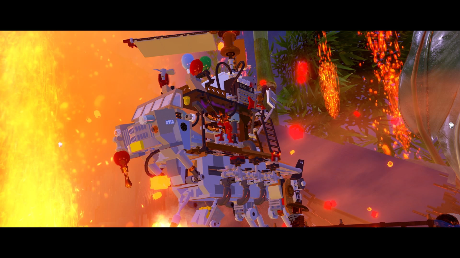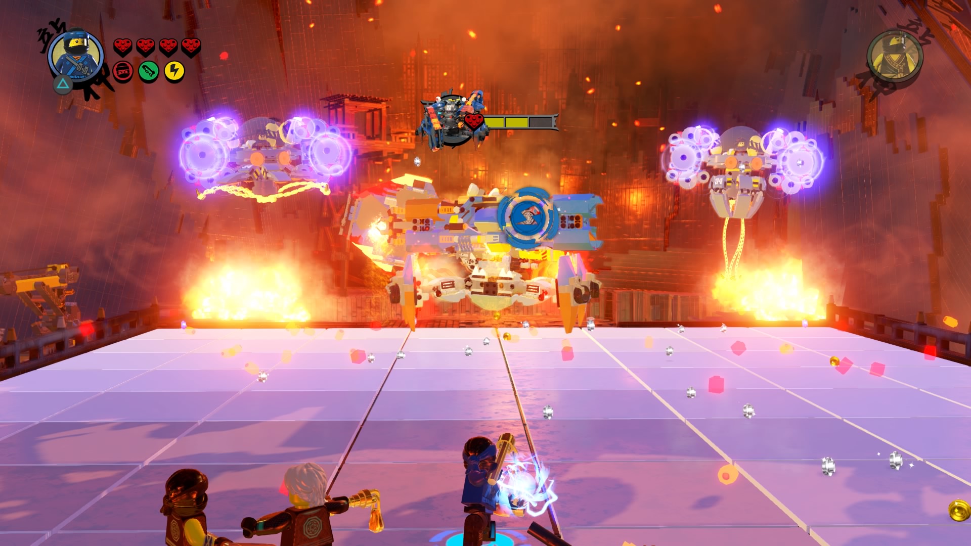 More goons will appear as lava rocks rain down. Smash all the goons you can, dodging red zones, until three green LEGO objects land in the arena. Use Lloyd’s spinjitzu to create another vehicle – an escape helicopter / blimp / thing. Hop on to escape!
